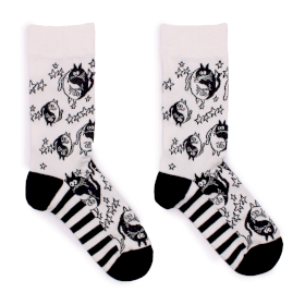 Skarpetki ze wzorem przedstawiającym koty maneki neko. Maneki neko to japońskie koty-amulety, często przedstawiane w pozycji siedzącej z podniesioną łapą. Uważa się, że przynoszą szczęście i dobrobyt.