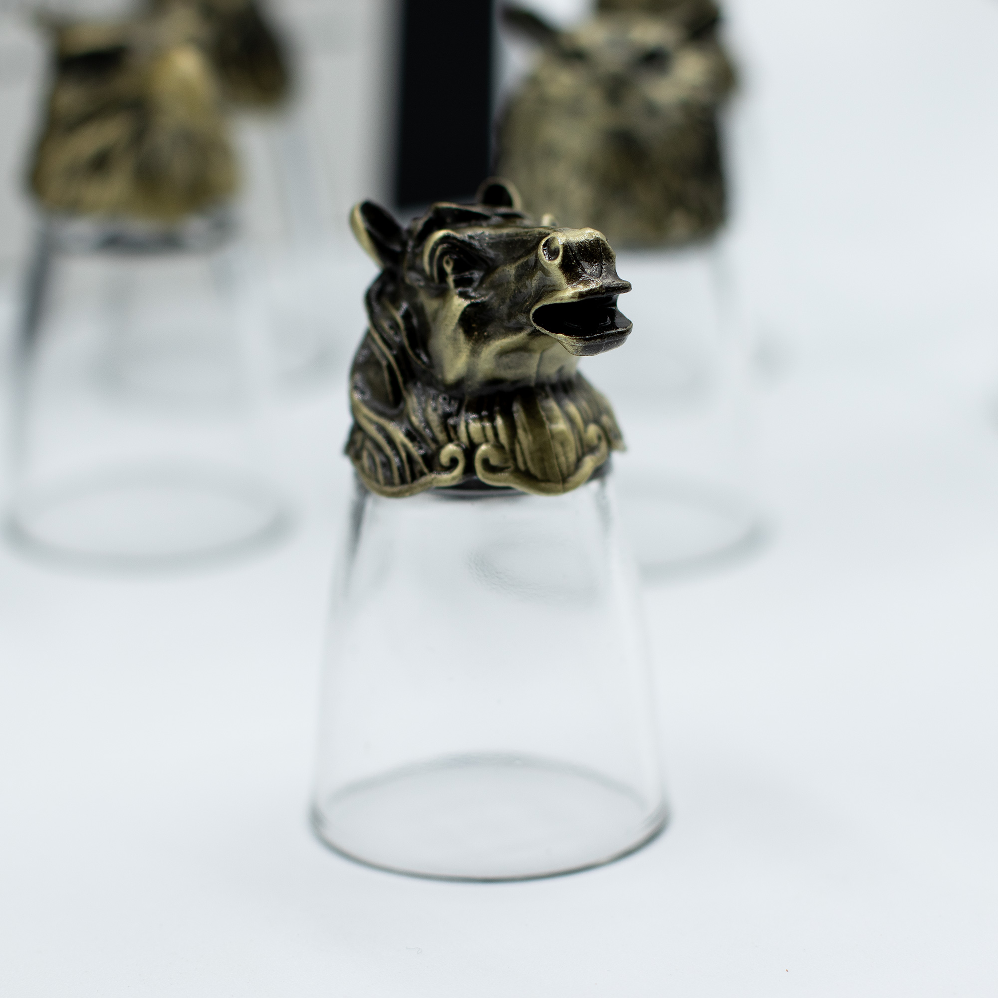 Po odwróceniu kieliszka ukazuje się misternie wyrzeźbiona głowa zwierzęcia lub mitycznej bestii – motywy inspirowane naturą, mitologią i symboliką Wschodu.