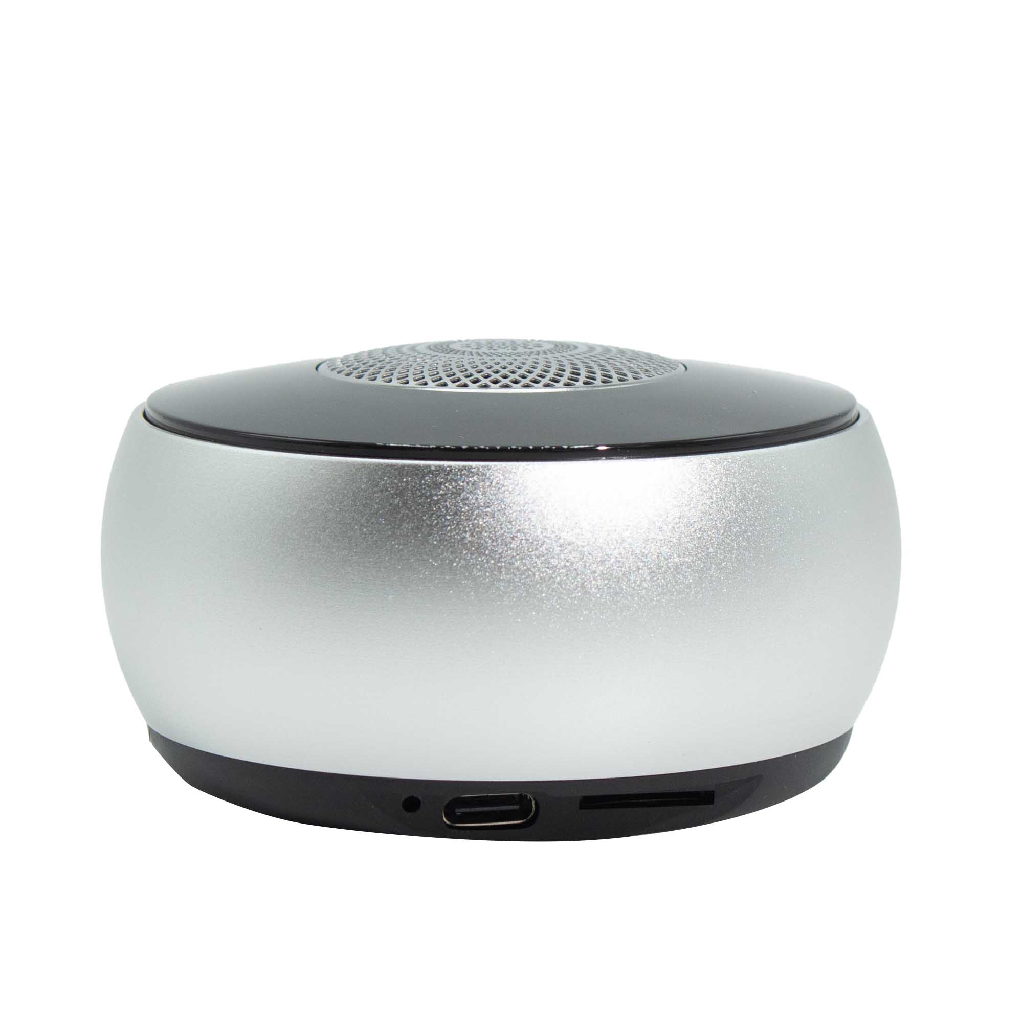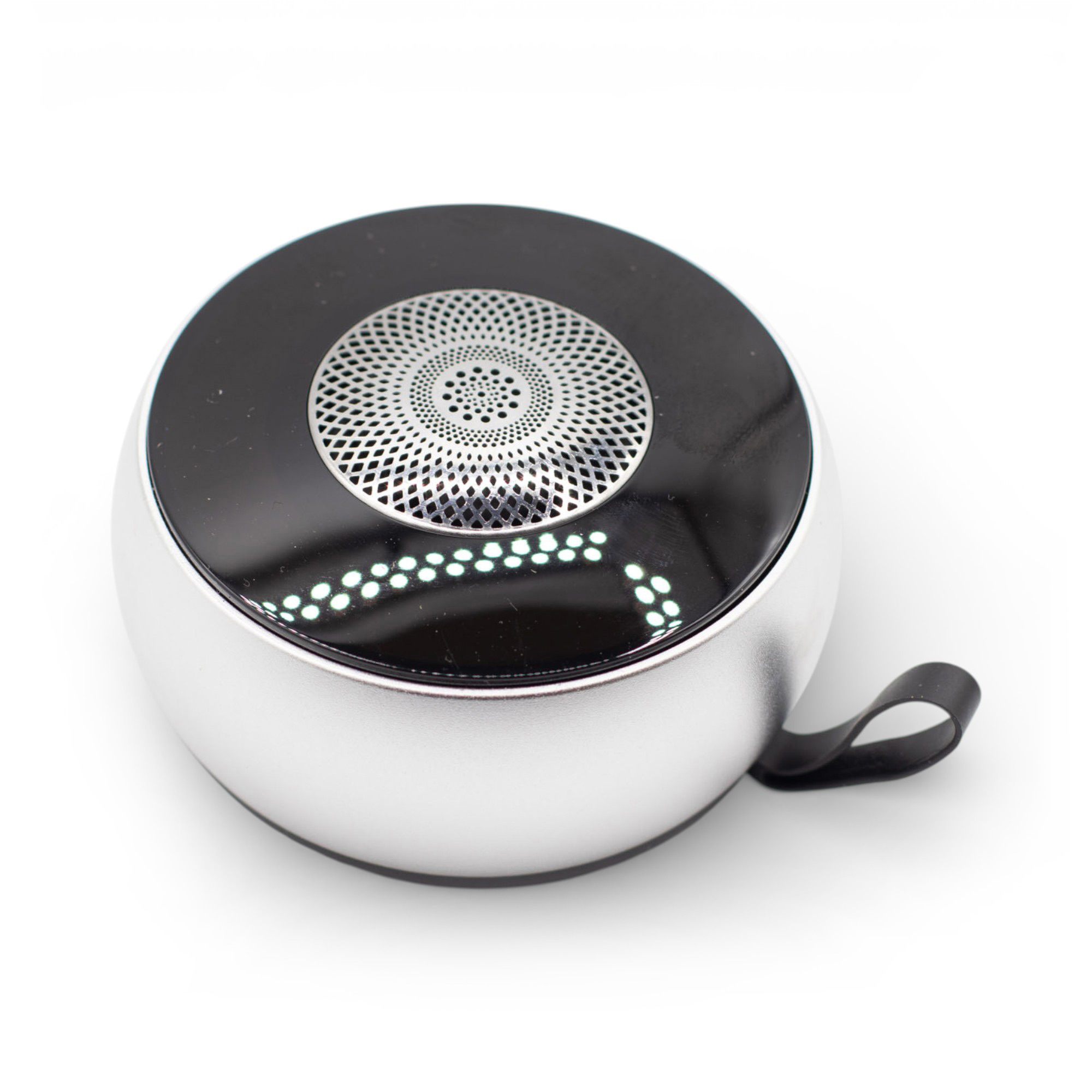 Srebrny Mini Głośnik ze Wzorem Mandali łączy kompaktowy dźwięk z nowoczesnym, eleganckim wykończeniem i subtelnym efektem świetlnym w stylu mandali. Tworzy przyjemną atmosferę, wprowadzając światło i dźwięk w codziennych przestrzeniach.