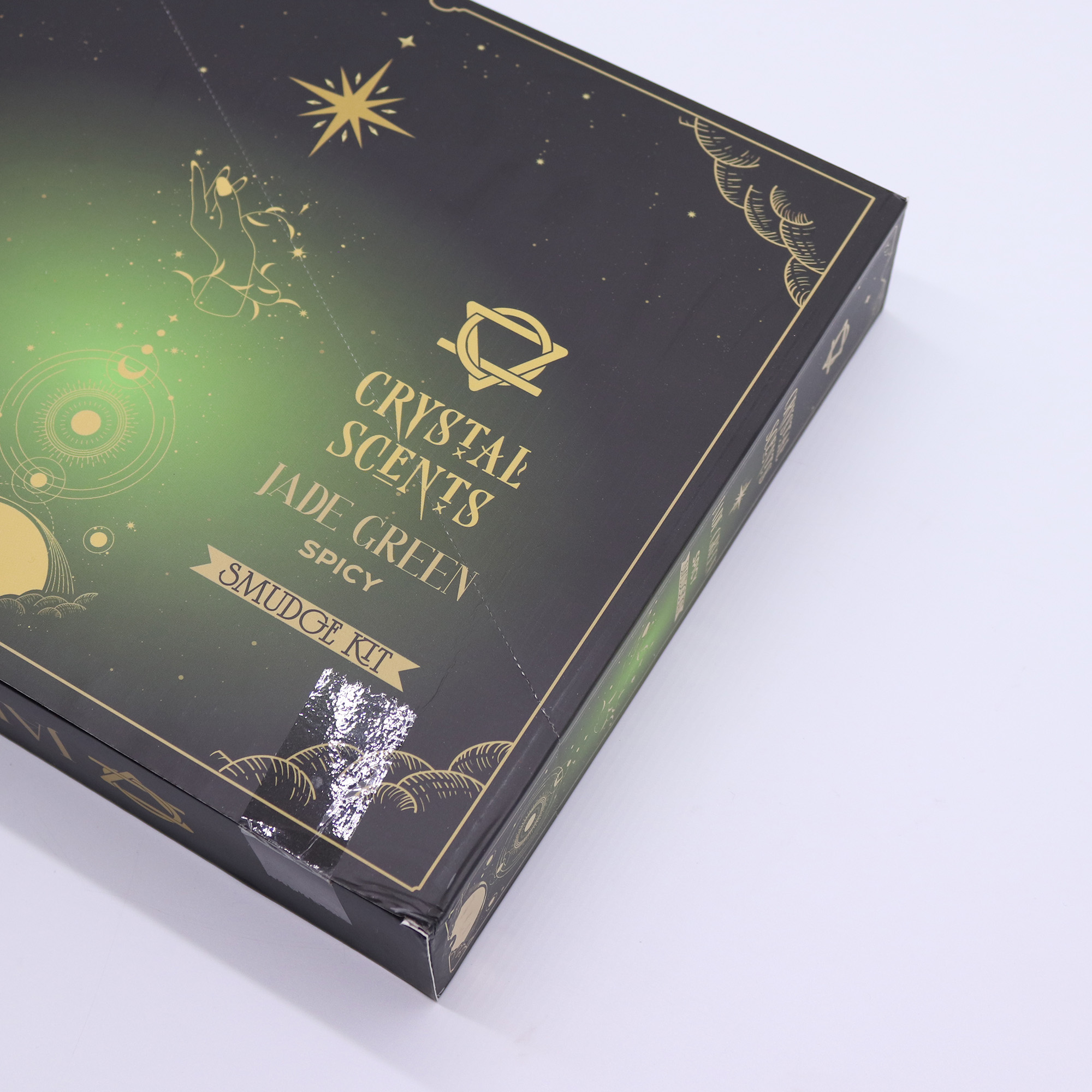 Zestaw 12 pudełeczek Kadzidełek Kryształowe Aromaty o pikantnym aromacie łączy wyrazisty, korzenny zapach z energetyzującą mocą jadeitu. Każde pudełeczko zawiera 10 ręcznie wykonanych kadzidełek typu smudge oraz jeden kryształ jadeitu, który może pełnić funkcję talizmanu lub być częścią codziennego rytuału.