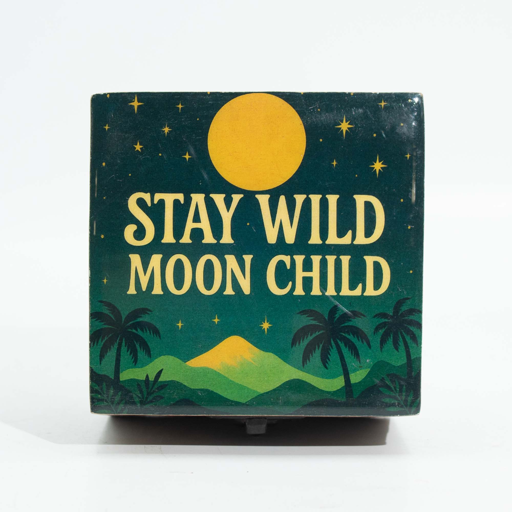 Największym atutem produktu jest emaliowana góra, prezentująca stylową grafikę z inspirującym hasłem „Stay Wild Moon Child”. Kompozycja w głębokich odcieniach zieleni i granatu, uzupełniona motywem księżyca, gwiazd oraz palm, przywodzi na myśl magiczne, tropikalne noce.