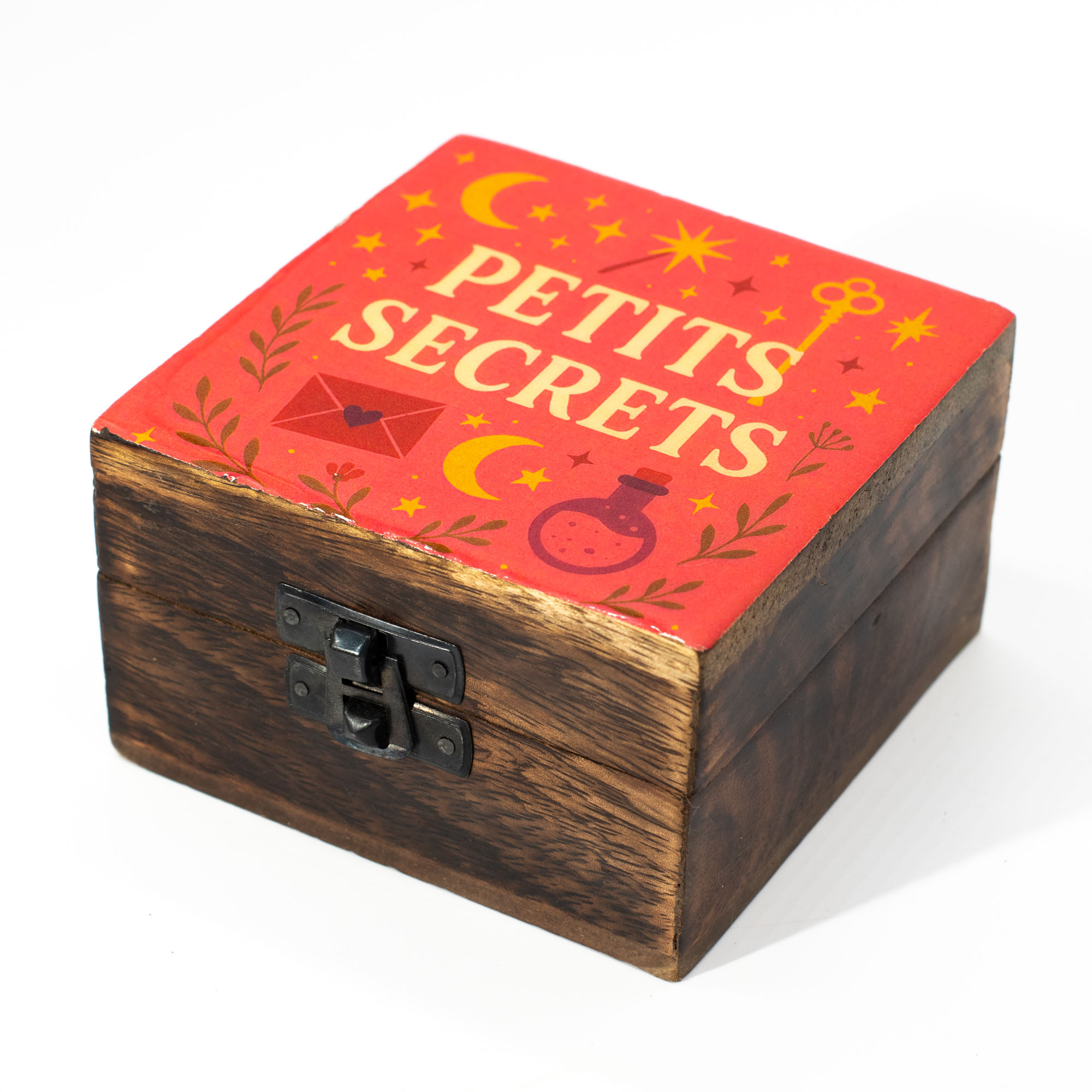 Design wieczka przyciąga wzrok ciepłą, koralową kolorystyką oraz napisem „Petits Secrets”, który nadaje mu romantycznego i intrygującego charakteru. Całość dopełniają subtelne ilustracje nawiązujące do świata magii i marzeń. Ta starannie dobrana symbolika sprawia, że pudełko idealnie wpisuje się w modny nurt przedmiotów sentymentalnych i ezoterycznych, które cieszą się ogromnym zainteresowaniem współczesnych konsumentów.