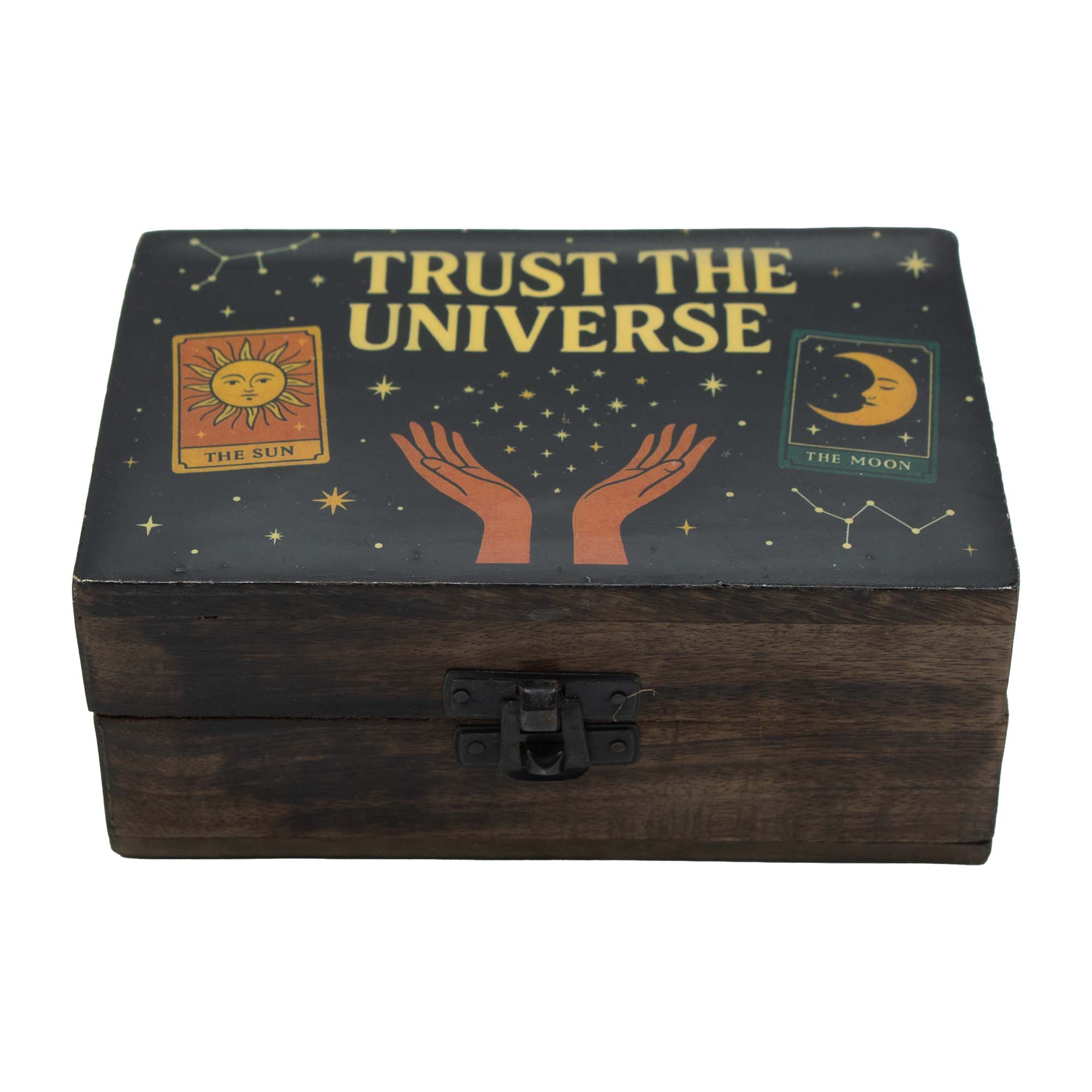 Wieczko pudełka to artystyczna kompozycja utrzymana w mistycznym klimacie, która zachęca do zaufania własnej intuicji i siłom wszechświata. Centralny punkt stanowi inspirujący napis „Trust the Universe”, pod którym widnieją dłonie w geście otwartości na to, co niesie los.