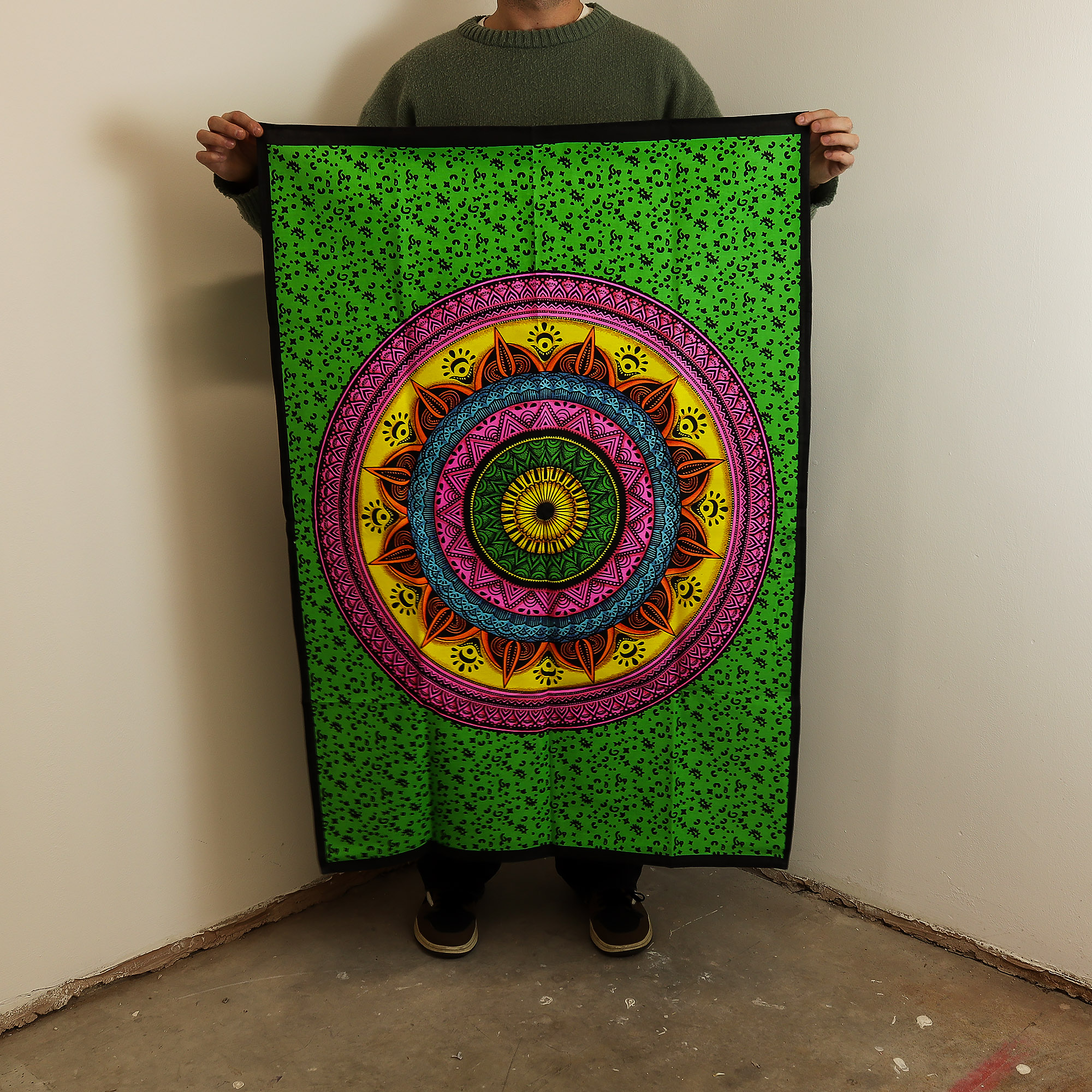 Dekoracyjna tkanina ścienna wykonana z wysokiej jakości bawełny, przedstawiająca kolorową, dynamiczną mandalę. Intensywne barwy i precyzyjny nadruk tworzą efektowną, harmonijną kompozycję, która przyciąga uwagę i wprowadza do wnętrza energetyczny, artystyczny klimat.