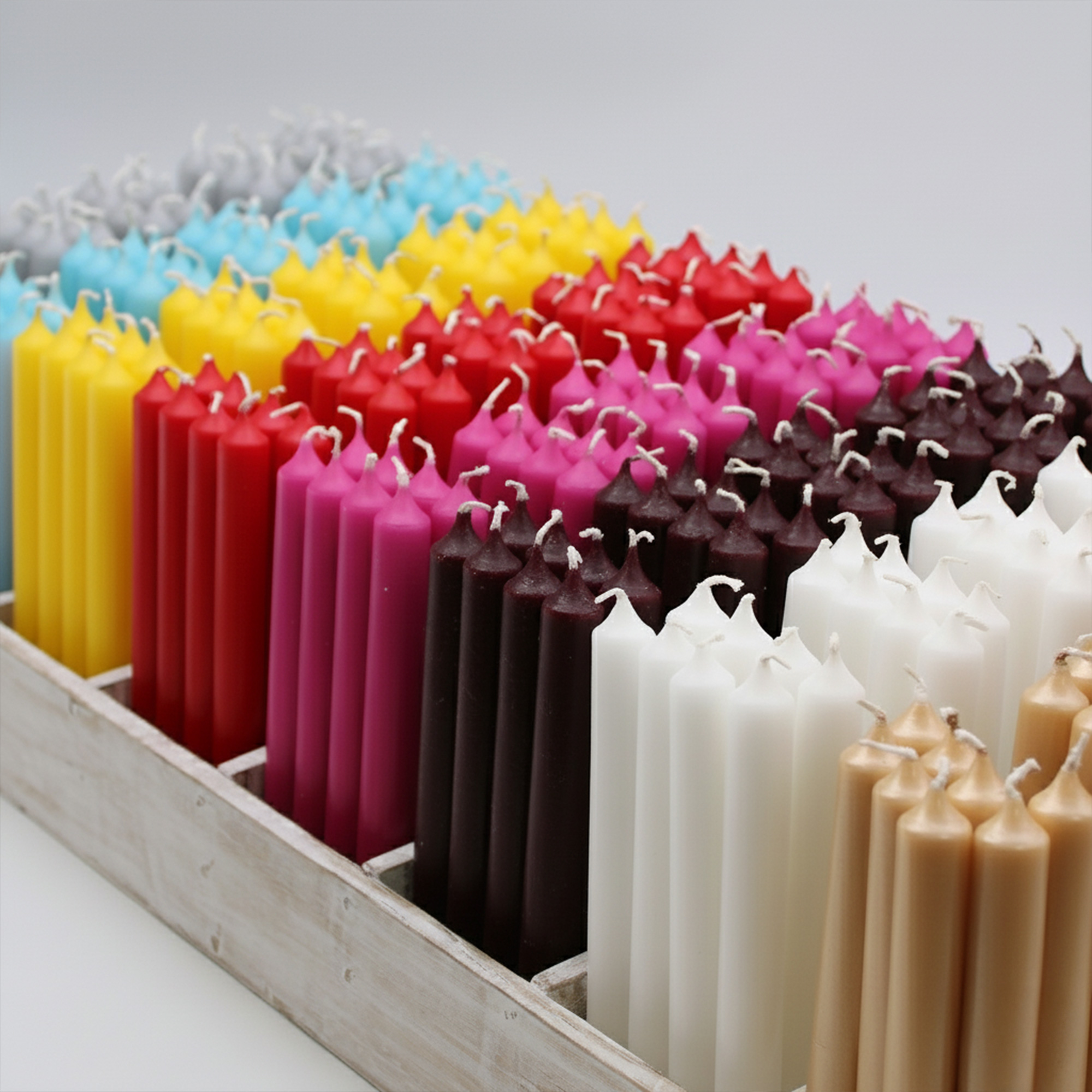 Otrzymasz 700 świec stołowych w różnych kolorach + 100 świec GRATIS! Dodatkowo dokładamy też DARMOWĄ tacę ekspozycyjną z 40 przegródkami, solidną i estetyczną, idealną do prezentacji świec.