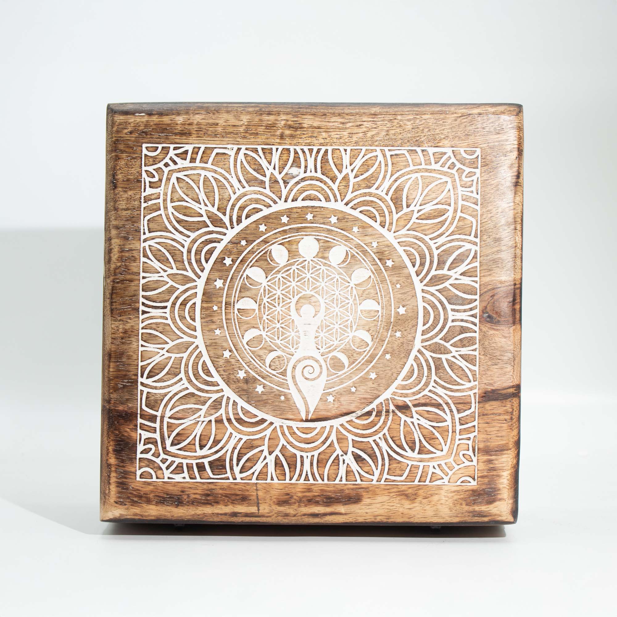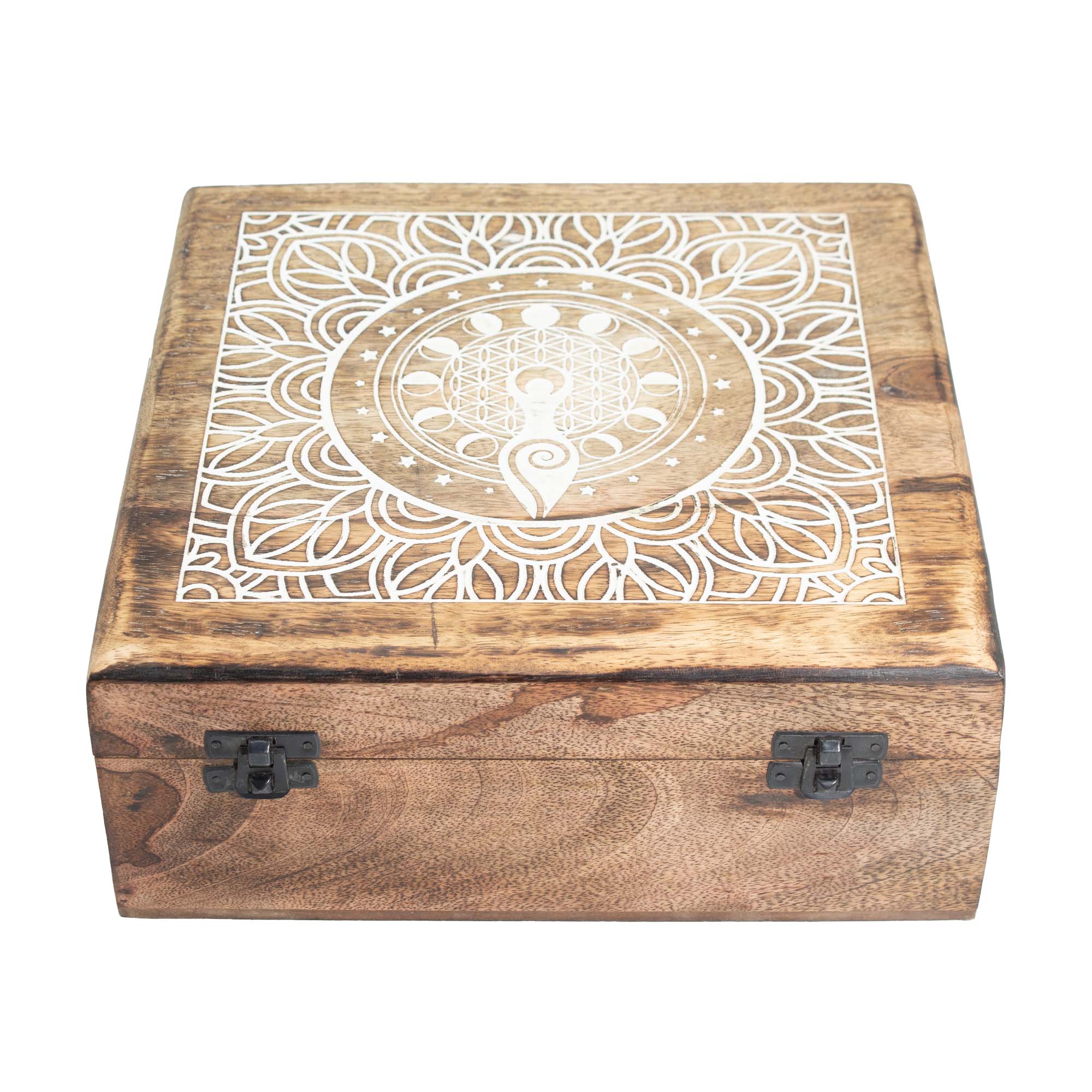 To imponujące rozmiarem pudełko z drewna mango stanowi idealne połączenie funkcjonalnego magazynowania z mistycznym wzornictwem, które cieszy się niesłabnącą popularnością w segmencie artykułów dekoracyjnych i ezoterycznych. Centralnym punktem projektu jest misternie wygrawerowany symbol Bogini Księżyca i faz księżyca, co nadaje produktowi unikalny, duchowy charakter. Białe wypełnienie detali znakomicie eksponuje precyzję rzeźbienia na tle głębokich, naturalnych słojów drewna, tworząc produkt o wysokiej estetyce wizualnej.