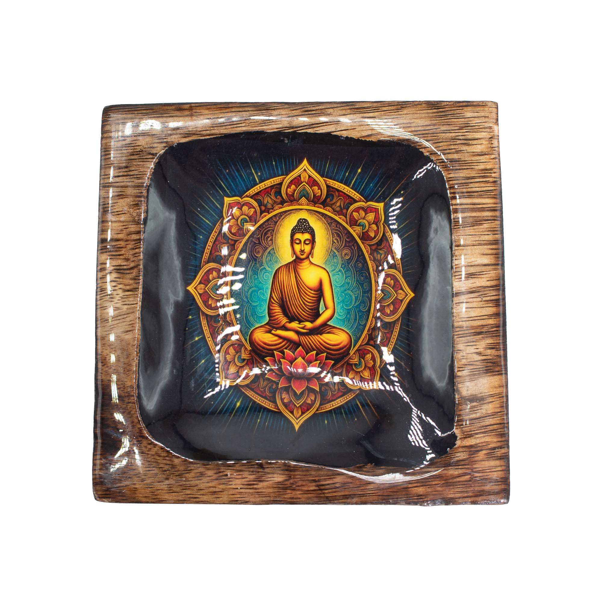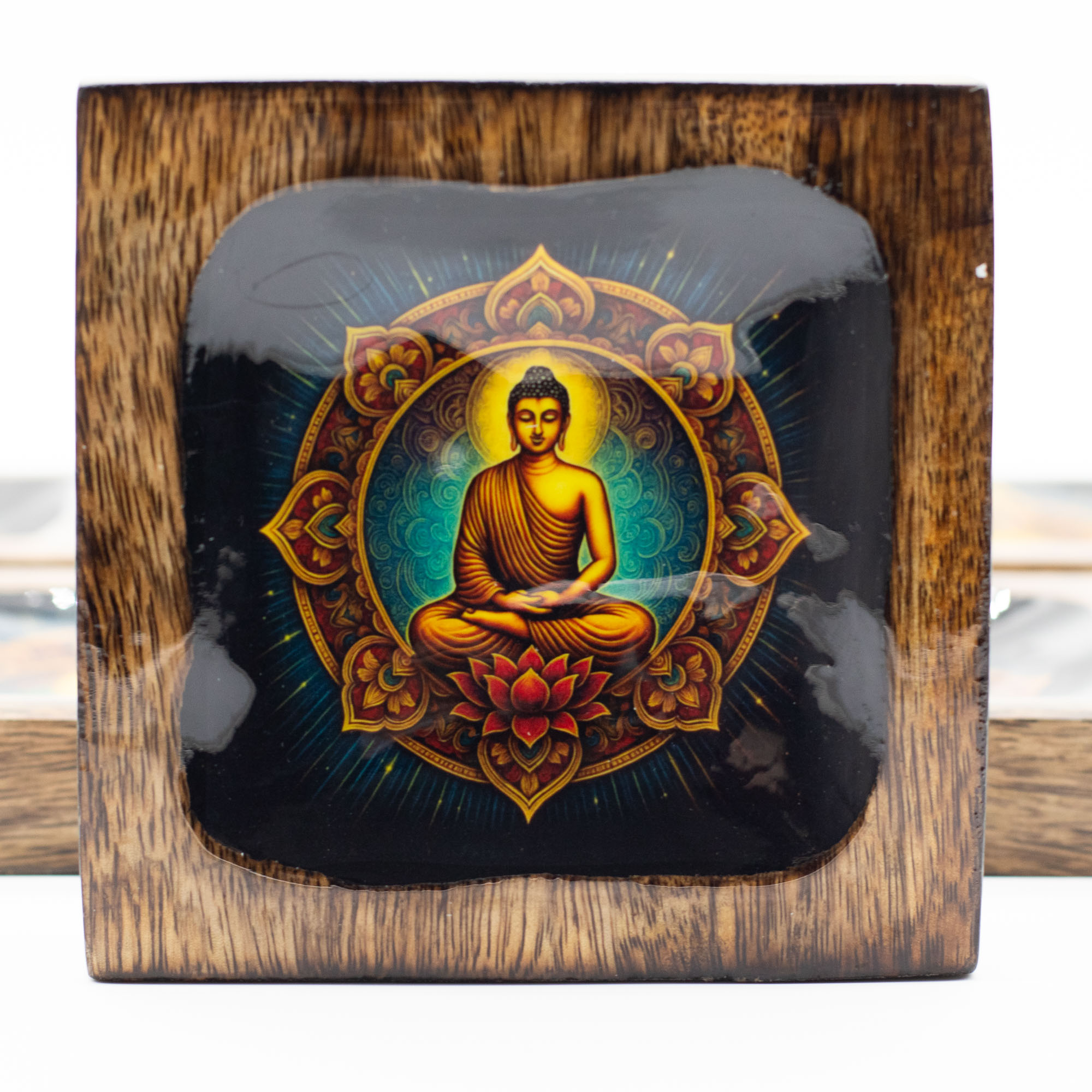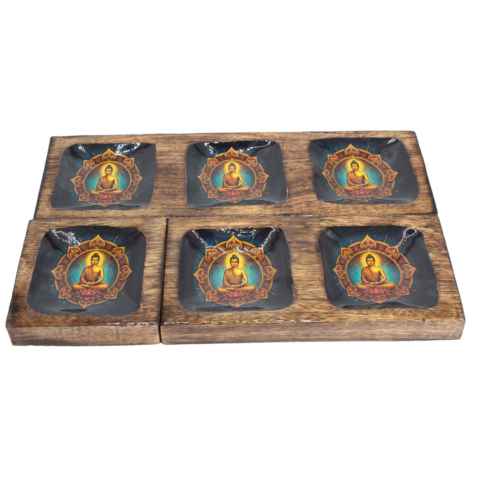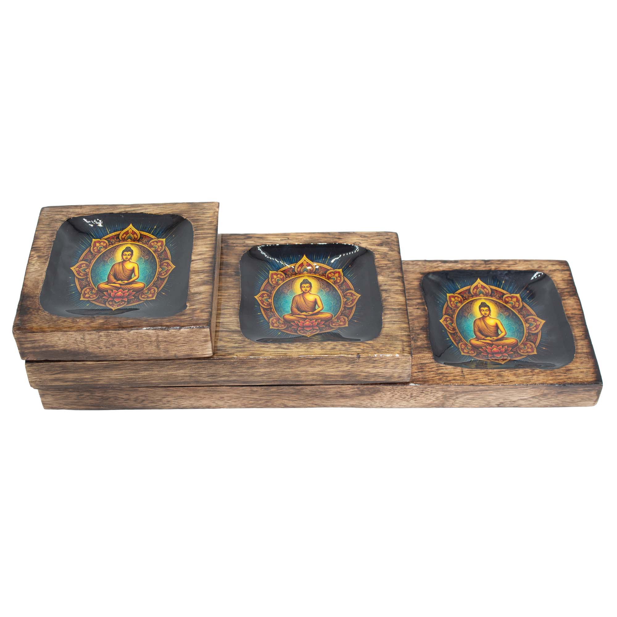 Ten rozbudowany zestaw tac z litego drewna mango to propozycja dla wymagających detalistów, którzy poszukują przedmiotów łączących szlachetne materiały z bogatą symboliką Wschodu. Komplet składa się z trzech tac w różnych rozmiarach, oferujących 1, 2 i 3 pola. Wnętrza tac zostały wykończone wysokiej jakości emalią z wizerunkiem medytującego Buddy w otoczeniu mandali, utrzymanej w nasyconych odcieniach złota i błękitu.
