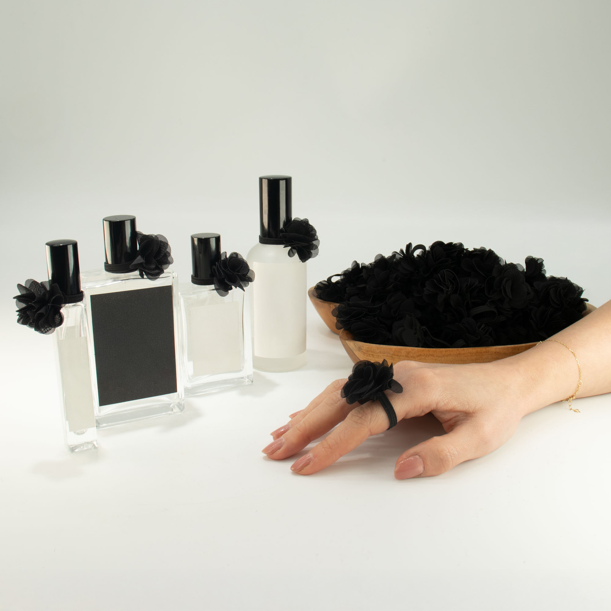 Zestaw stu sztuk pierścionków dyfuzorów w kolorze głębokiej czerni to absolutny klasyk, który cieszy się największą popularnością wśród hurtowni oraz prestiżowych punktów sprzedaży. Każdy pierścionek składa się z misternie ułożonego, wielowarstwowego kwiatu z szyfonu, osadzonego na elastycznej, czarnej gumce. Czarna barwa nadaje akcesorium nowoczesny, minimalistyczny charakter, sprawiając, że pasuje ono do każdego typu garderoby i jest chętnie wybierane przez klientów szukających dyskretnych, a zarazem stylowych dodatków.