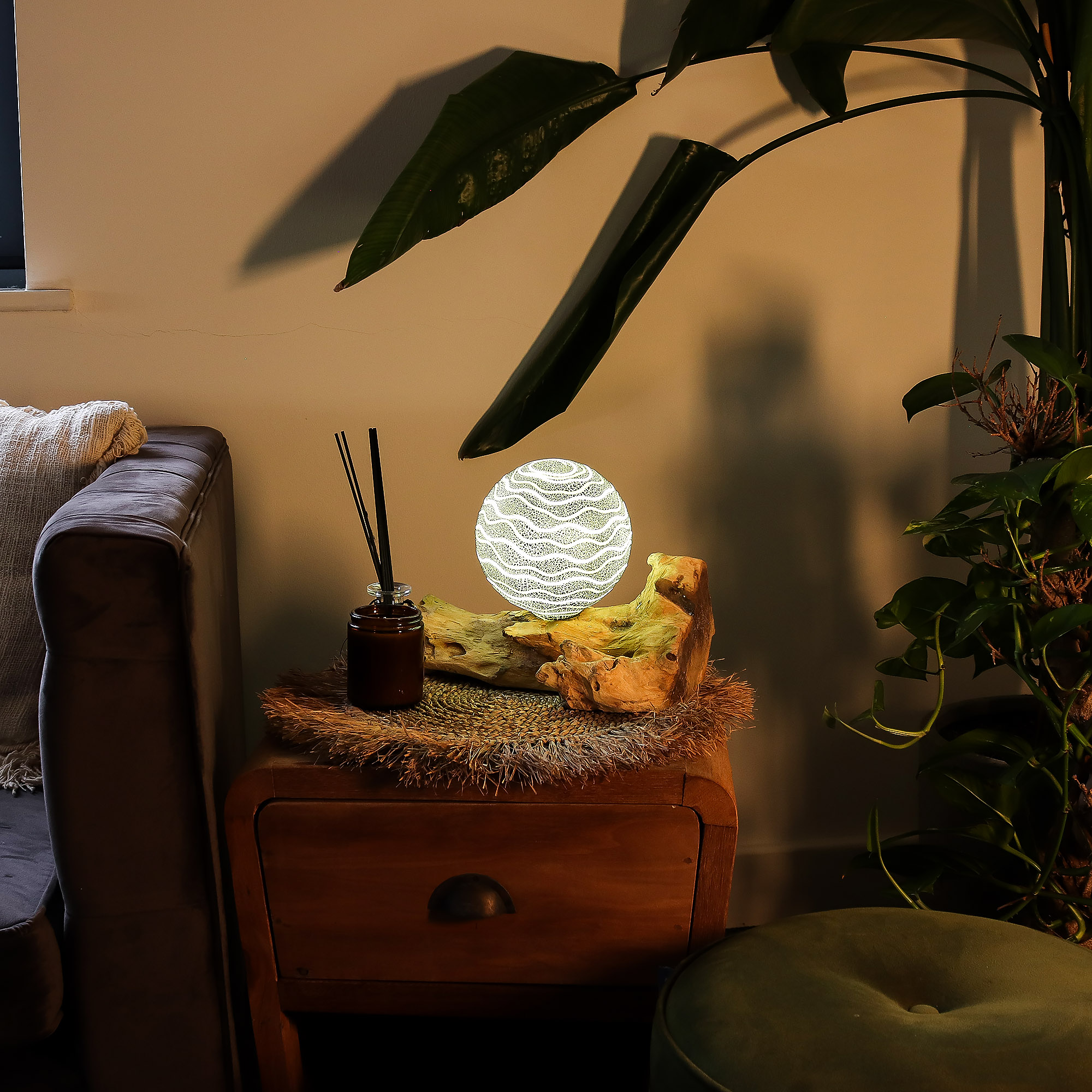 Klosz osadzony jest na masywnej podstawie z naturalnego indonezyjskiego drewna dryfującego – każdy element ma własny układ słojów, wgłębień i organicznych form. To połączenie sprawia, że każda lampa jest niepowtarzalna i świetnie prezentuje się w aranżacjach inspirowanych naturą, rzemiosłem oraz wnętrzami butikowymi.