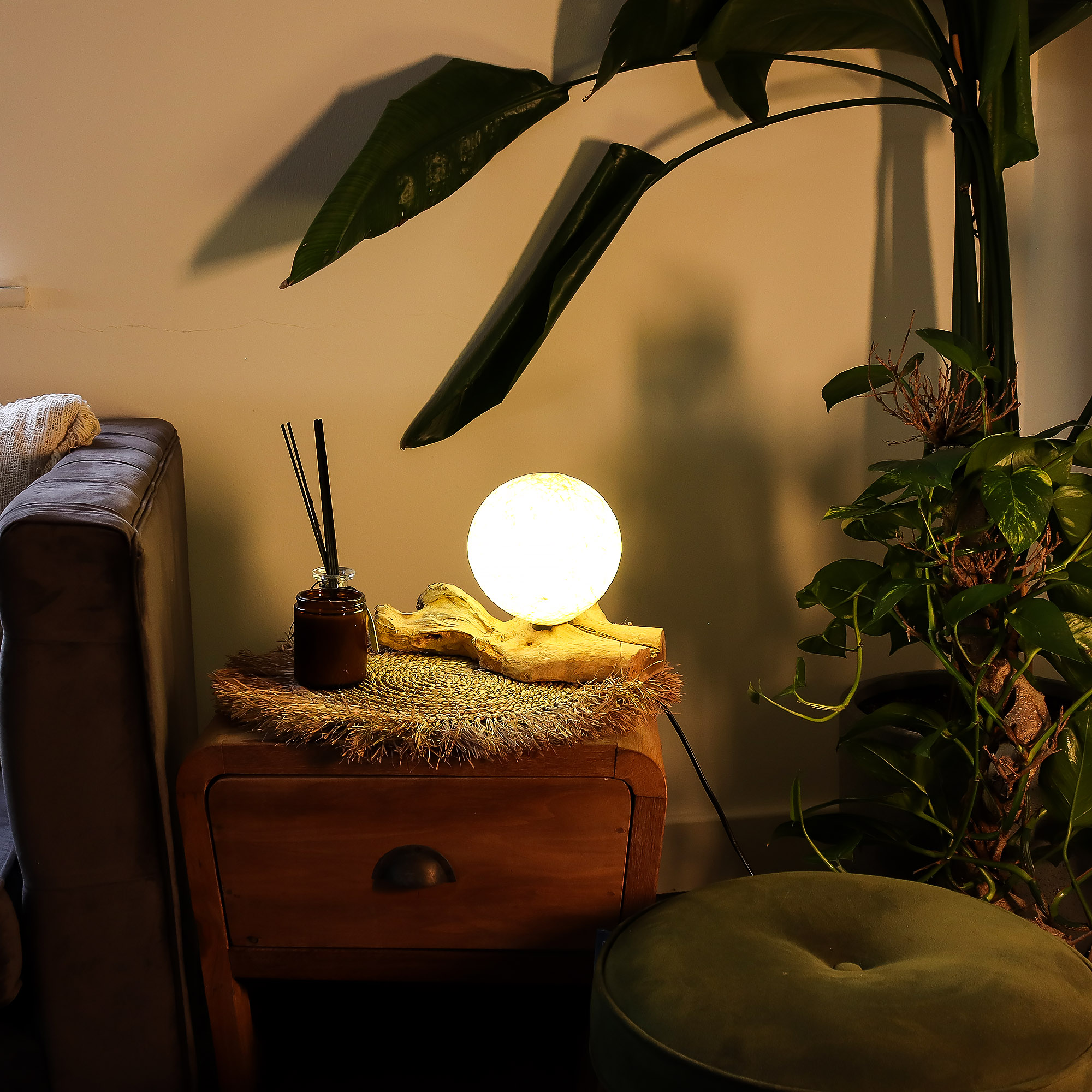 Lampa osadzona jest na podstawie z autentycznego indonezyjskiego drewna dryfującego – każdy produkt jest jedyny w swoim rodzaju, dzięki naturalnym wgłębieniom, nieregularnym liniom i organicznym kształtom. To sprawia, że lampa prezentuje się jak unikatowa dekoracja, świetnie eksponująca się w przestrzeniach domowych, butikach oraz aranżacjach wellness.