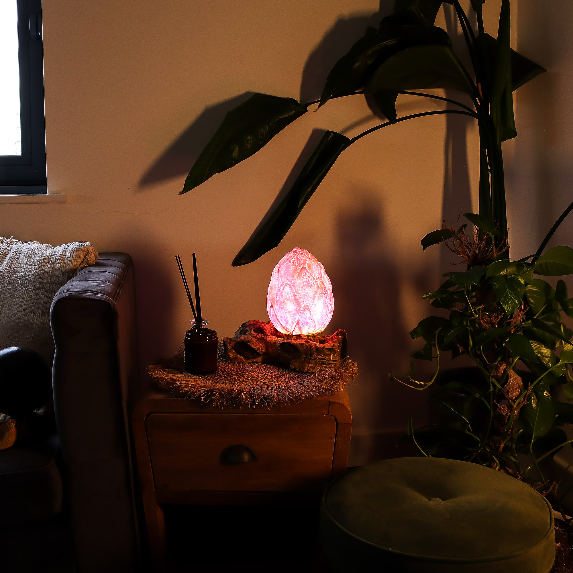 Klosz osadzono na naturalnej podstawie z indonezyjskiego drewna dryfującego. Każdy element drewna ma unikalny układ słojów, naturalne wgłębienia i organiczne kształty, dzięki czemu każda lampa jest jedynym w swoim rodzaju egzemplarzem. To idealny produkt dla klientów ceniących oryginalność i dekoracje inspirowane naturą.