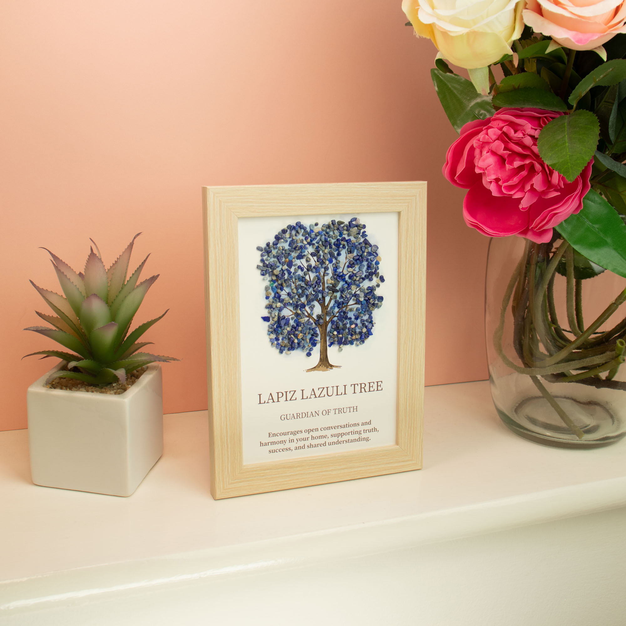 Jako symboliczny Stróż Prawdy, obraz z lapisem lazuli ma za zadanie wspierać autentyczność, jasność przekazu i głębokie porozumienie w domowym zaciszu. Od tysiącleci kamień ten jest uznawany za symbol mądrości, który sprzyja otwartej komunikacji i budowaniu relacji opartych na szczerości oraz wzajemnym szacunku. Jego obecność w domu zachęca do dzielenia się myślami i wspiera harmonię, pomagając domownikom w osiągnięciu wspólnego zrozumienia i życiowego sukcesu opartego na prawdzie.