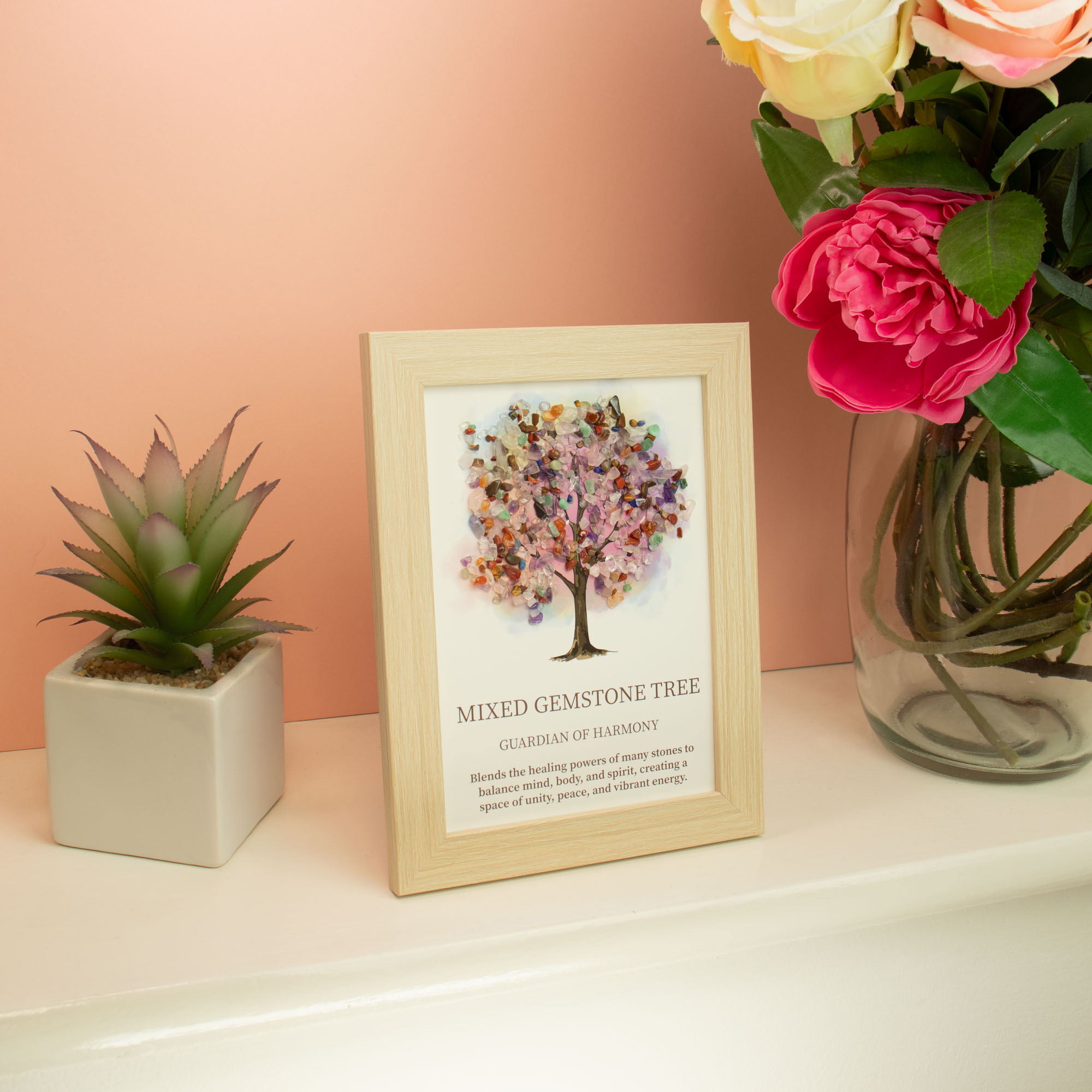 Obraz z Drzewkiem z Mixu Kamieni to najbardziej barwna i wielowymiarowa propozycja w całej kolekcji, stanowiąca radosną kulminację serii. Korona drzewa to kunsztowna mozaika wykonana z różnorodnych minerałów, które łączą w sobie bogactwo kolorów, faktur i energii natury. Dzięki wykorzystaniu wielu rodzajów kamieni, każda kompozycja jest małym dziełem sztuki o unikalnym układzie barw, od soczystych zieleni i głębokich błękitów, po słoneczne żółcie i delikatne róże. Całość oprawiona w jasną, elegancką ramę o strukturze drewna tworzy dekorację niezwykle dynamiczną, a jednocześnie pełną estetycznego ładu.