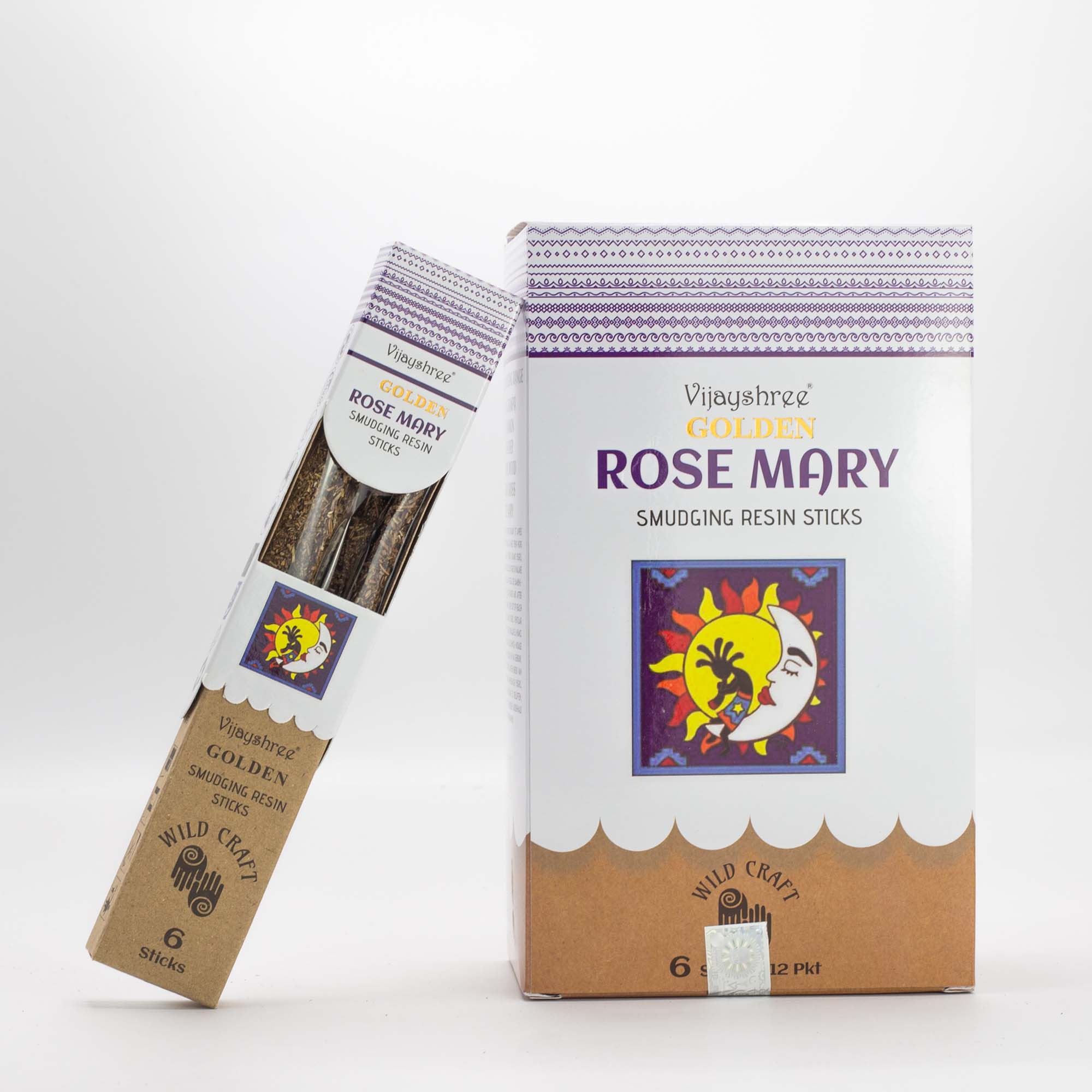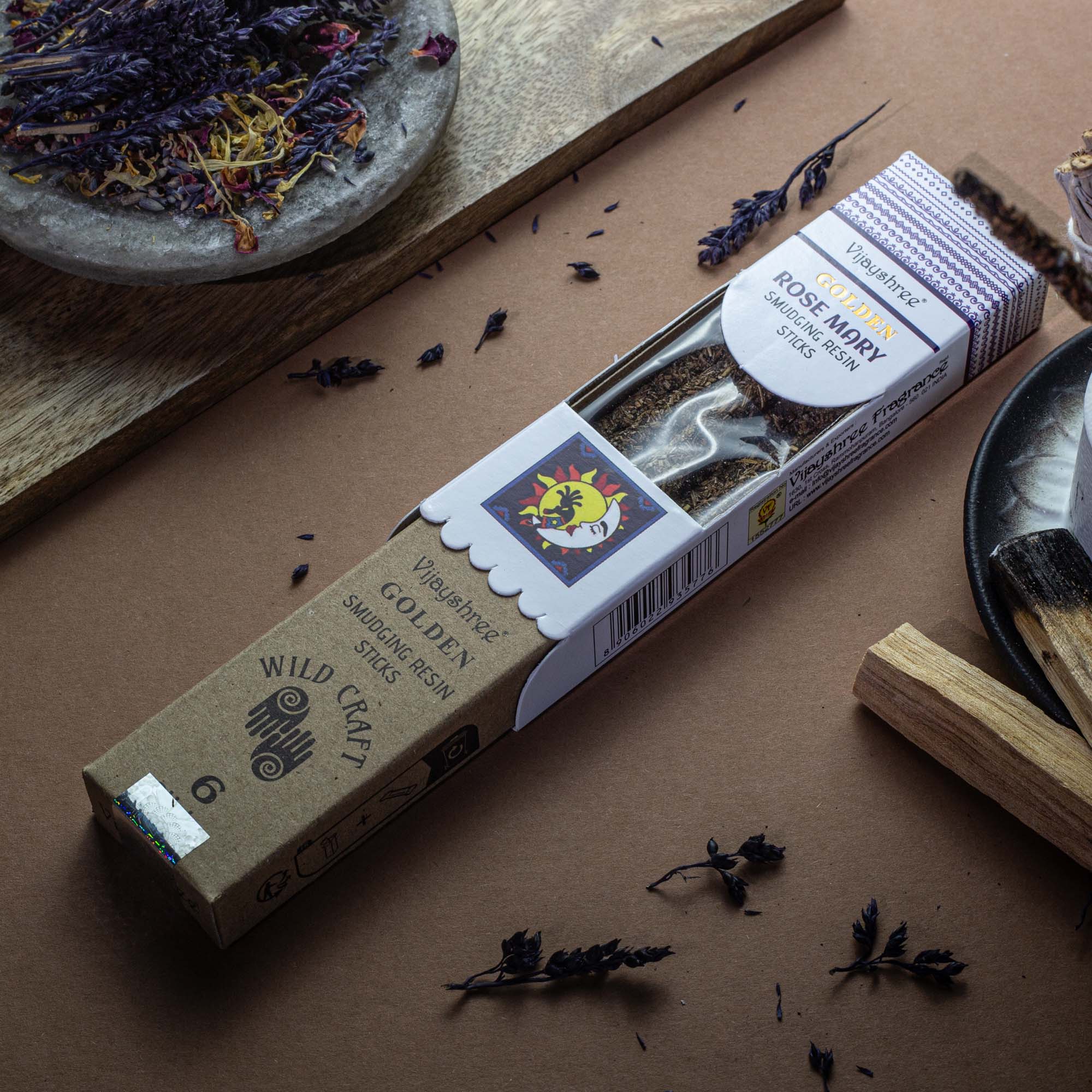 Żywice Rytualne na Patyczkach Golden – Rozmaryn to energetyzująca kompozycja o świeżym, ziołowym aromacie, który kojarzy się z czystością i odświeżeniem przestrzeni. Ręcznie formowane patyczki z naturalnych żywic łączą tradycyjne rytuały oczyszczania z wygodną formą użytkowania, uwalniając podczas spalania intensywny i naturalny zapach.