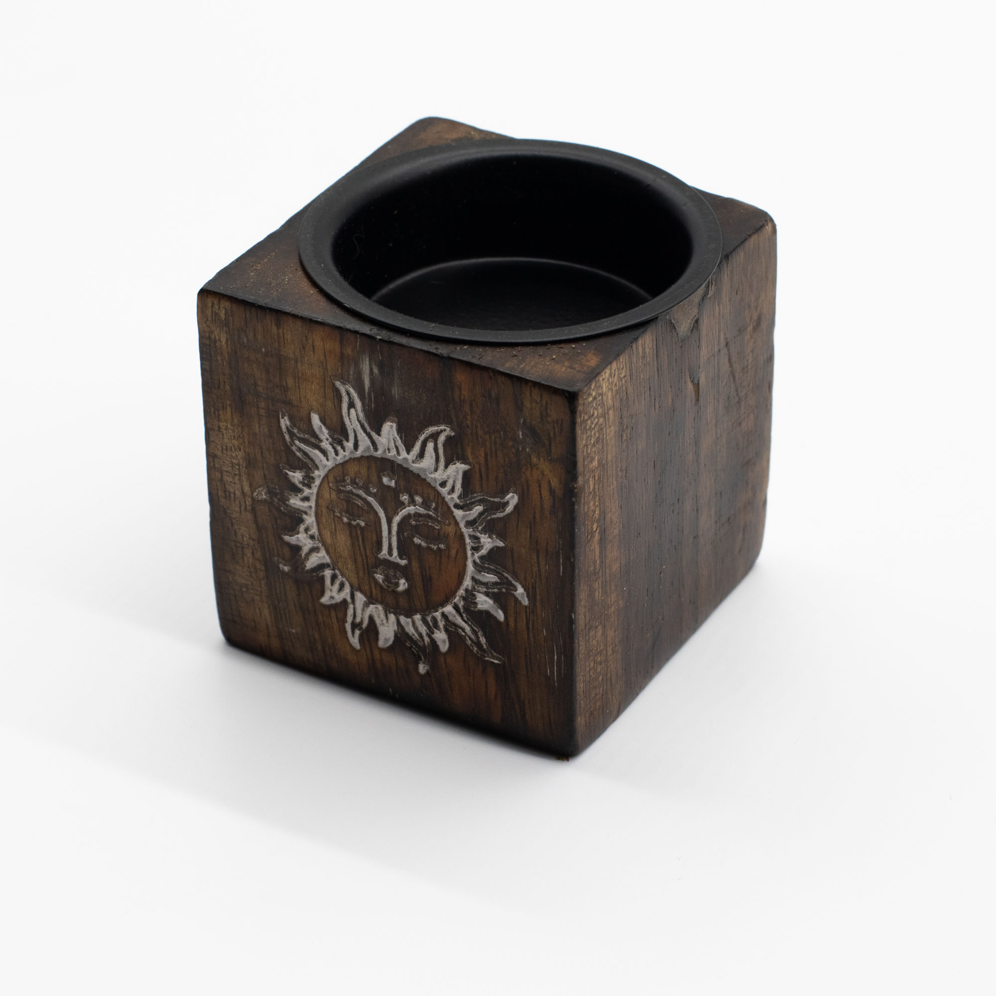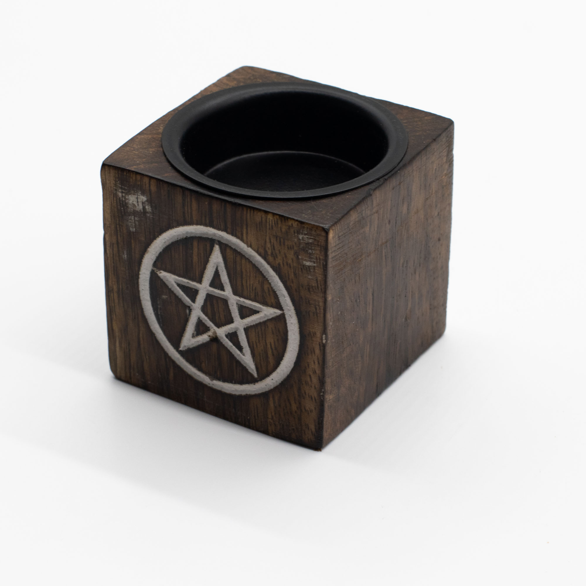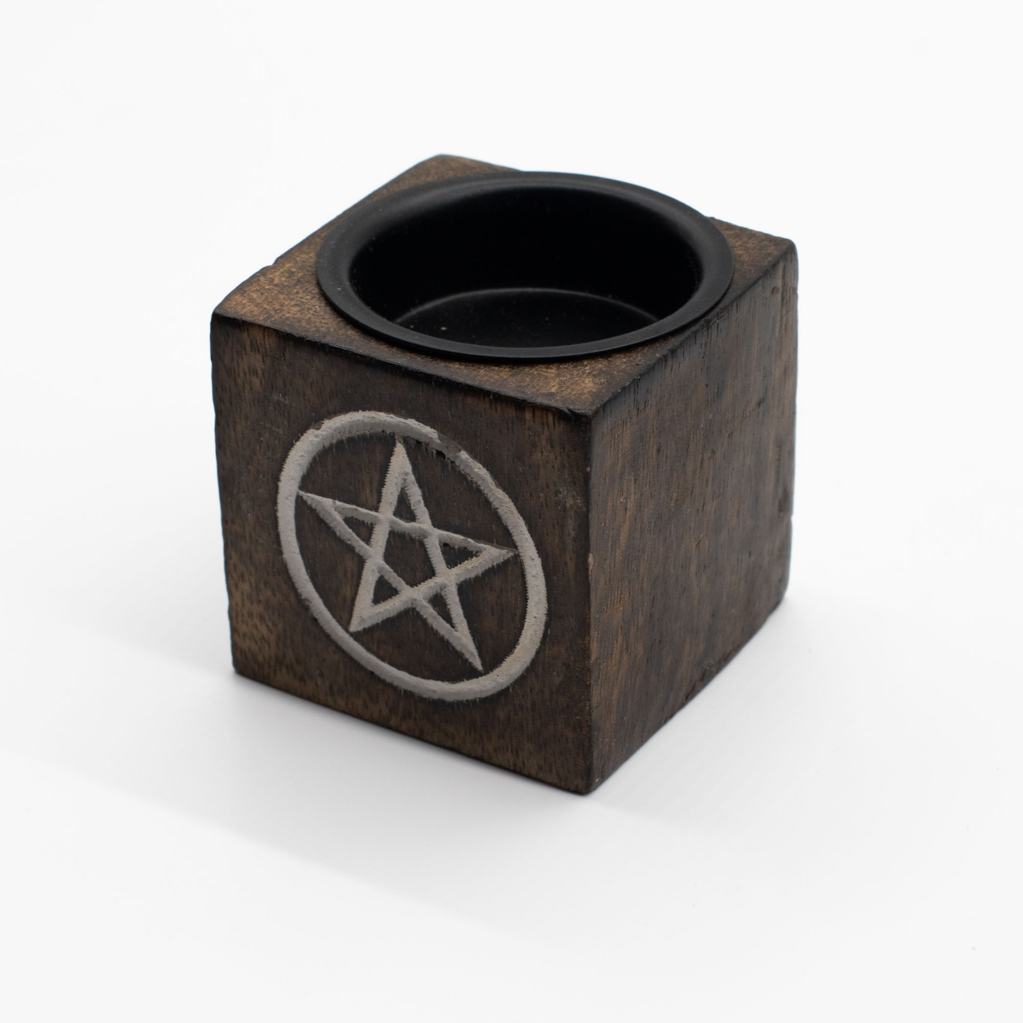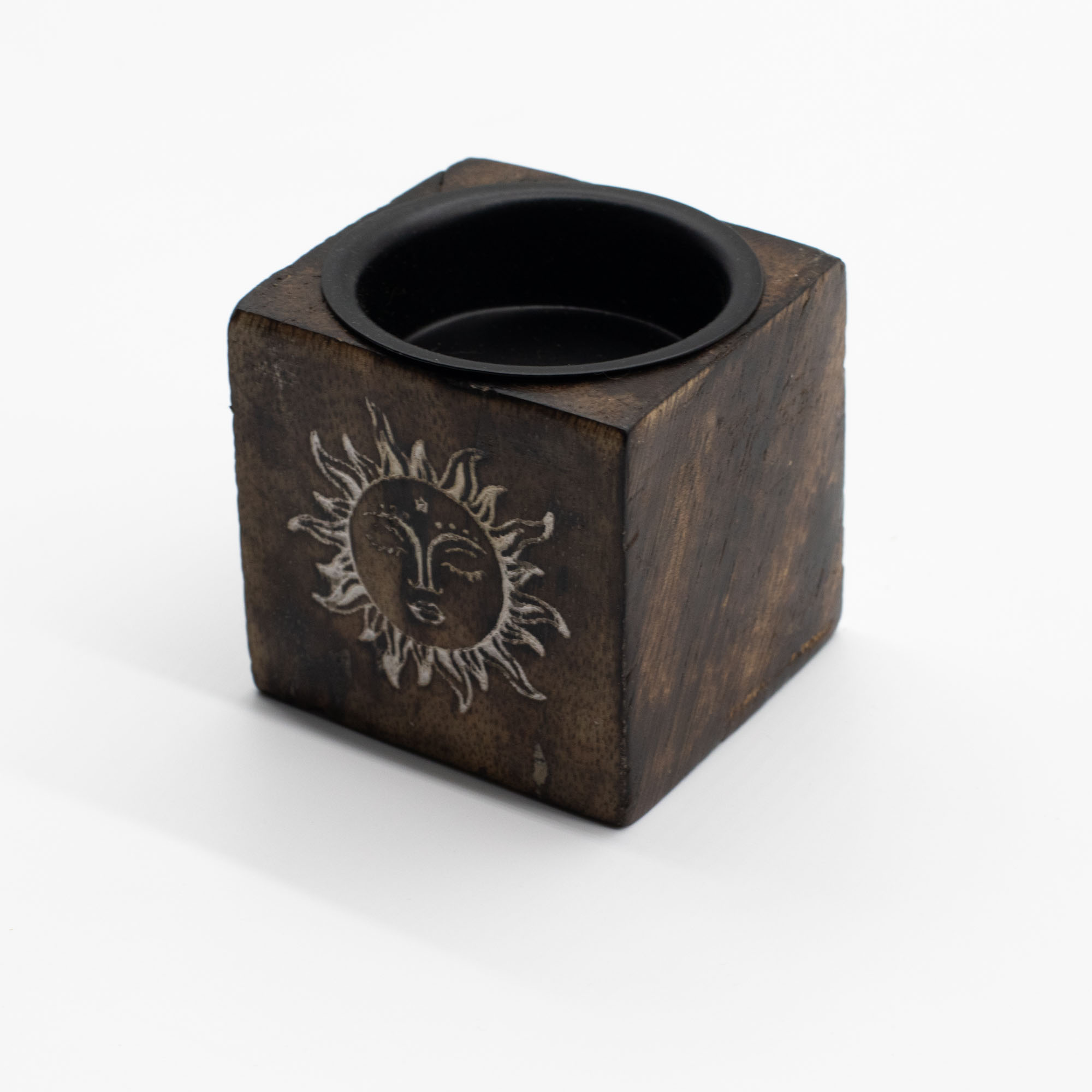 Ta multifunkcyjna podstawka z drewna mango to produkt stworzony z myślą o sklepach oferujących akcesoria ezoteryczne i dekoracje w klimacie magicznym. Kompaktowy sześcian o wymiarach 5x5x5 cm został ozdobiony wyrazistymi, białymi grawerami nawiązującymi do symboliki czarodziejstwa, takimi jak pentagram, czaszka, potrójny księżyc czy słońce. Dzięki solidnemu, metalowemu wkładowi, kostka służy jako stabilny świecznik na podgrzewacze typu tealight lub bezpieczna podstawka pod kadzidełka stożkowe.