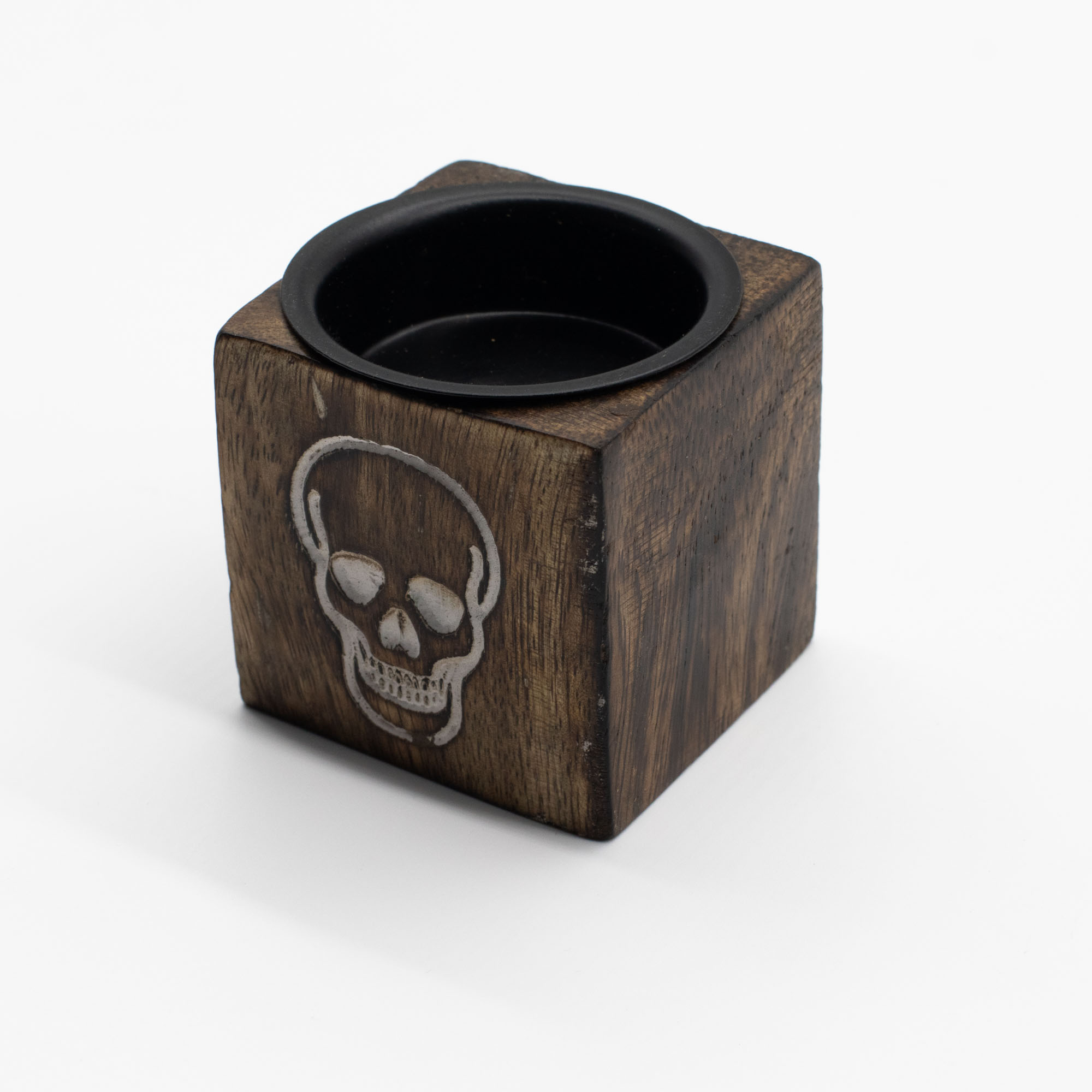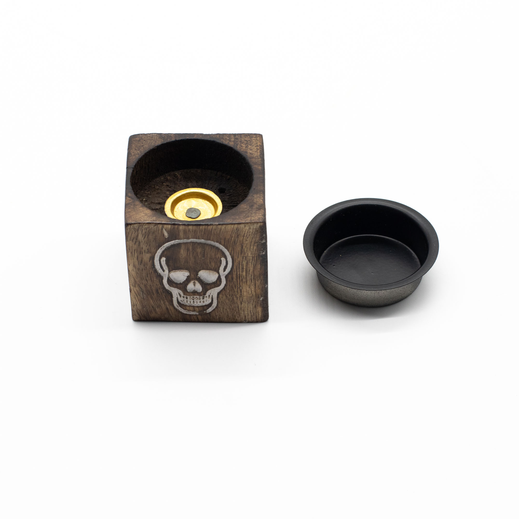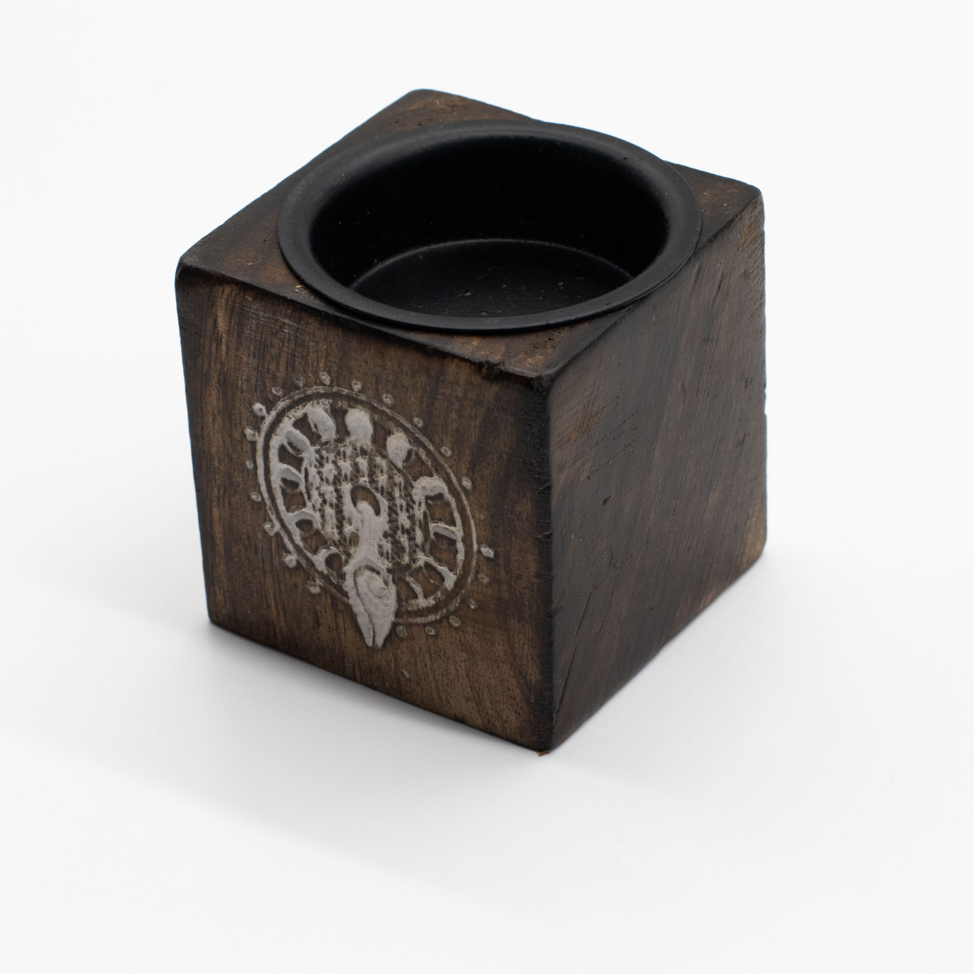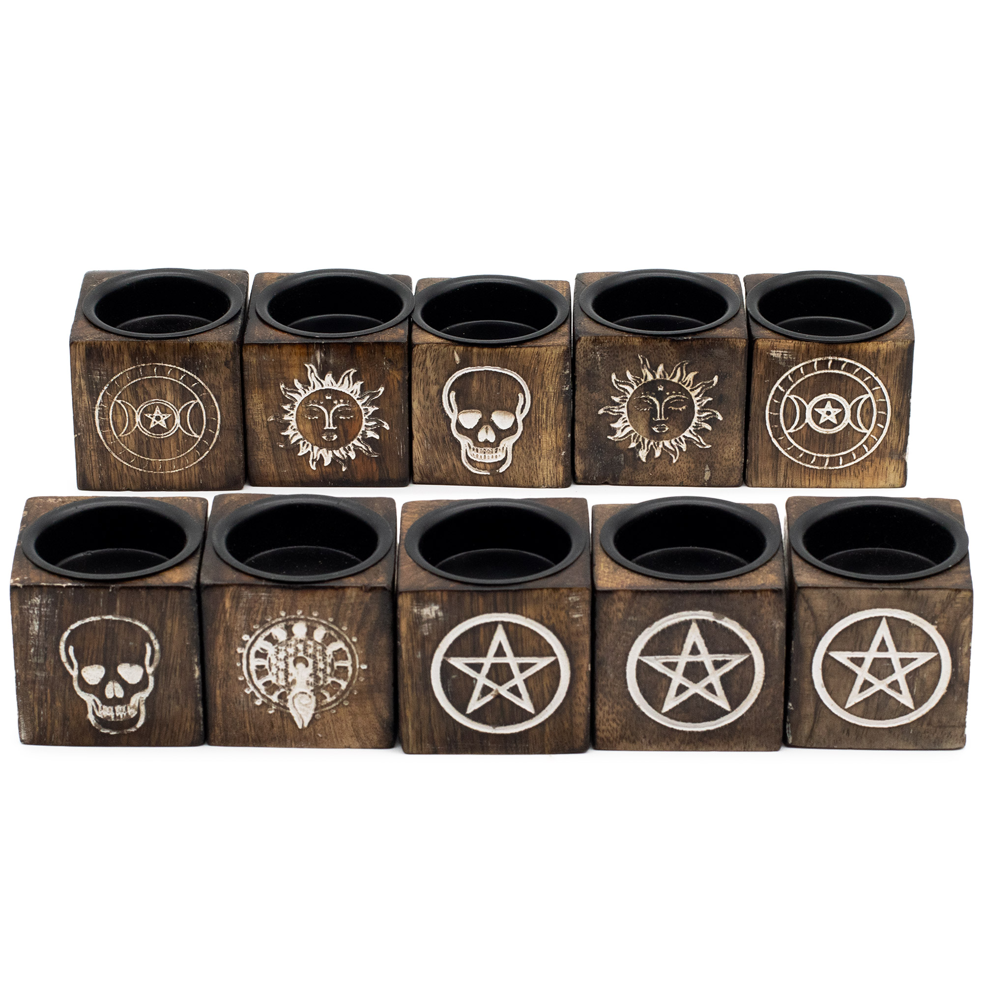 Ta multifunkcyjna podstawka z drewna mango to produkt stworzony z myślą o sklepach oferujących akcesoria ezoteryczne i dekoracje w klimacie magicznym. Kompaktowy sześcian o wymiarach 5x5x5 cm został ozdobiony wyrazistymi, białymi grawerami nawiązującymi do symboliki czarodziejstwa, takimi jak pentagram, czaszka, potrójny księżyc czy słońce. Dzięki solidnemu, metalowemu wkładowi, kostka służy jako stabilny świecznik na podgrzewacze typu tealight lub bezpieczna podstawka pod kadzidełka stożkowe.