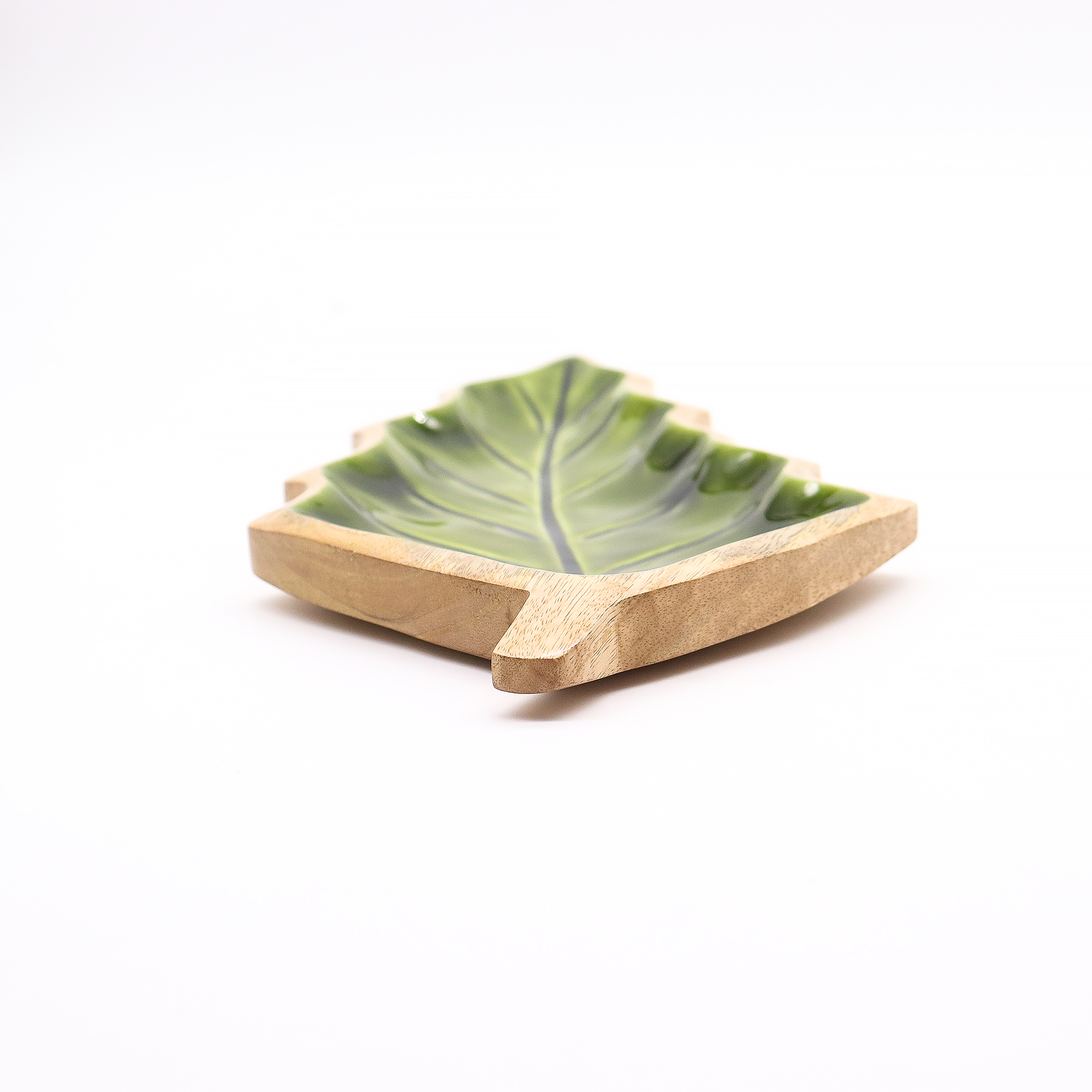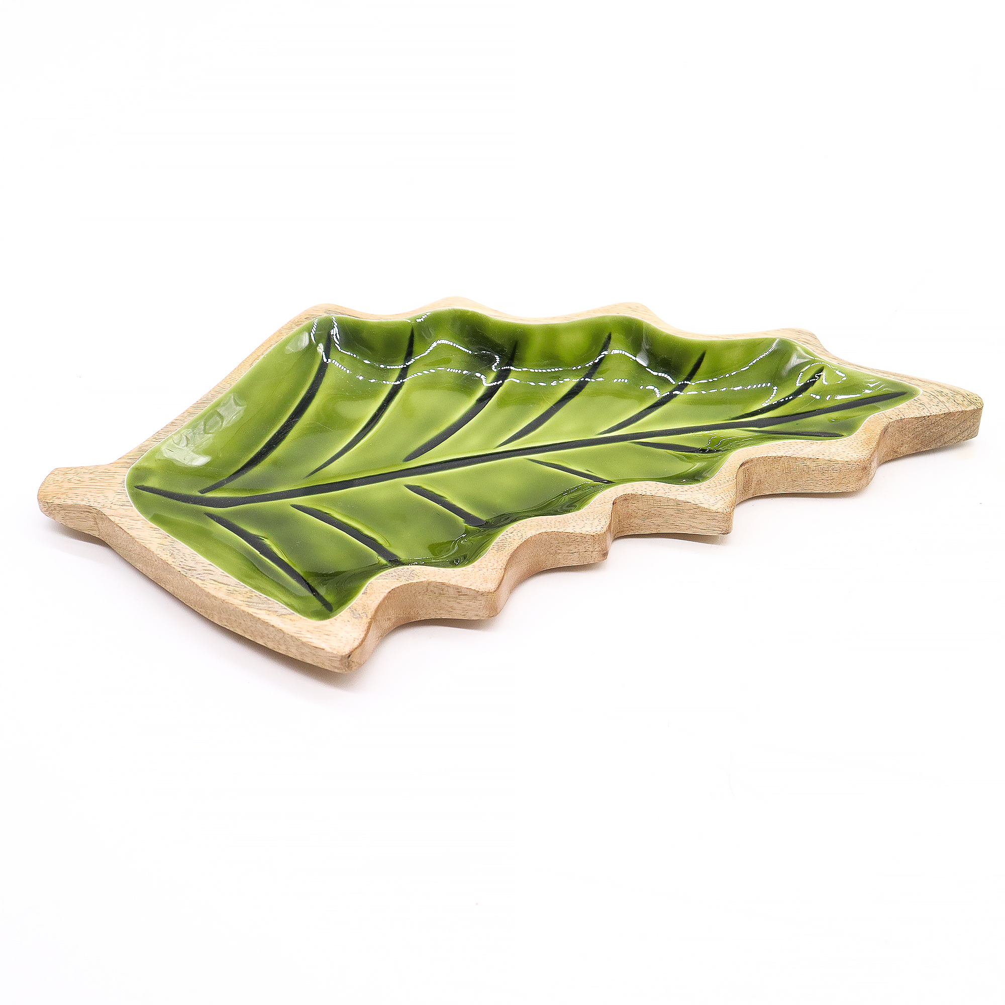 Stylowa misa dekoracyjna w kształcie liścia to połączenie naturalnego drewna mango i głębokiej zielonej emalii, które przywodzi na myśl las skąpany w letnim słońcu. Ręcznie wykonana w Indiach, zachwyca organicznym kształtem i rzemieślniczym wykończeniem.