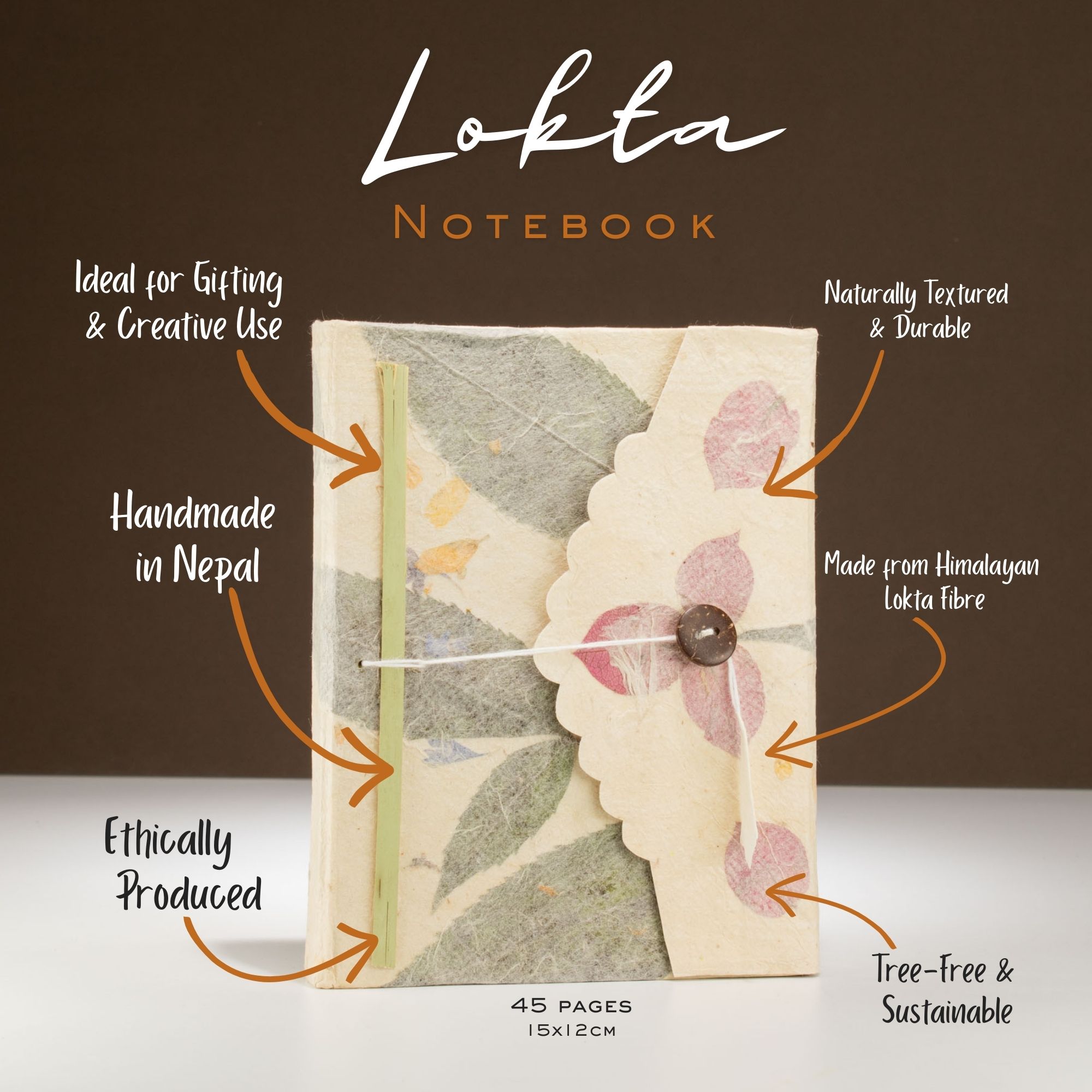Zawiera 45 kartek ekologicznego papieru Lokta, wytwarzanego ręcznie z kory odnawialnego krzewu Daphne, rosnącego w Himalajach. Każdy etap produkcji – od zbioru po suszenie – odbywa się tradycyjnymi metodami, dzięki czemu każda strona ma naturalną fakturę i wyjątkowy charakter.