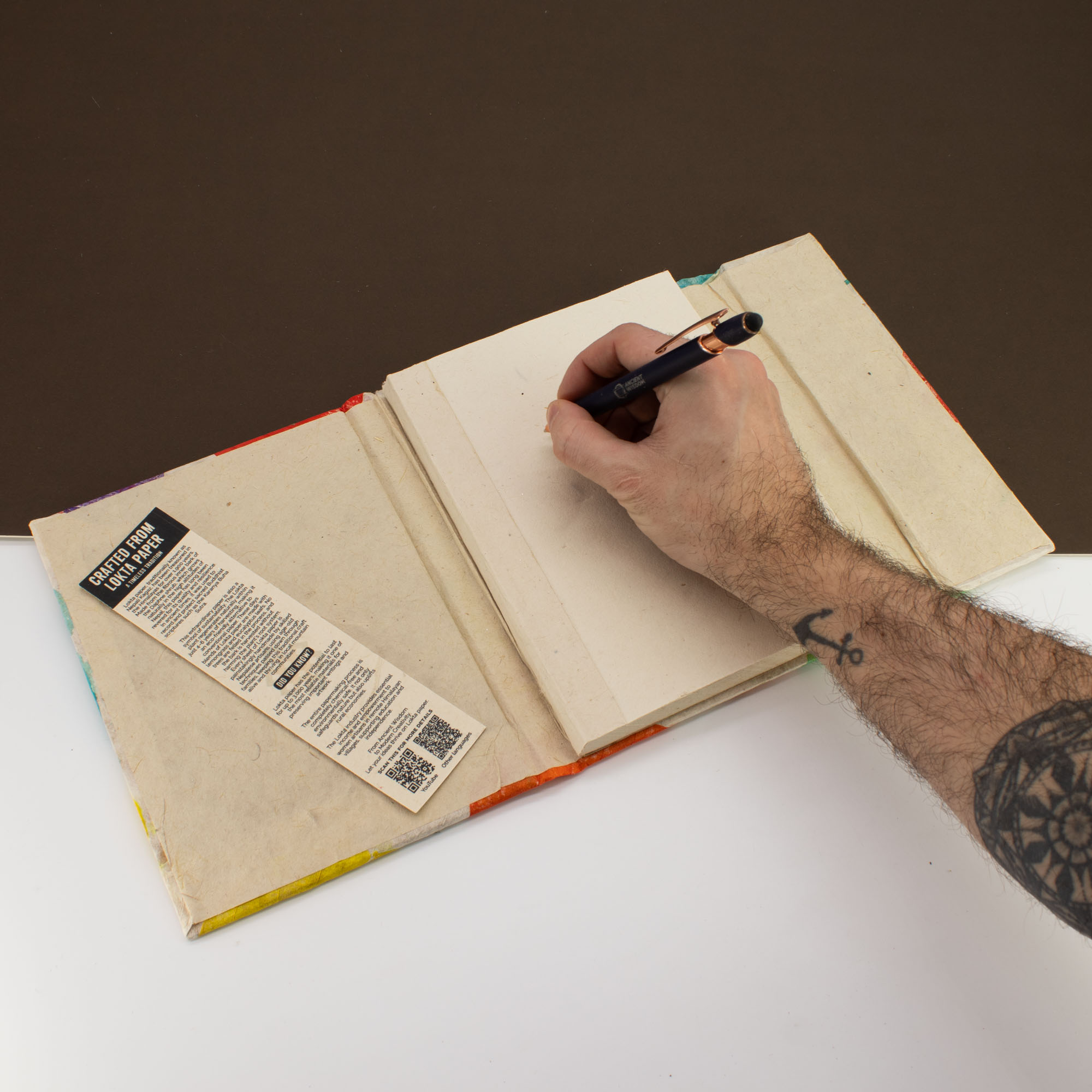 Notatnik wykonany został z papieru Lokta – ręcznie czerpanego z kory krzewu Daphne, który rośnie dziko w Nepalu i odnawia się w naturalny sposób. Proces produkcji jest w 100% ręczny i przyjazny środowisku, a cały produkt powstaje w ramach uczciwego handlu (fair trade).