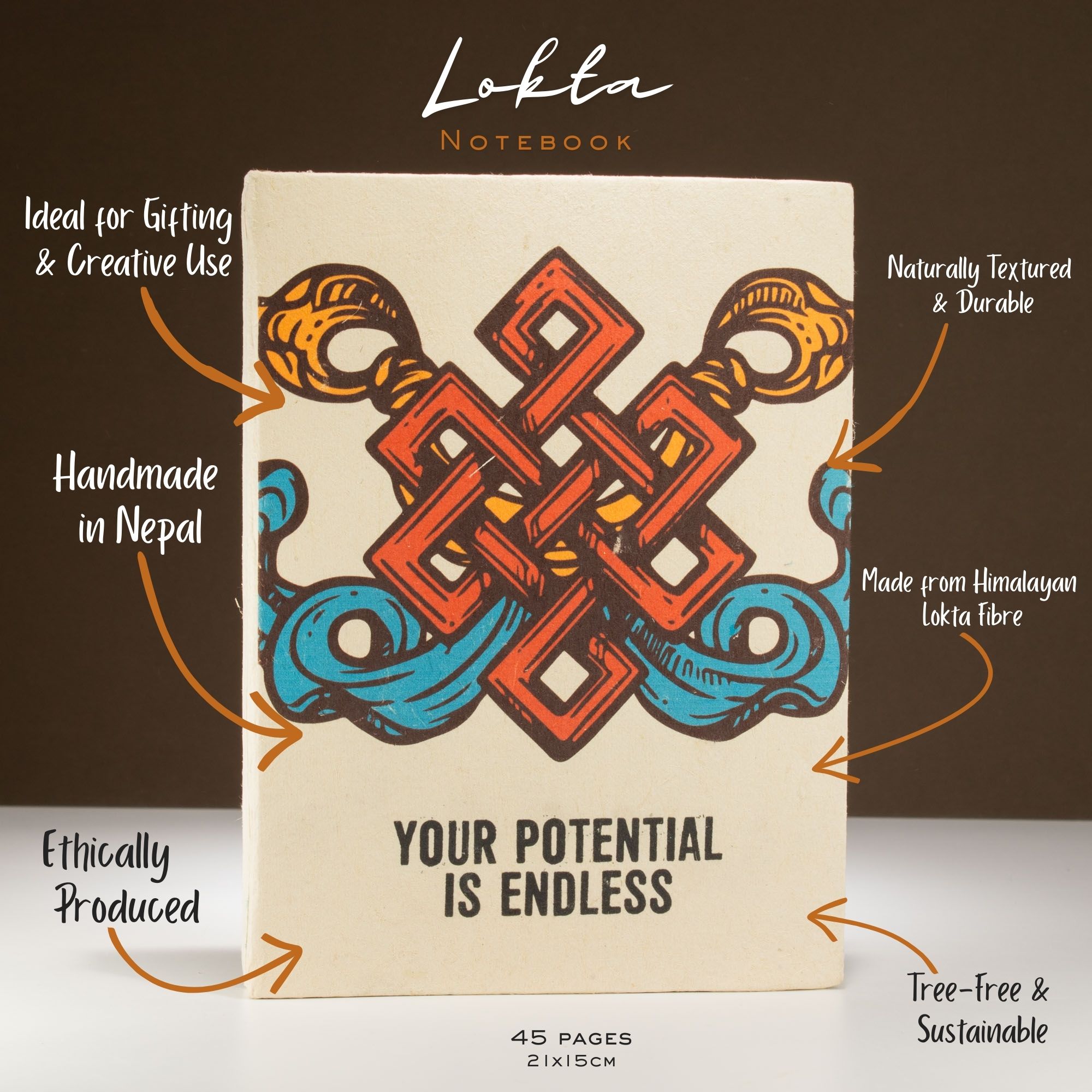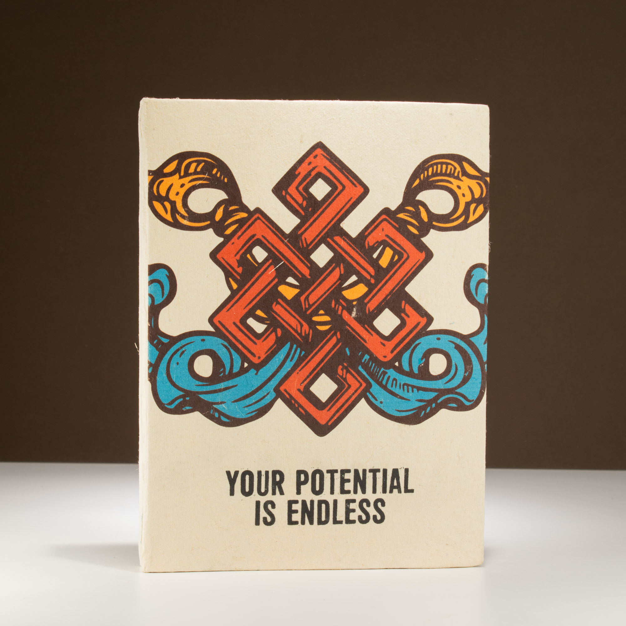 Niech każdy dzień zaczyna się od inspiracji. Ten duży notatnik z papieru Lokta to nie tylko narzędzie do zapisywania myśli, ale również przypomnienie o wewnętrznej sile i możliwościach. Na okładce widnieje tradycyjny, tybetański symbol nieskończonego węzła – znak harmonii, mądrości i niekończącego się potencjału – w towarzystwie motywującego napisu: "Your Potential is Endless."