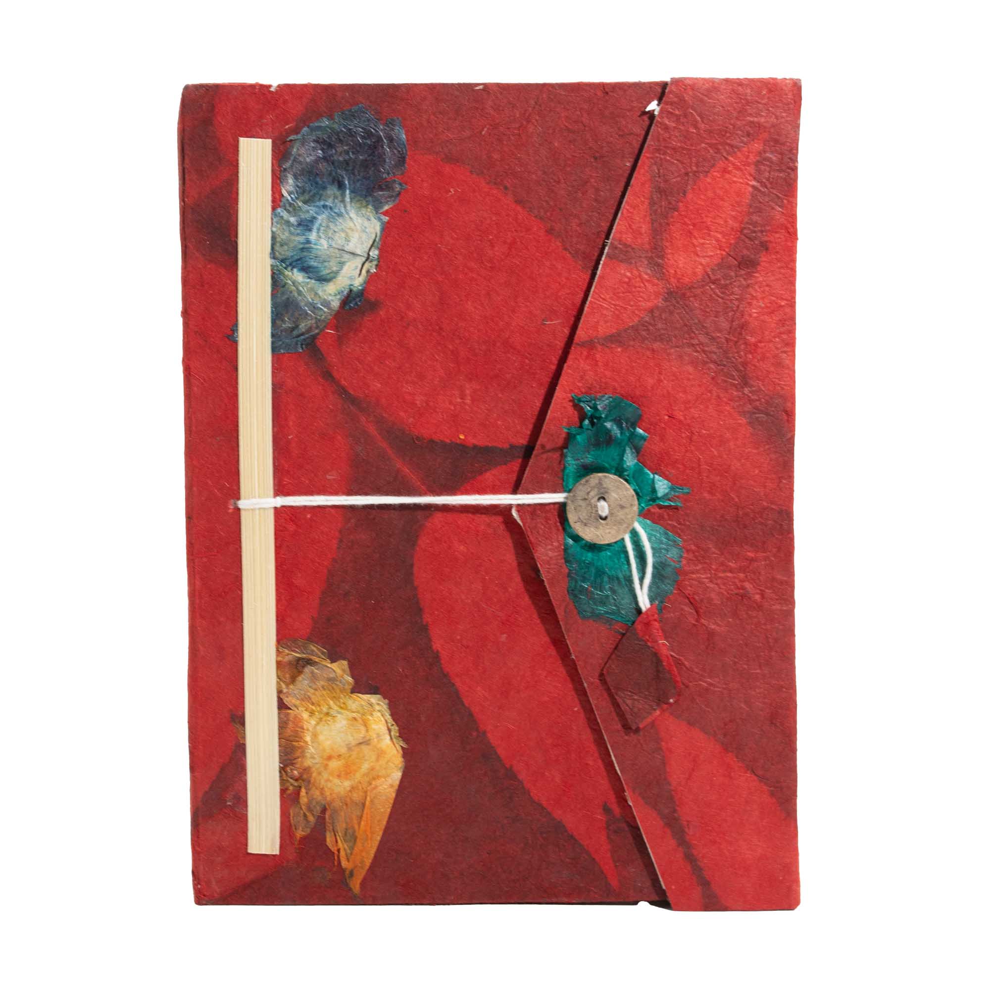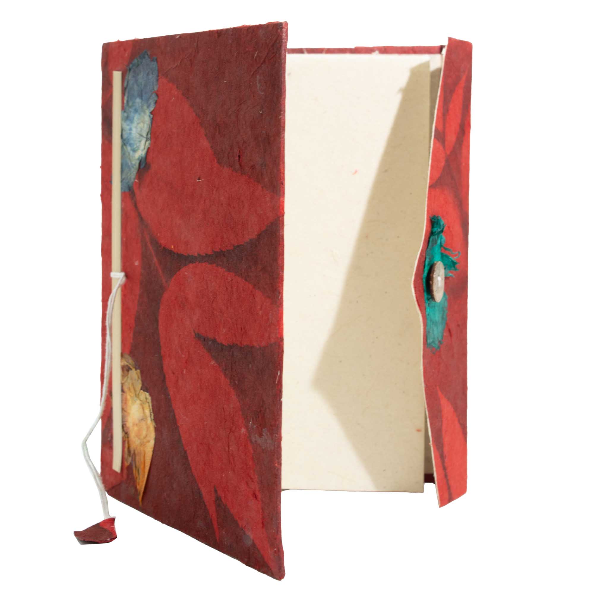 Ekskluzywny notatnik wykonany z tradycyjnego nepalskiego papieru lokta to idealne połączenie rzemiosła i elegancji. Okładka w głębokim, rubinowym kolorze przyciąga wzrok bogatym zdobieniem w postaci ręcznie aplikowanych, prasowanych kwiatów oraz subtelnych motywów roślinnych, co nadaje każdemu egzemplarzowi status unikalnego rękodzieła.