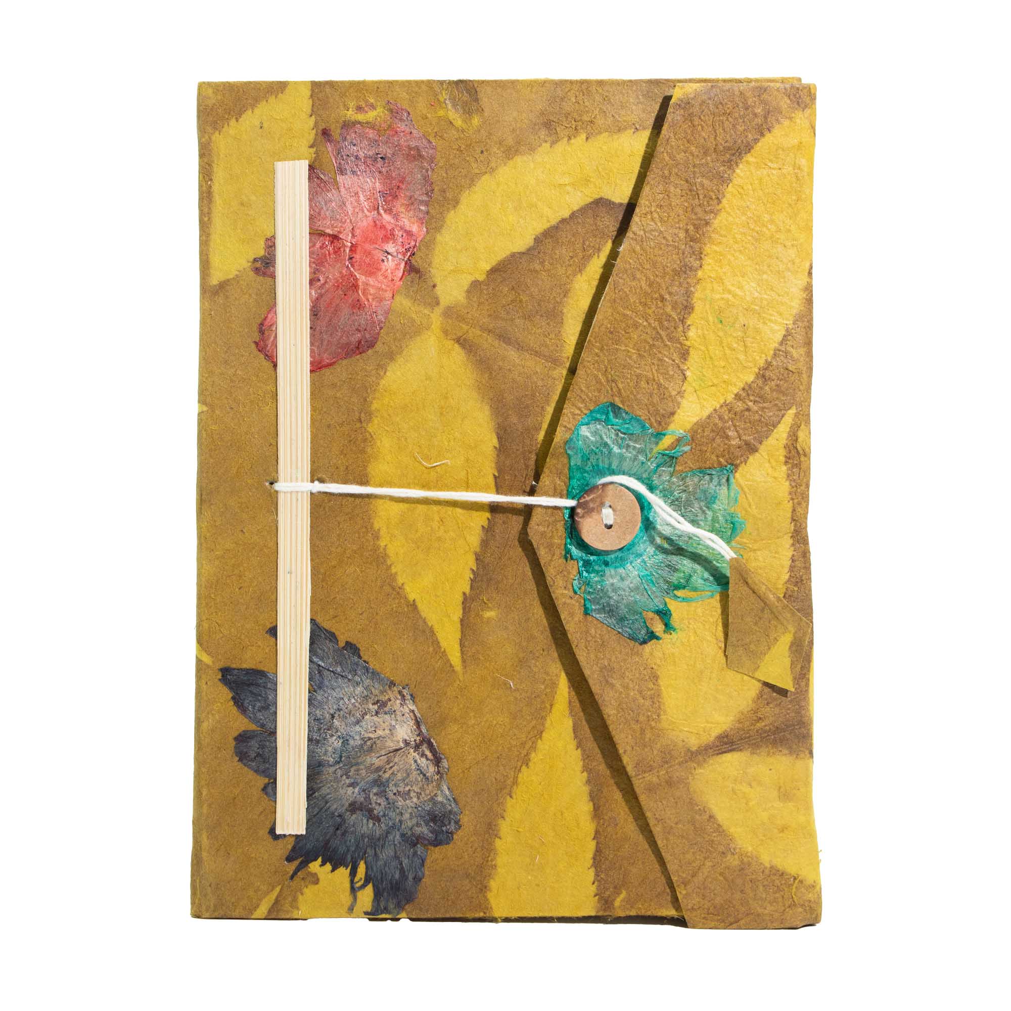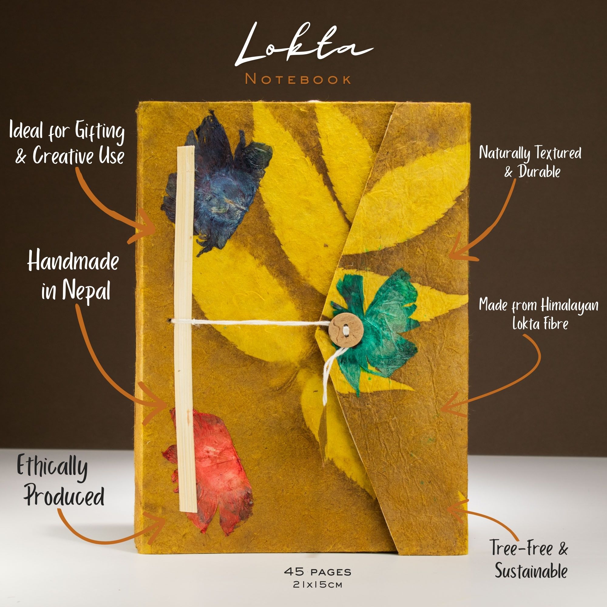 Wyjątkowy notatnik z papieru czerpanego lokta w energetycznym, musztardowym kolorze to propozycja dla odbiorców ceniących ekologię i autentyczne rzemiosło z Nepalu. Okładka została ozdobiona kompozycją z naturalnych, prasowanych kwiatów oraz motywami liści, co sprawia, że każda sztuka jest niepowtarzalna i posiada unikalny układ detali.