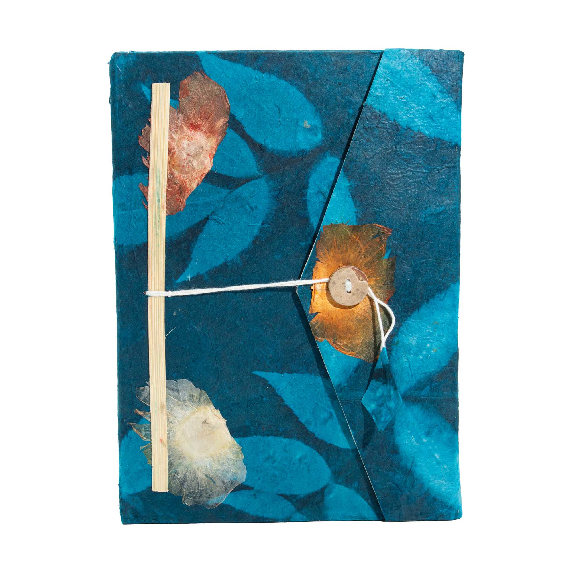 Elegancki notatnik wykonany z tradycyjnego nepalskiego papieru czerpanego lokta to propozycja łącząca szlachetną estetykę z ekologicznym rzemiosłem. Okładka w głębokim, granatowym odcieniu stanowi doskonałe tło dla ręcznie naniesionych zdobień w postaci prasowanych, naturalnych kwiatów oraz subtelnych motywów roślinnych, co nadaje każdemu egzemplarzowi unikatowy charakter.
