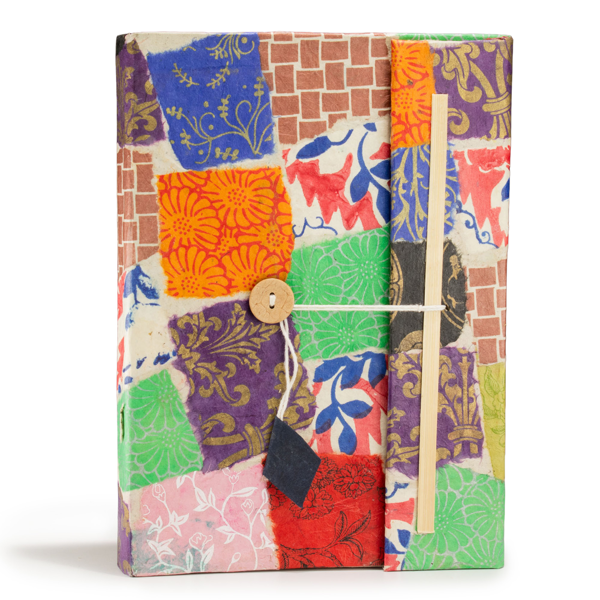 Artystyczny notatnik wykonany z tradycyjnego nepalskiego papieru czerpanego Lokta to wyjątkowy produkt, który wyróżnia się unikalną okładką typu patchwork. Złożona z różnokolorowych skrawków papieru zdobionych tradycyjnymi, orientalnymi i geometrycznymi wzorami, każda okładka stanowi niepowtarzalną mozaikę barw.