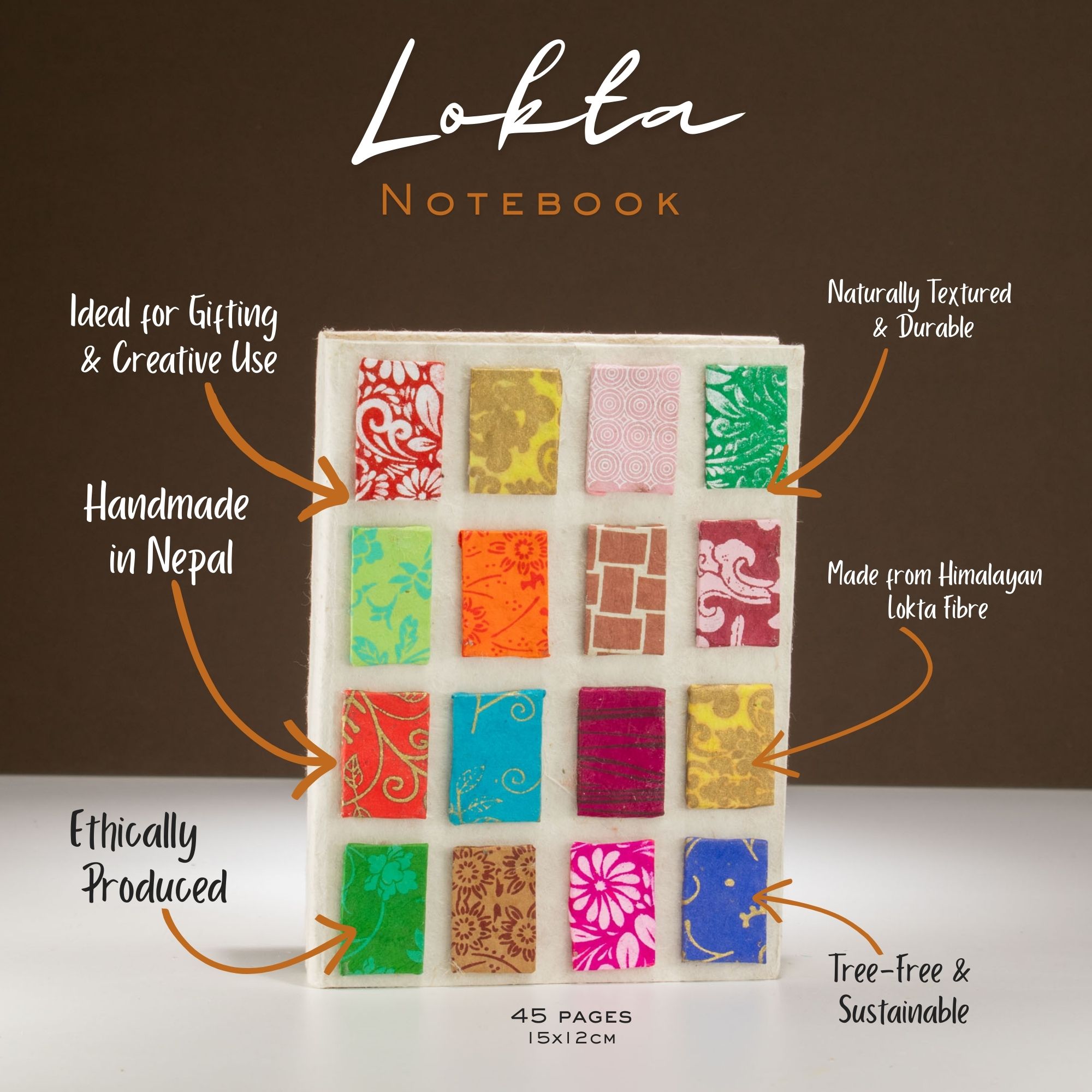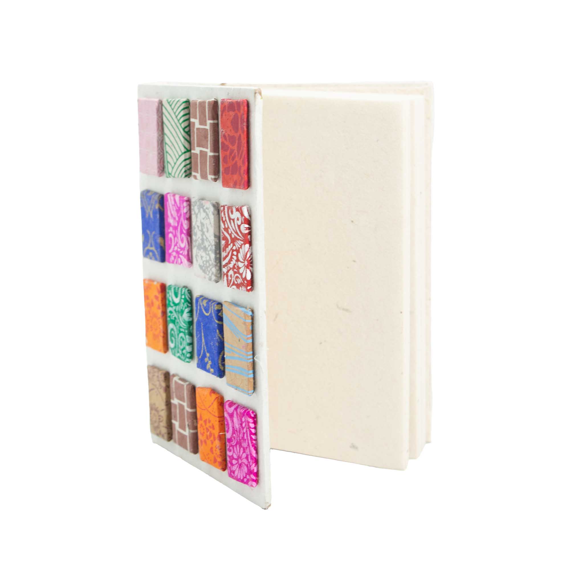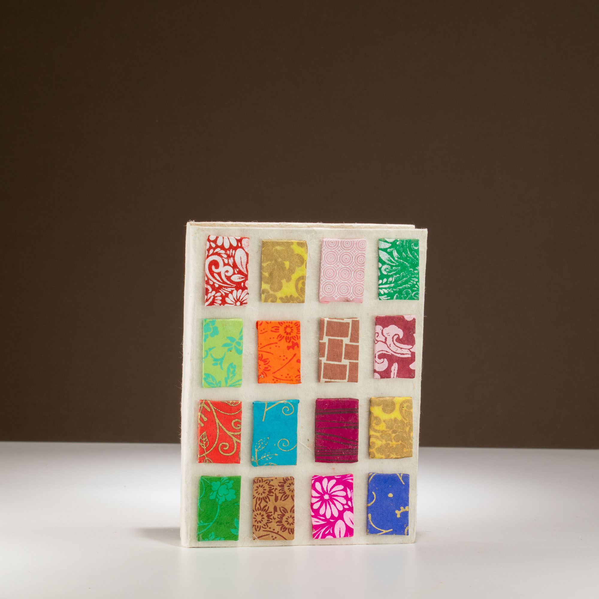 Ekologiczny notatnik wykonany z autentycznego papieru czerpanego lokta to wyjątkowy przykład nepalskiego rzemiosła artystycznego. Okładka w jasnym, naturalnym odcieniu bieli została ozdobiona regularnym układem kolorowych kafli, z których każdy prezentuje inny motyw dekoracyjny – od kwiatowych ornamentów po geometryczne wzory.