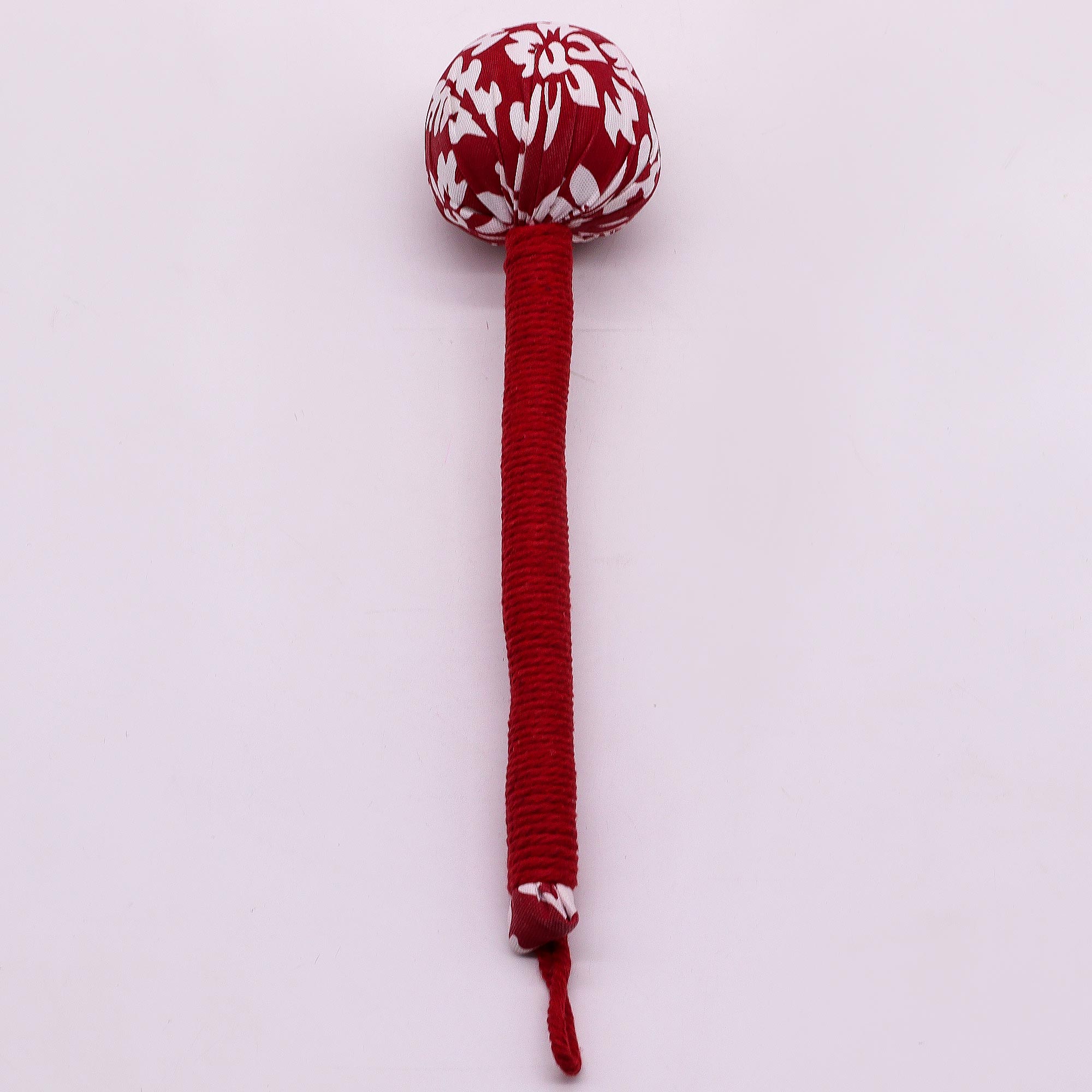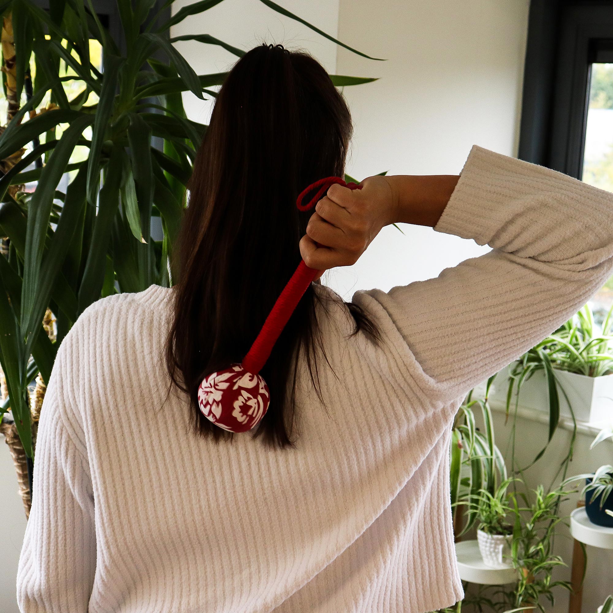 Zaokrąglona główka masażera delikatnie dopasowuje się do kształtu ciała, umożliwiając precyzyjny masaż punktów akupresurowych na karku, ramionach, plecach i nogach. Opleciony sznurkiem uchwyt w intensywnym czerwonym kolorze zapewnia wygodę i pewny chwyt, a jednocześnie nadaje produktowi elegancki, orientalny wygląd.
