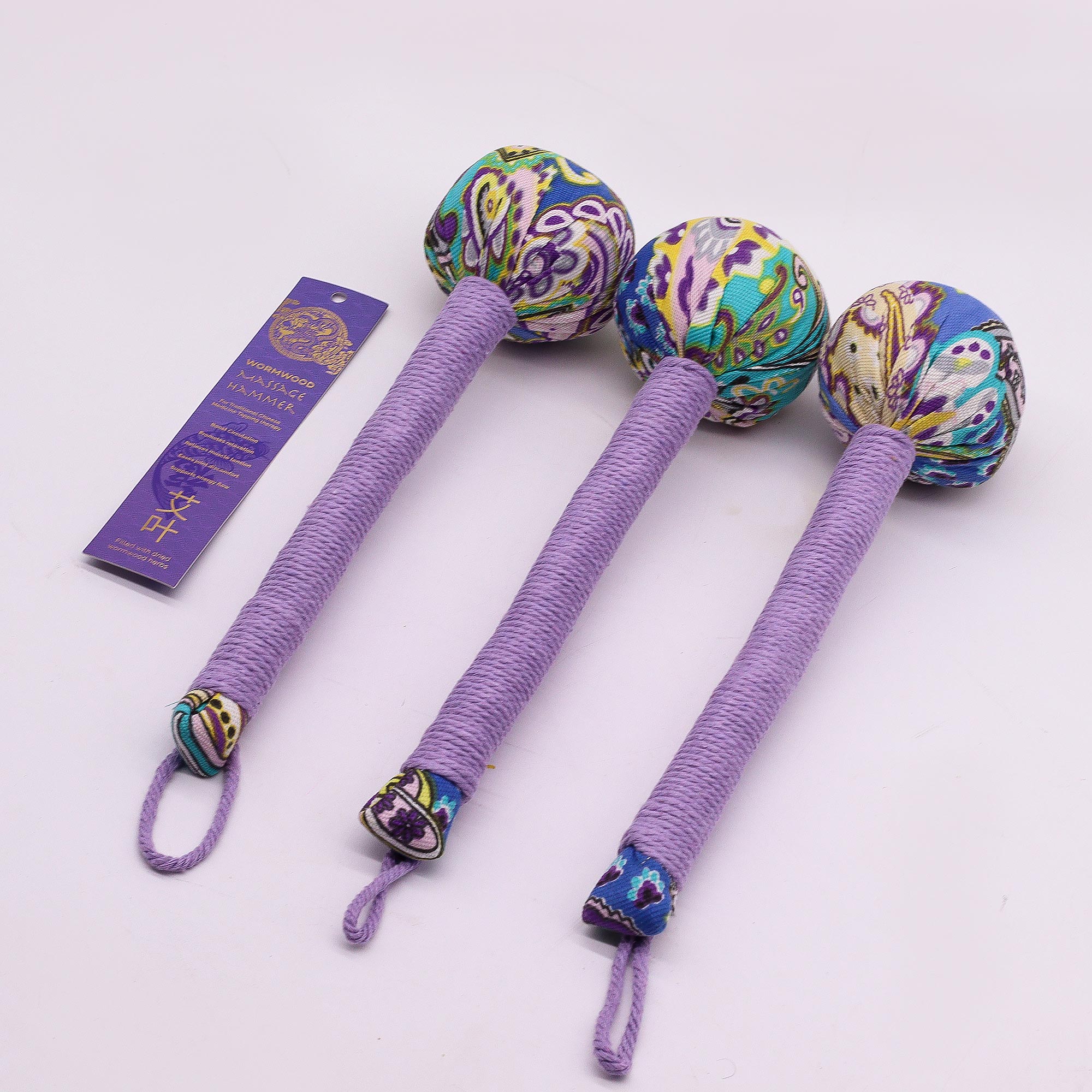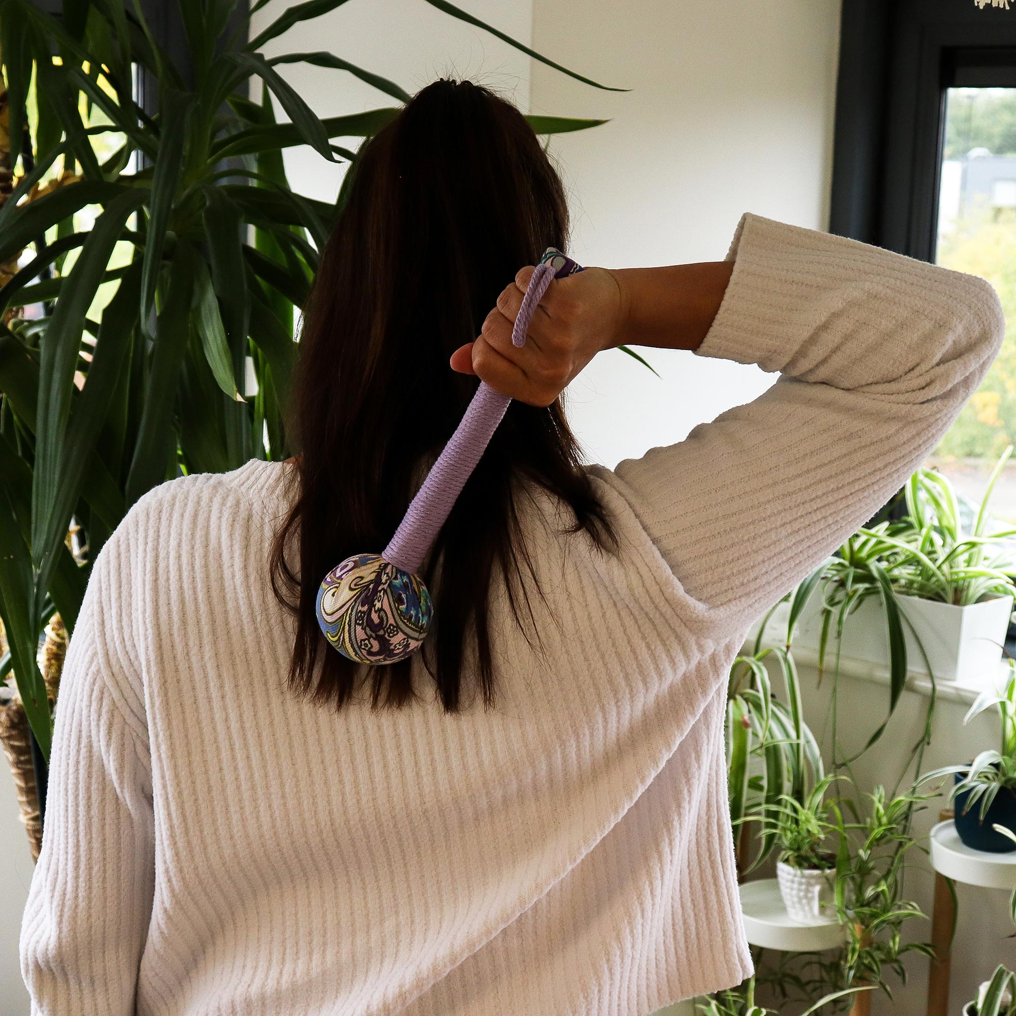 Zaokrąglona główka masażera delikatnie dopasowuje się do kształtu ciała, umożliwiając precyzyjny i przyjemny masaż ramion, karku, nóg czy pleców. Opleciony sznurkiem uchwyt w fioletowym odcieniu zapewnia komfort użytkowania, a jego orientalny design dodaje produktowi wyjątkowego charakteru.
