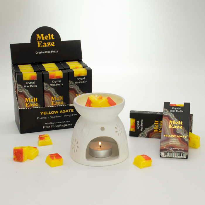 Ten wyjątkowy wosk o zapachu świeżych cytrusów został stworzony z myślą o klientach poszukujących w produktach domowych dodatkowej wartości i estetyki. Żółty agat, zatopiony w intensywnie żółtej masie woskowej, symbolizuje pozytywność, obfitość oraz swobodny przepływ energii, co czyni produkt idealnym upominkiem o symbolicznym znaczeniu. Połączenie rześkich, pobudzających nut zapachowych z wizualną atrakcyjnością minerałów sprawia, że Melt Eaze wyróżnia się na tle konkurencji, a możliwość precyzyjnego przełamania tabliczki pozwala użytkownikowi na pełną kontrolę nad intensywnością aromatu w kominku.