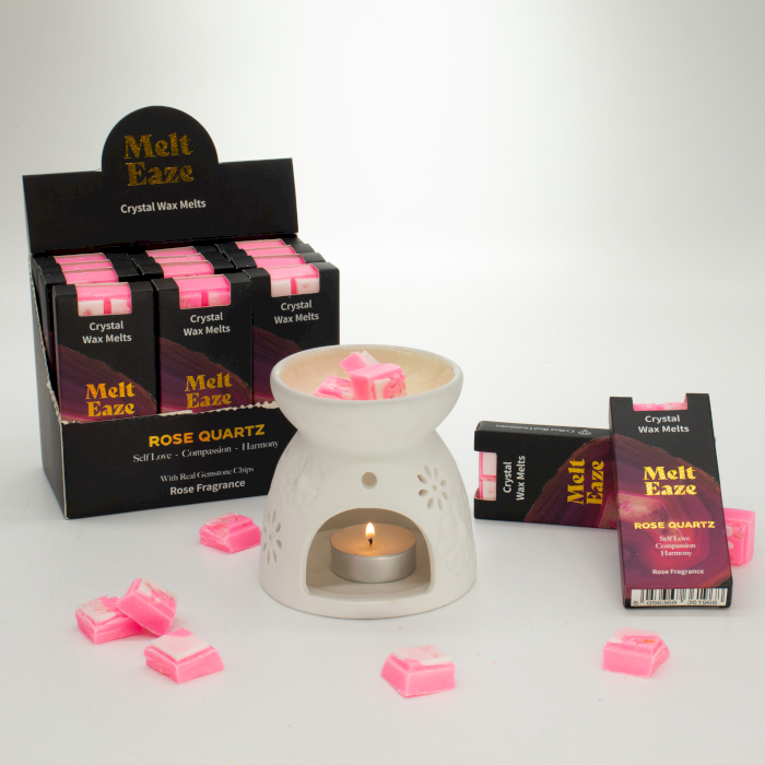 Wosk zapachowy Melt Eaze Róża z Kwarcem Różowym to kwintesencja subtelności i luksusu, która błyskawicznie podbije serca Twoich klientów. Tabliczka 50g z zatopionymi minerałami dzieli się na 10 aromatycznych kostek, oferując długotrwały zapach i unikalny prezent w postaci kamieni naturalnych. To bestsellerowy produkt impulsowy do butików i kwiaciarni.