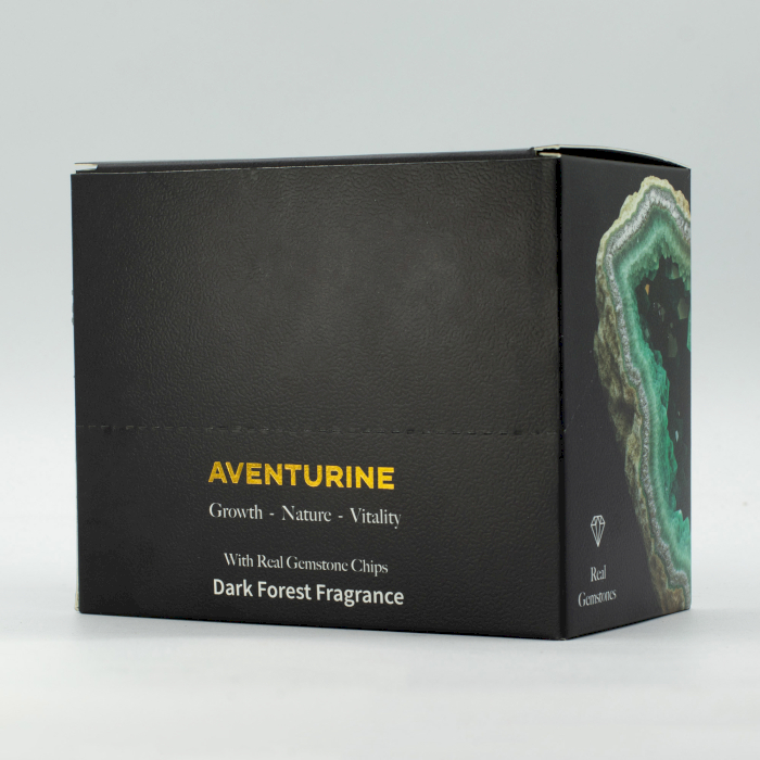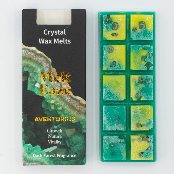 Intensywnie zielony wosk, o zapachu głębokiego lasu, skrywa w sobie bryłki prawdziwego awenturynu. Kamień ten symbolizuje wzrost, naturę i siły witalne. Dzięki praktycznej formie tabliczki dzielonej na 10 kostek, użytkownik może precyzyjnie kontrolować intensywność aromatu w kominku, a po rozpuszczeniu wosku otrzymuje naturalne minerały, które stanowią trwałą wartość dodaną.