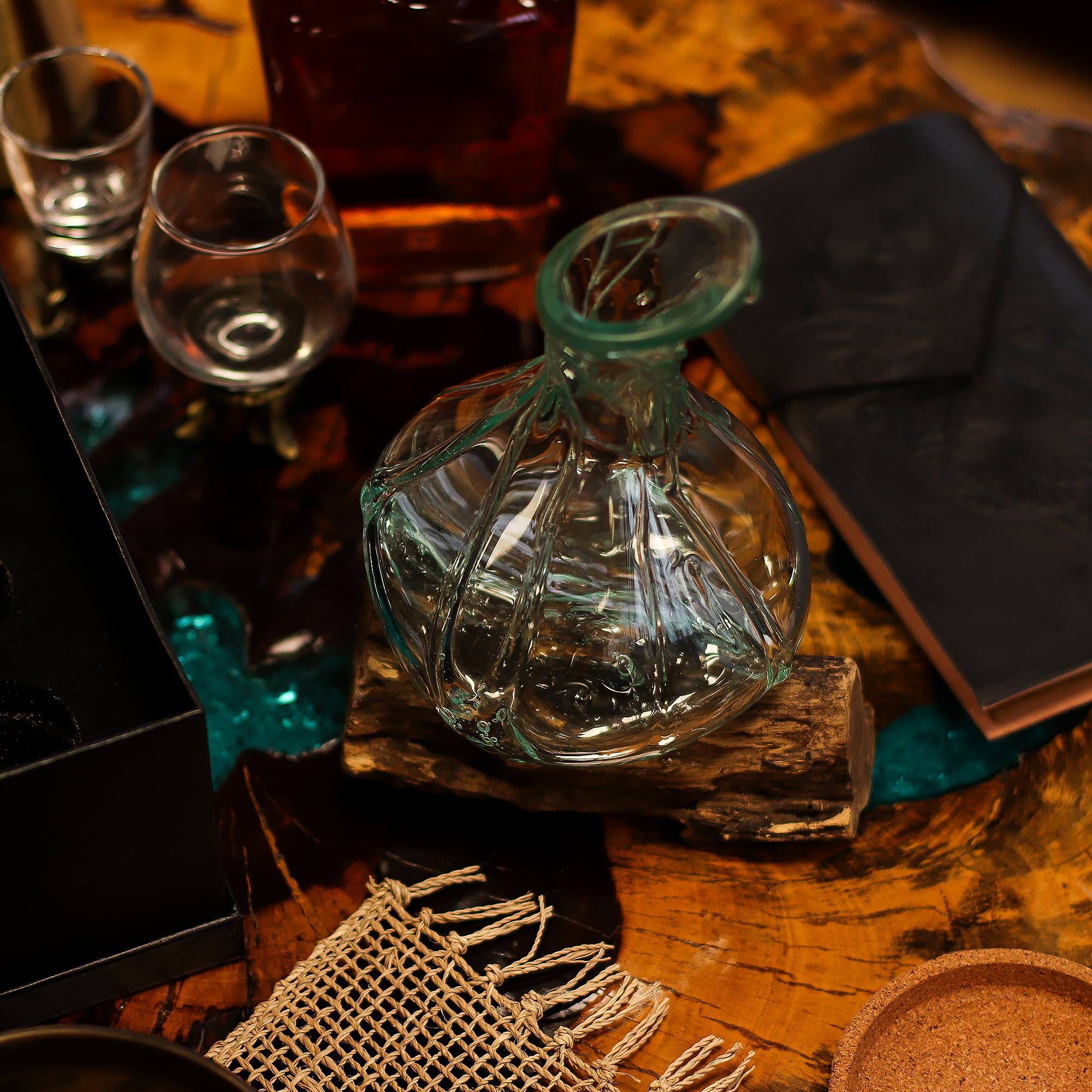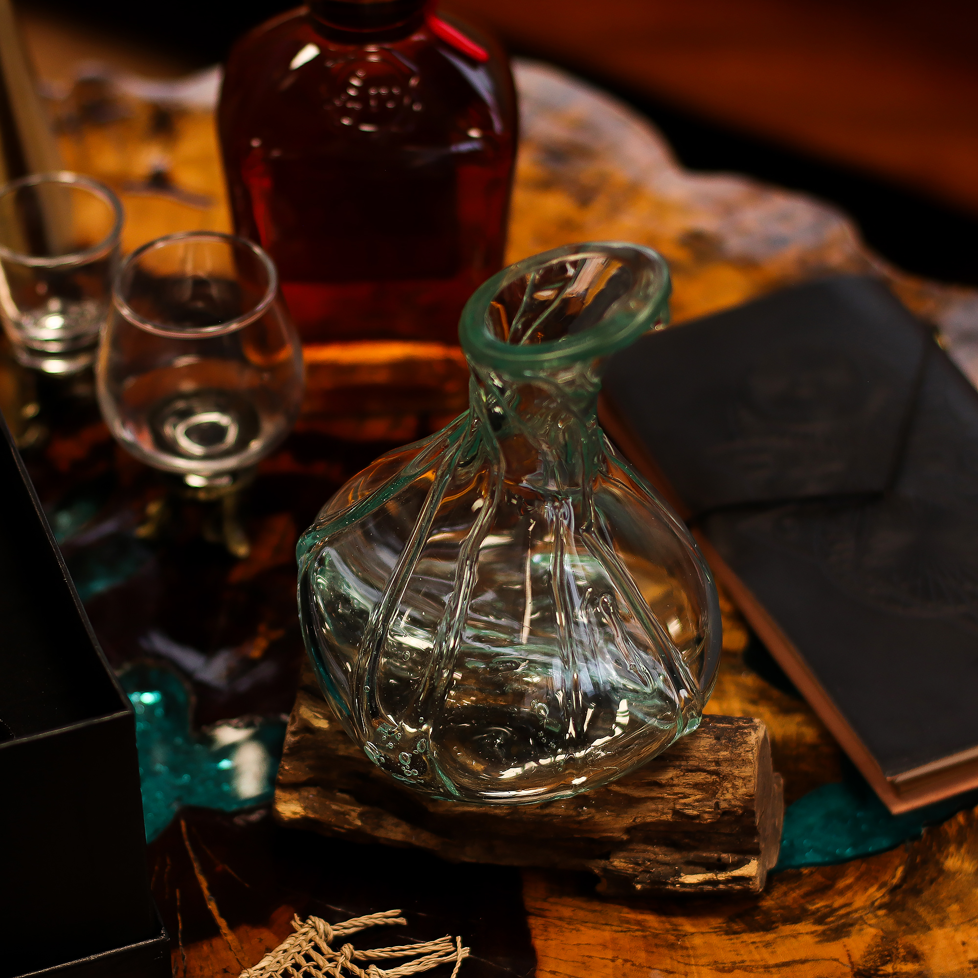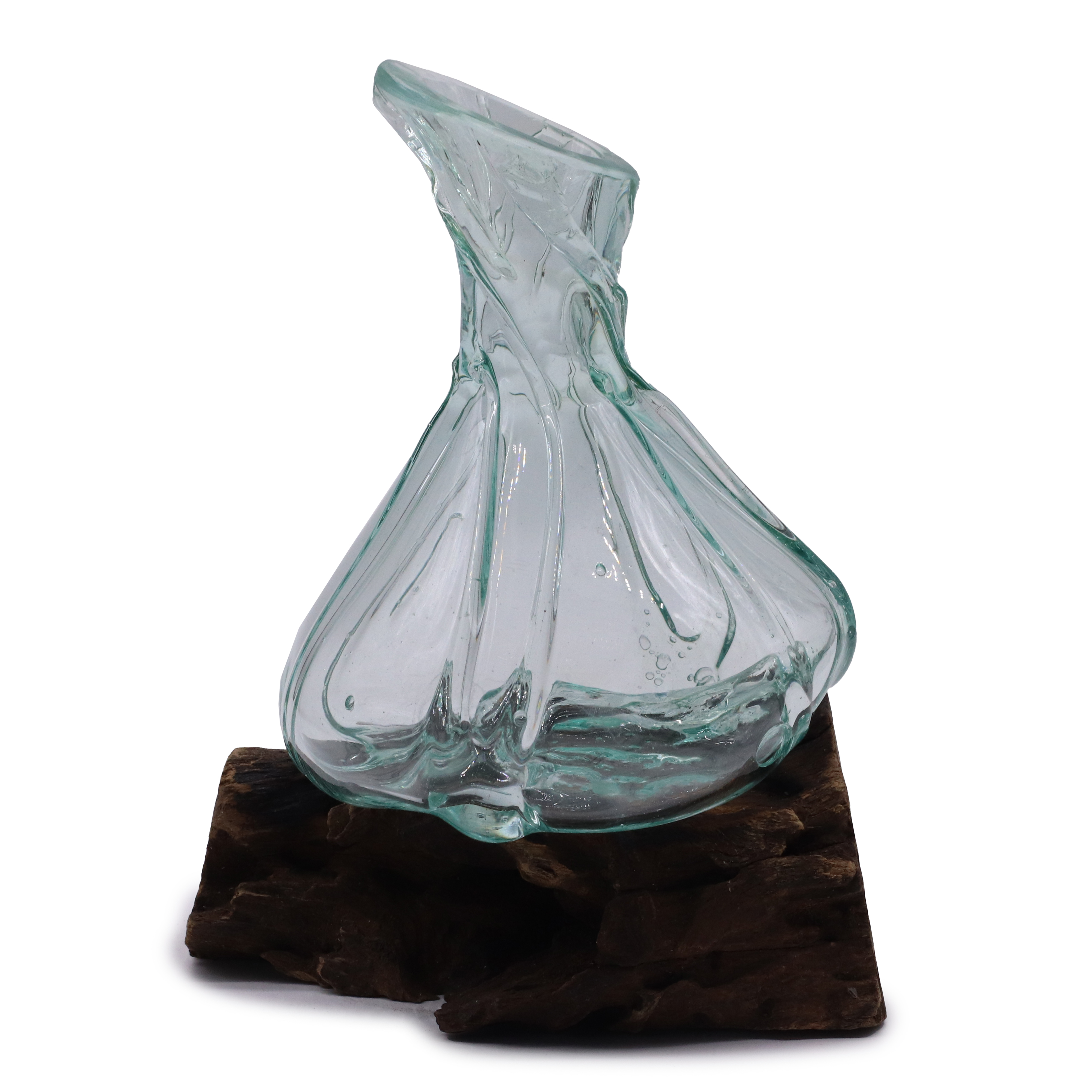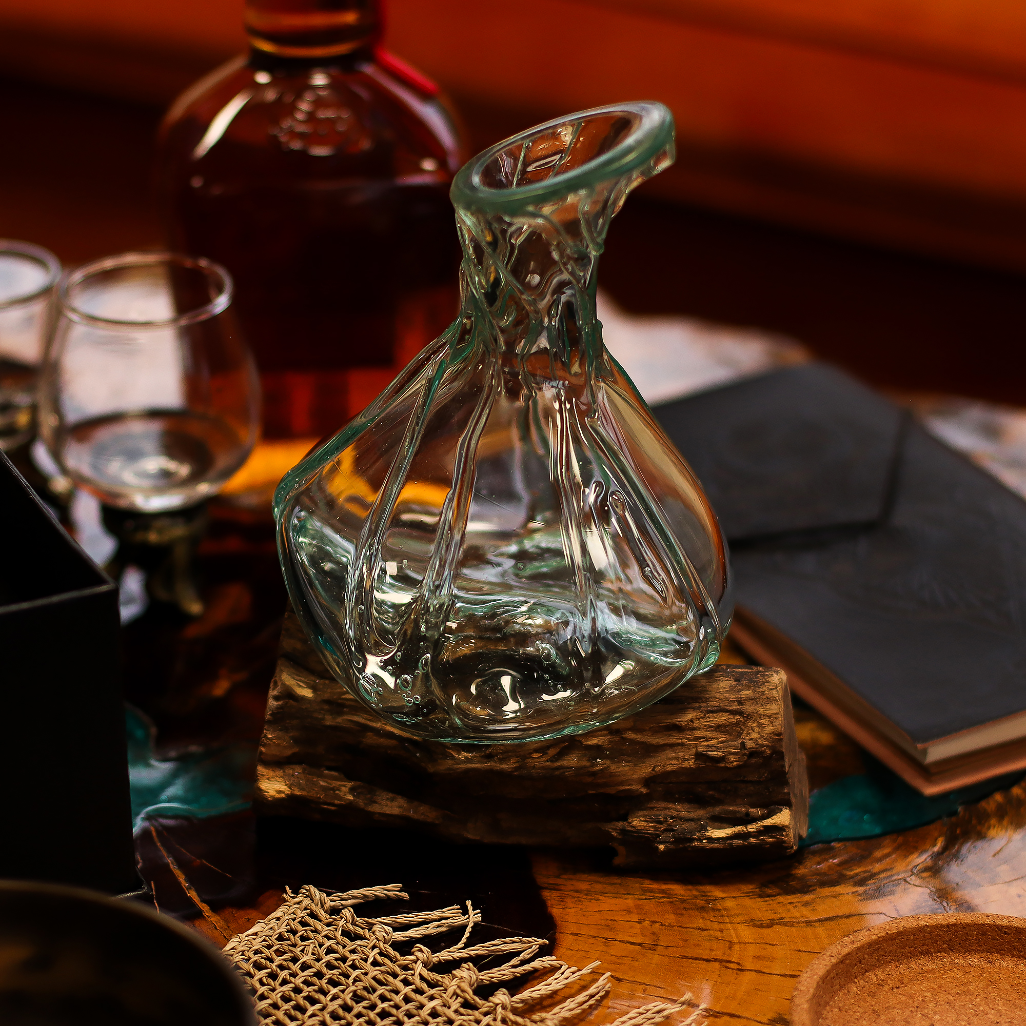 Fantazyjna Szklana Karafka Wtopiona w Drewno to wyjątkowa, artystyczna dekoracja, która stanowi połączenie ręcznie dmuchanego szkła z surową, naturalną podstawą z drewna. To, co wyróżnia ten model, to jego fantazyjny, pofałdowany kształt szkła, przypominający artystycznie ułożony materiał. Gorące szkło jest wylewane bezpośrednio na drewno, dzięki czemu idealnie dopasowuje się do każdego zagłębienia i tworzy organiczną, jedyną w swoim rodzaju kompozycję – nie ma dwóch identycznych egzemplarzy.