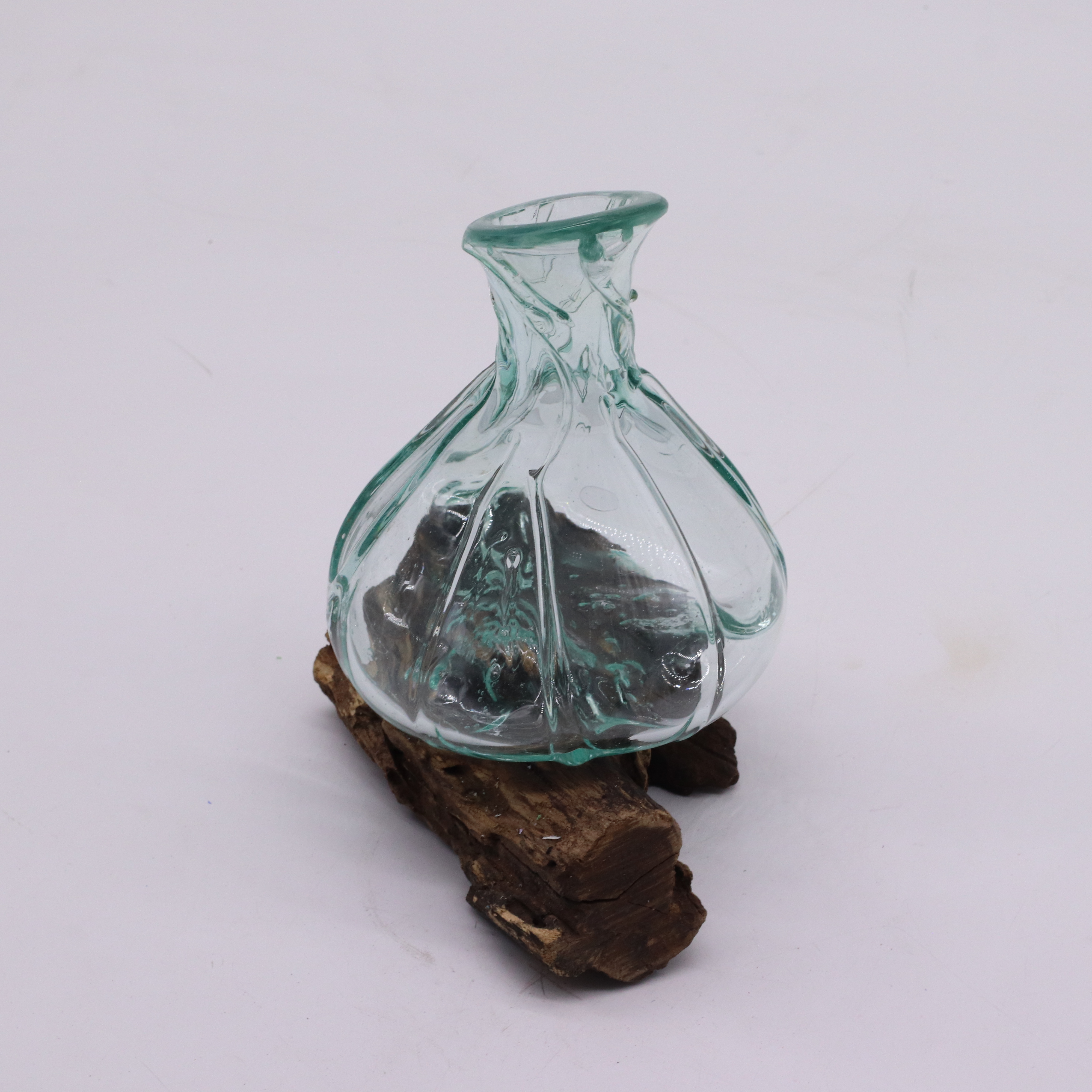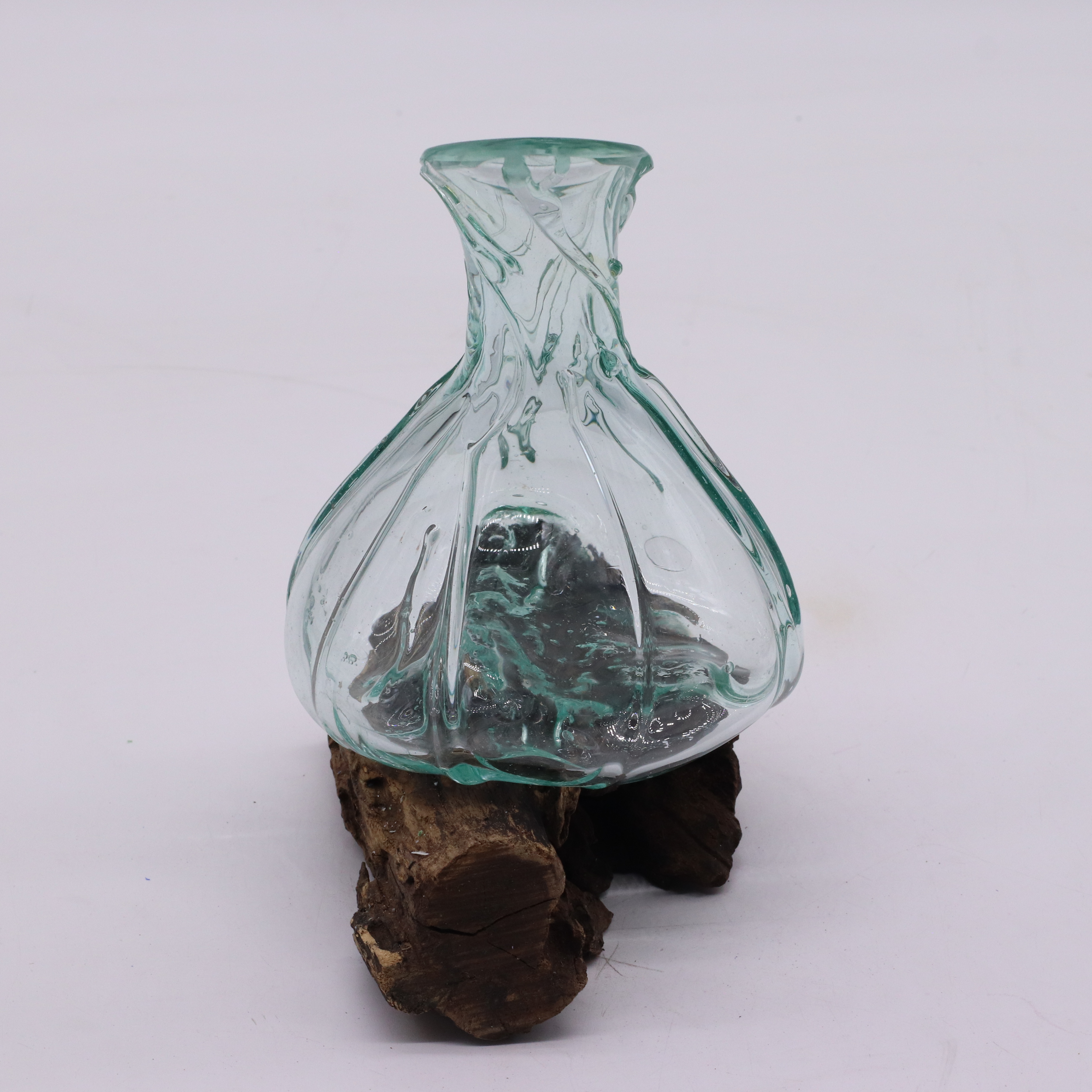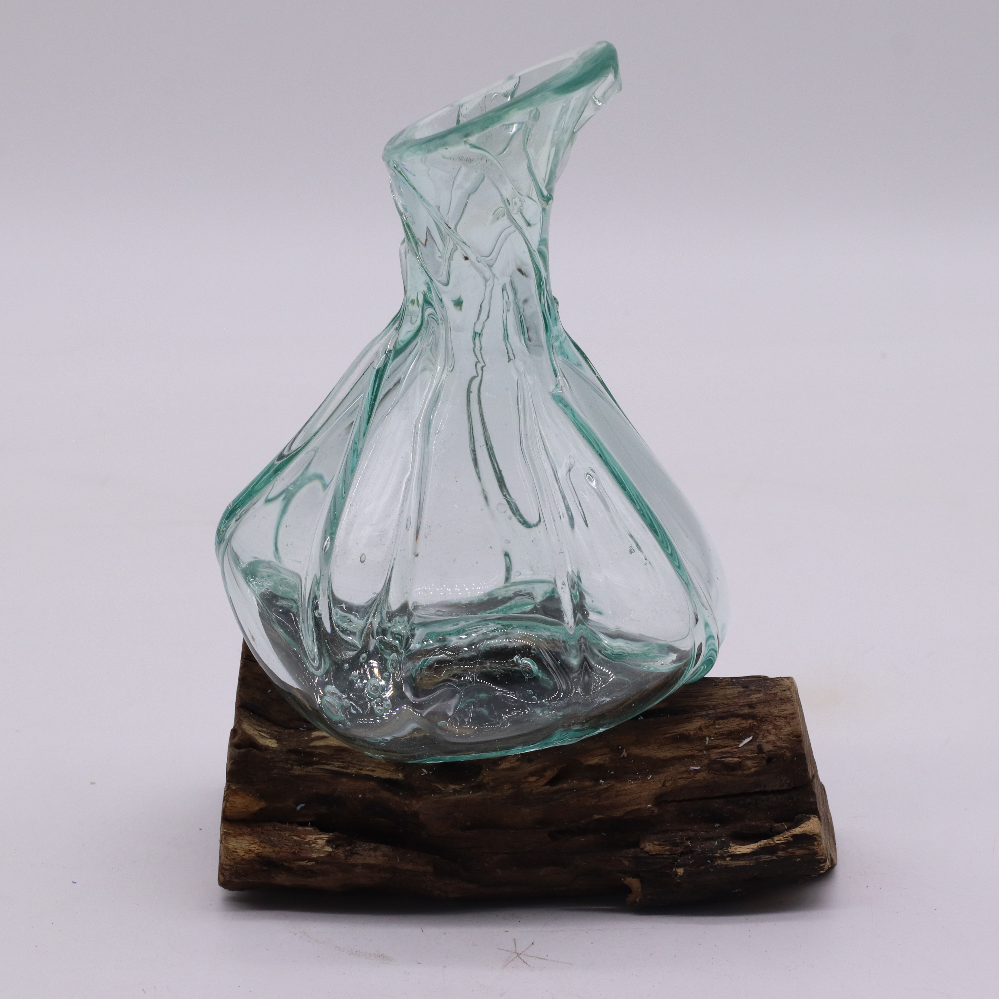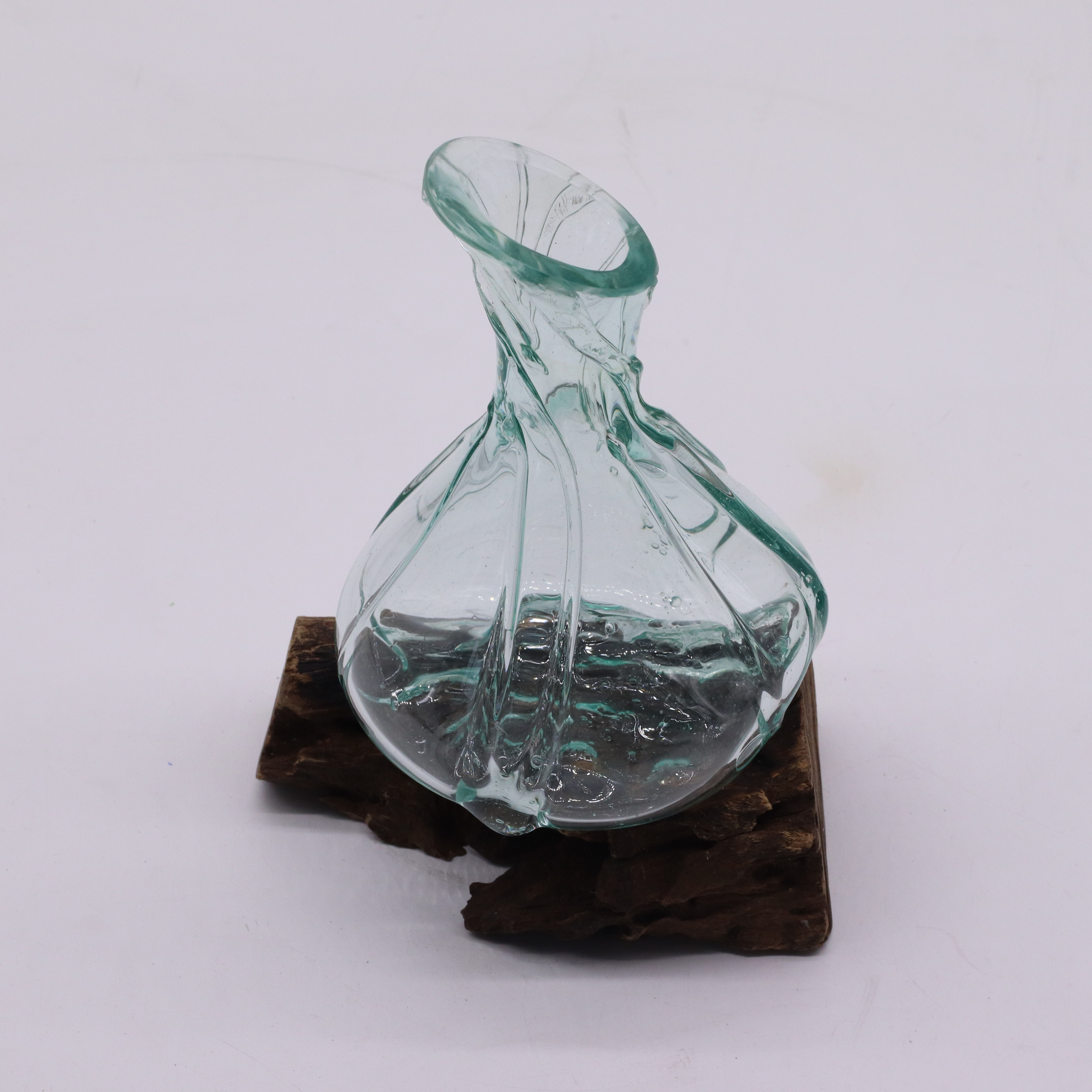 Fantazyjna Szklana Karafka Wtopiona w Drewno to wyjątkowa, artystyczna dekoracja, która stanowi połączenie ręcznie dmuchanego szkła z surową, naturalną podstawą z drewna. To, co wyróżnia ten model, to jego fantazyjny, pofałdowany kształt szkła, przypominający artystycznie ułożony materiał. Gorące szkło jest wylewane bezpośrednio na drewno, dzięki czemu idealnie dopasowuje się do każdego zagłębienia i tworzy organiczną, jedyną w swoim rodzaju kompozycję – nie ma dwóch identycznych egzemplarzy.