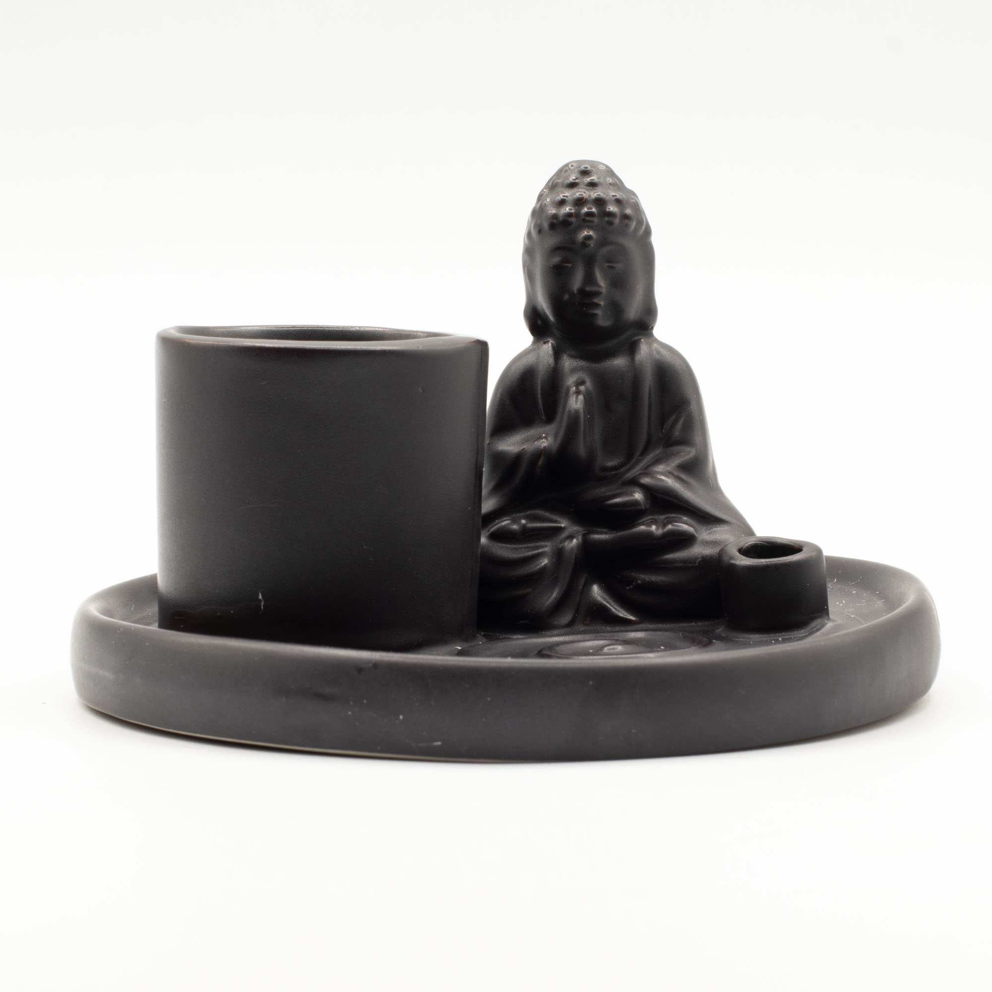 Wielofunkcyjna podstawka pod kadzidełka Budda w eleganckim, matowym czarnym wykończeniu łączy funkcjonalność z trwałym wykonaniem. Podstawka posiada okrągłą bazę, która skutecznie zbiera popiół, oraz uchwyty umożliwiające palenie patyczków, stożków, pęczków i drewienek Palo Santo, co sprawia, że produkt jest uniwersalny i łatwy w codziennym użytkowaniu.