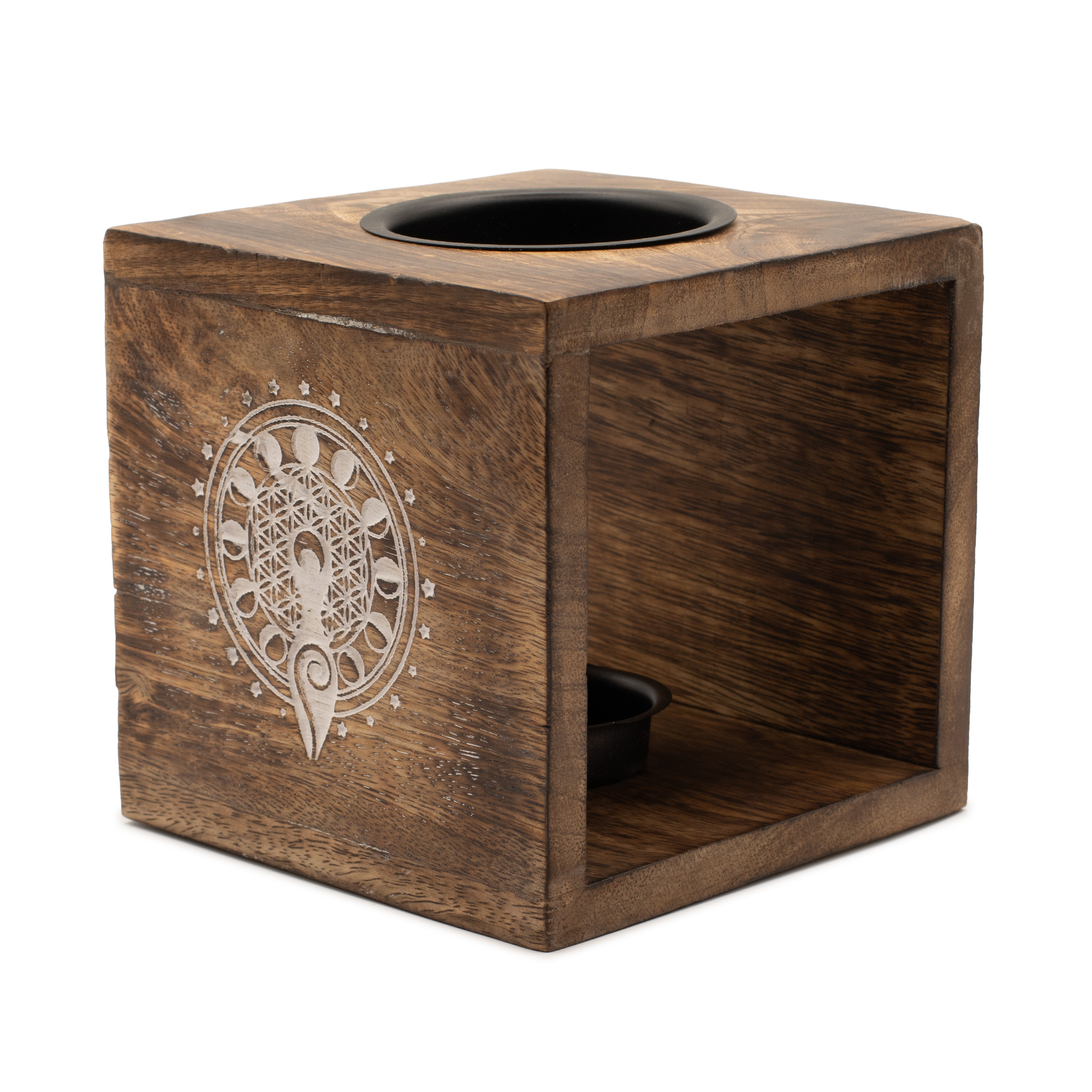 Główną ozdobą kominka jest biały, misterny grawer przedstawiający Boginię Księżyca wpisaną w cykl faz lunarnych. Symbol ten, głęboko zakorzeniony w tradycjach związanych z intuicją, odrodzeniem i kobiecą siłą, nadaje przedmiotowi mistycznego wyrazu. Kominek zapewnia bezpieczne użytkowanie zarówno z woskami zapachowymi, jak i olejkami eterycznymi, gwarantując czystość i wygodę podczas codziennej eksploatacji.