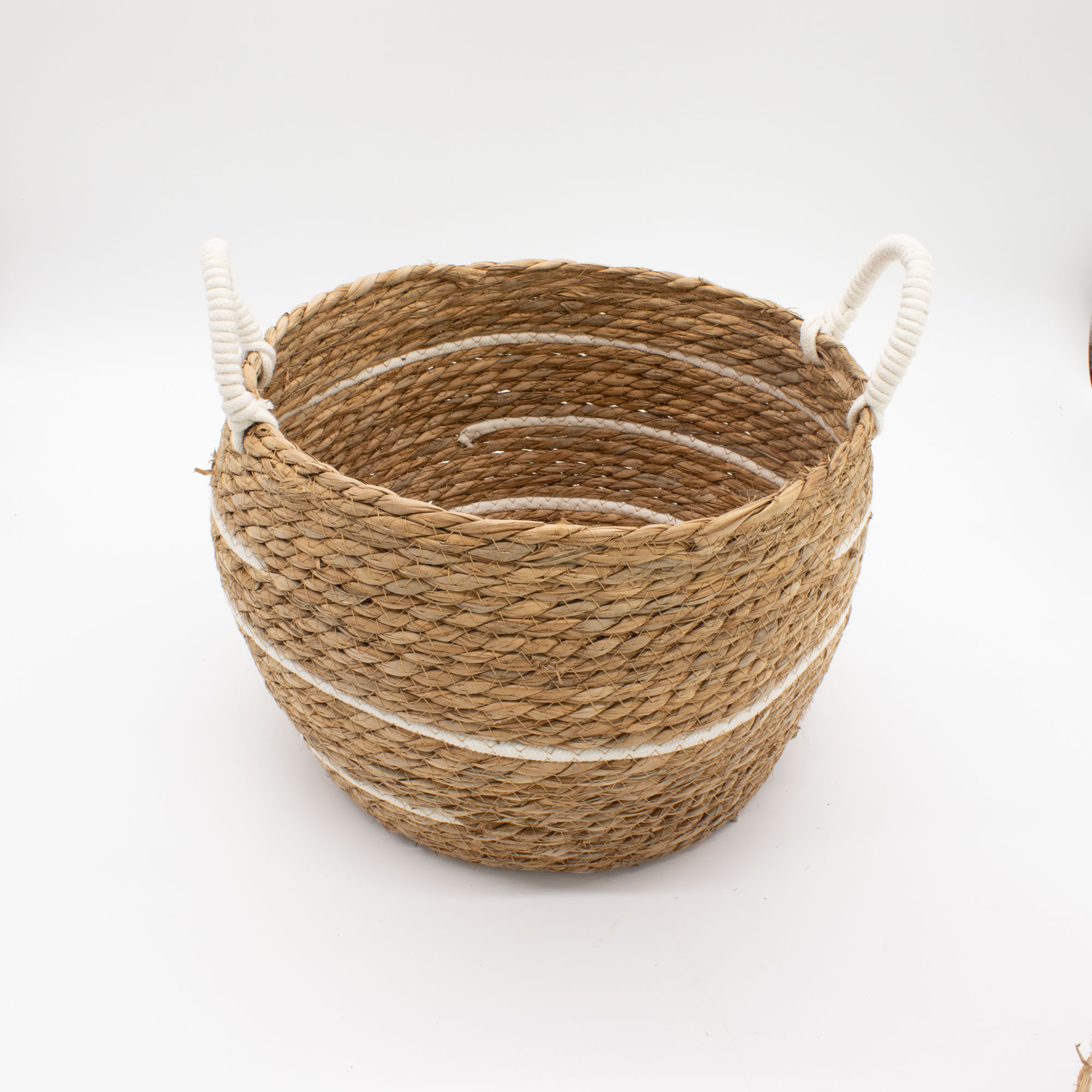 Ten imponujący zestaw trzech koszy to idealne połączenie surowej trawy morskiej i miękkich, białych splotów bawełnianych, które tworzą lekkie, poziome paski. Dzięki dużej pojemności i zaokrąglonym kształtom, produkty te są niezwykle pakowne i stabilne.