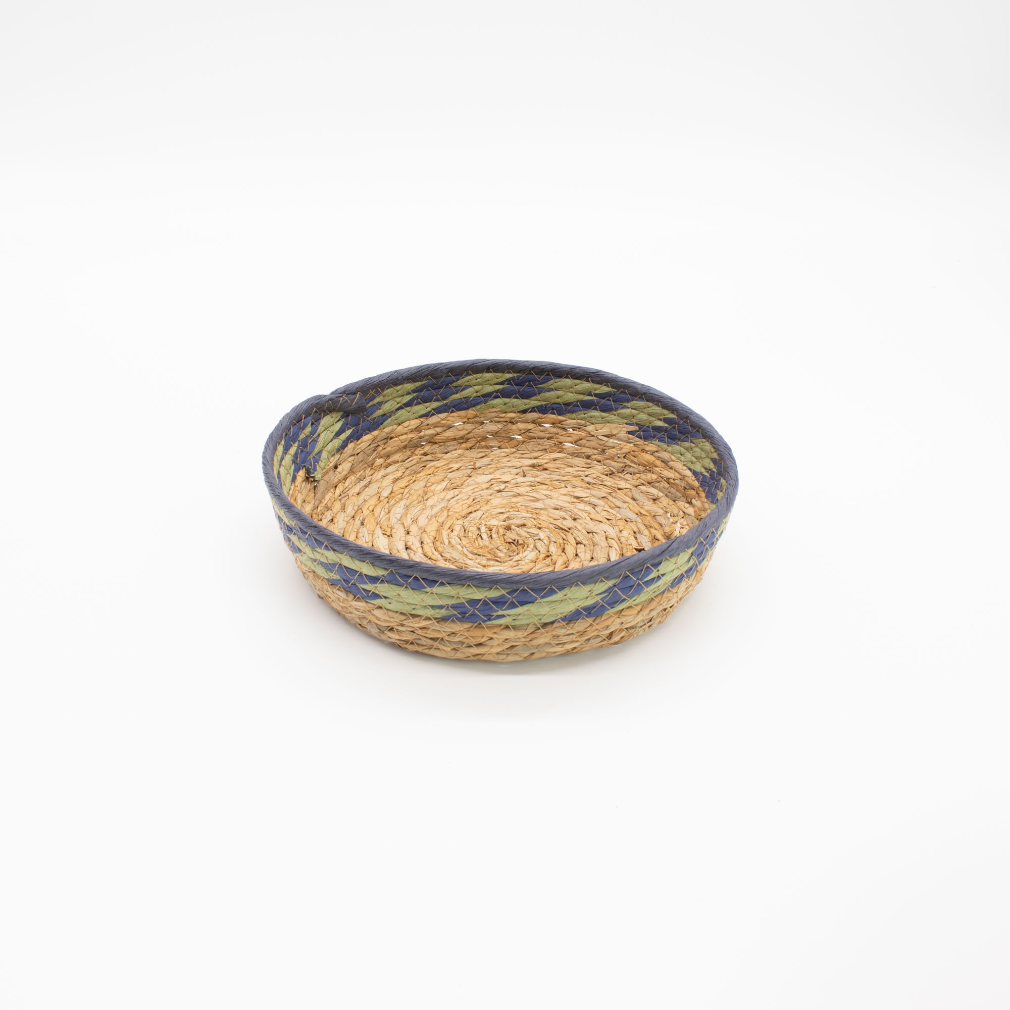 Zestaw trzech okrągłych tac to stylowy dodatek, który przyciąga wzrok unikalnym, geometrycznym wzorem w odcieniach głębokiego błękitu i stonowanej zieleni. Wykonane z naturalnej słomy i trawy morskiej, tace charakteryzują się niskim profilem i zwartym splotem, co czyni je niezwykle stabilnymi.