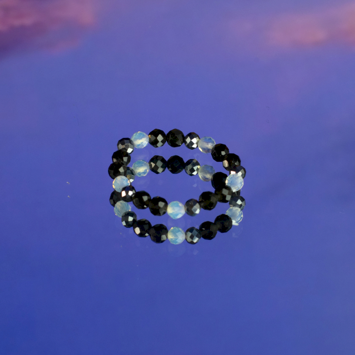 Kamień księżycowy wnosi subtelny blask i eteryczność, obsydian dodaje głębi oraz kontrastu, a ametyst wprowadza delikatny akcent koloru. Każdy pierścionek zachowuje własną wyrazistość, a noszone razem tworzą harmonijną, kosmiczną kompozycję inspirowaną energią księżyca.