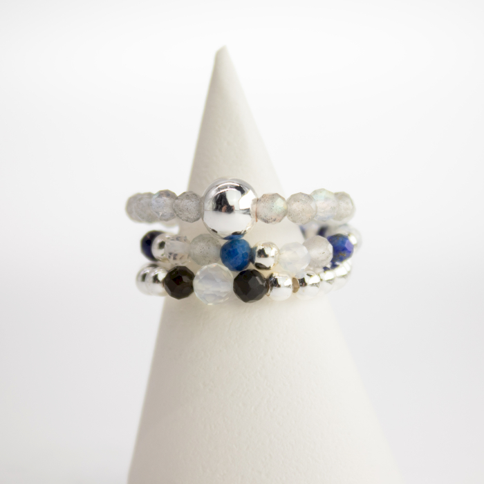 Każdy pierścionek odzwierciedla inny nastrój — od głębokich błękitów lapis lazuli, przez opalizujący połysk labradorytu i opalitu, po chłodną przejrzystość fluorytu oraz kontrastową głębię obsydianu. Noszone razem tworzą warstwowy, ekspresyjny efekt, który pozostaje spójny i przemyślany.