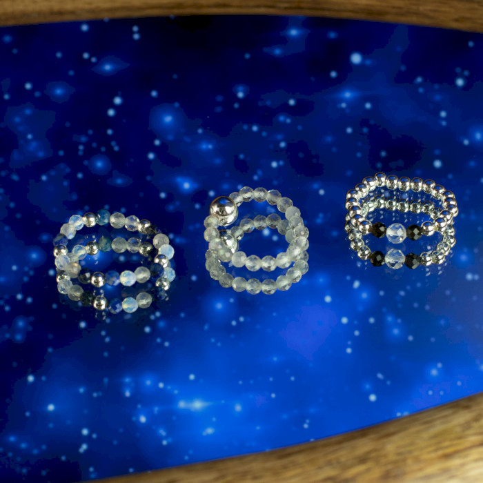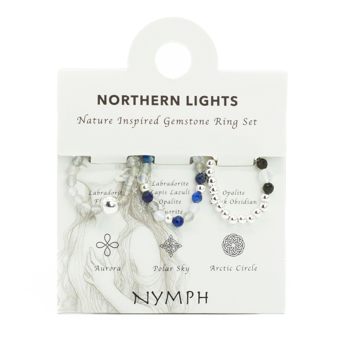 Zestaw Pierścionków Nymph – Zorza Polarna oddaje ruch, światło i zmienność zorzy polarnej, łącząc lapis lazuli, labradoryt, opalit, fluoryt oraz czarny obsydian. Zestaw wyróżnia się dynamiczną paletą barw i subtelną grą refleksów, tworząc kompozycję o wyrazistym, lecz wyważonym charakterze.