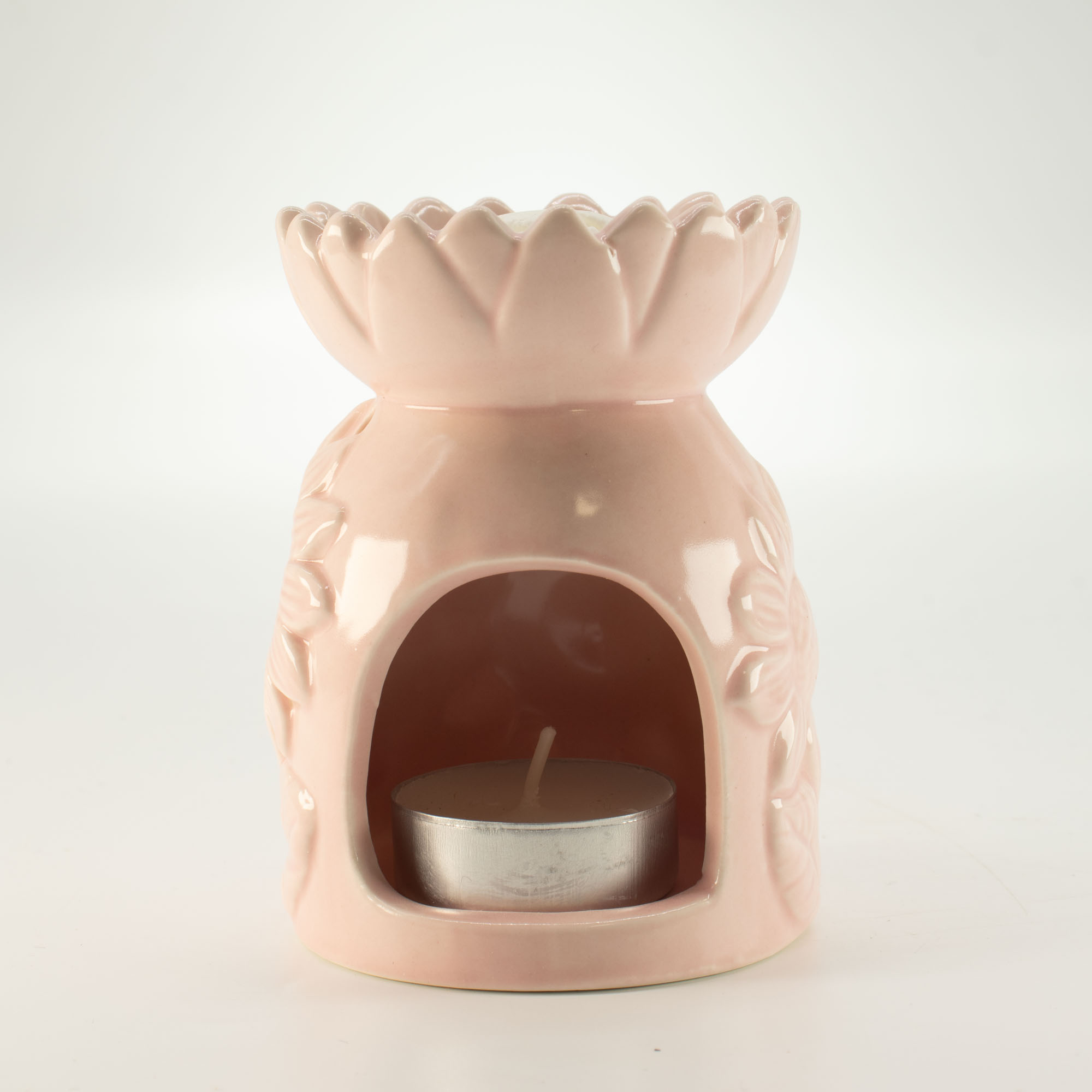 Prezentowany kominek ceramiczny to połączenie subtelnej estetyki z praktycznym zastosowaniem w aromaterapii. Produkt został wykonany z ceramiki pokrytej lśniącym szkliwem w delikatnym, pastelowym odcieniu różu, który nadaje mu wyjątkowo kobiecego i ciepłego charakteru. Ścianki naczynia zdobi precyzyjne, wypukłe tłoczenie przedstawiające motyw słoneczników, co czyni kominek nie tylko przyborem użytkowym, ale również efektownym elementem dekoracyjnym. Górną część wieńczy ozdobna misa w kształcie rozkwitającego kwiatu, zaprojektowana tak, aby bezpiecznie pomieścić ulubione woski zapachowe lub olejki eteryczne.