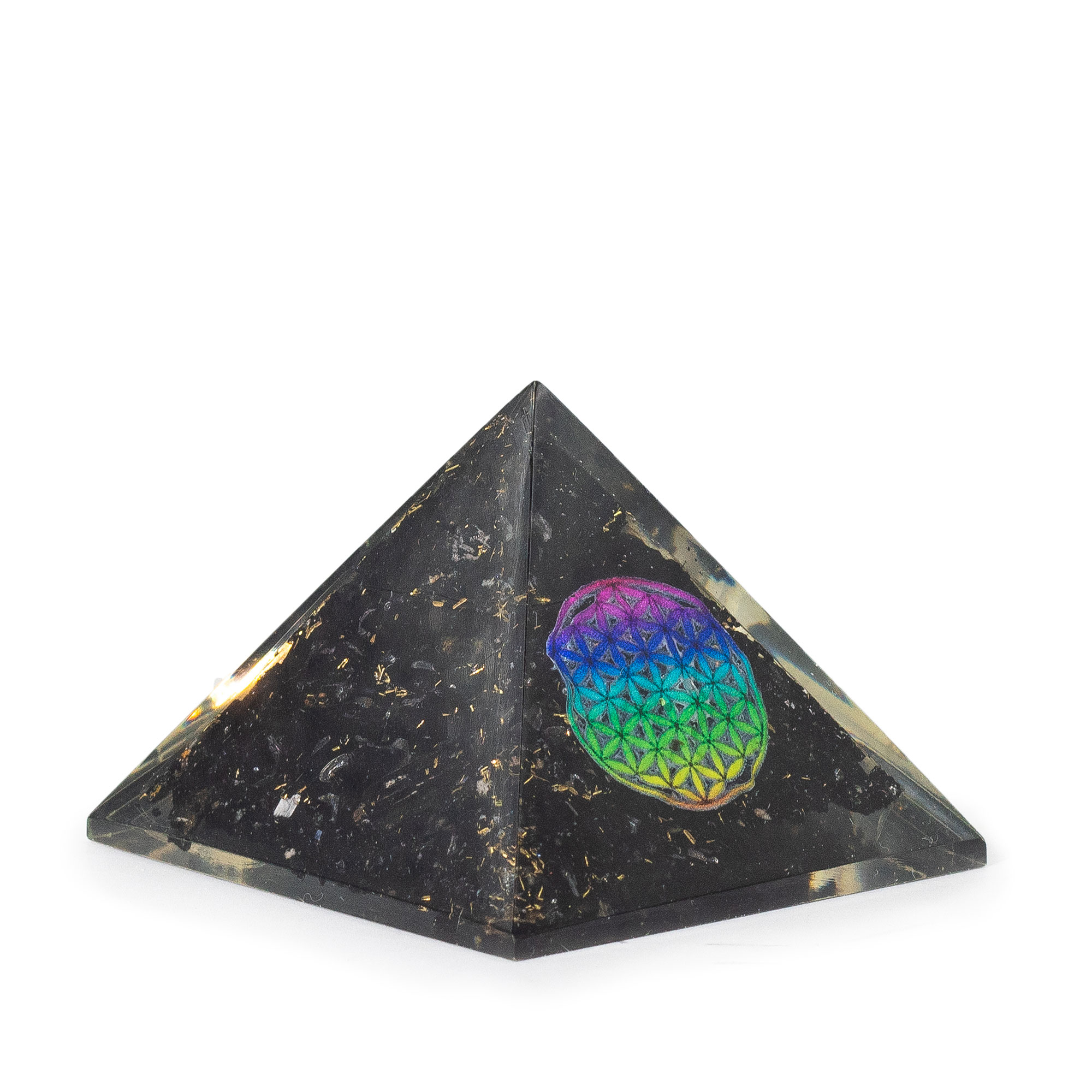 Mała piramida orgonitowa o wymiarach około 5,5 × 4,5 cm, ozdobiona symbolem Kwiatu Życia i wypełniona drobnymi kawałkami czarnego turmalinu. To estetyczny i energetyczny przedmiot, który łączy w sobie piękno naturalnych minerałów z właściwościami orgonitu – kompozycji żywicy, metalu i kamieni uważanej za harmonizującą energię otoczenia.