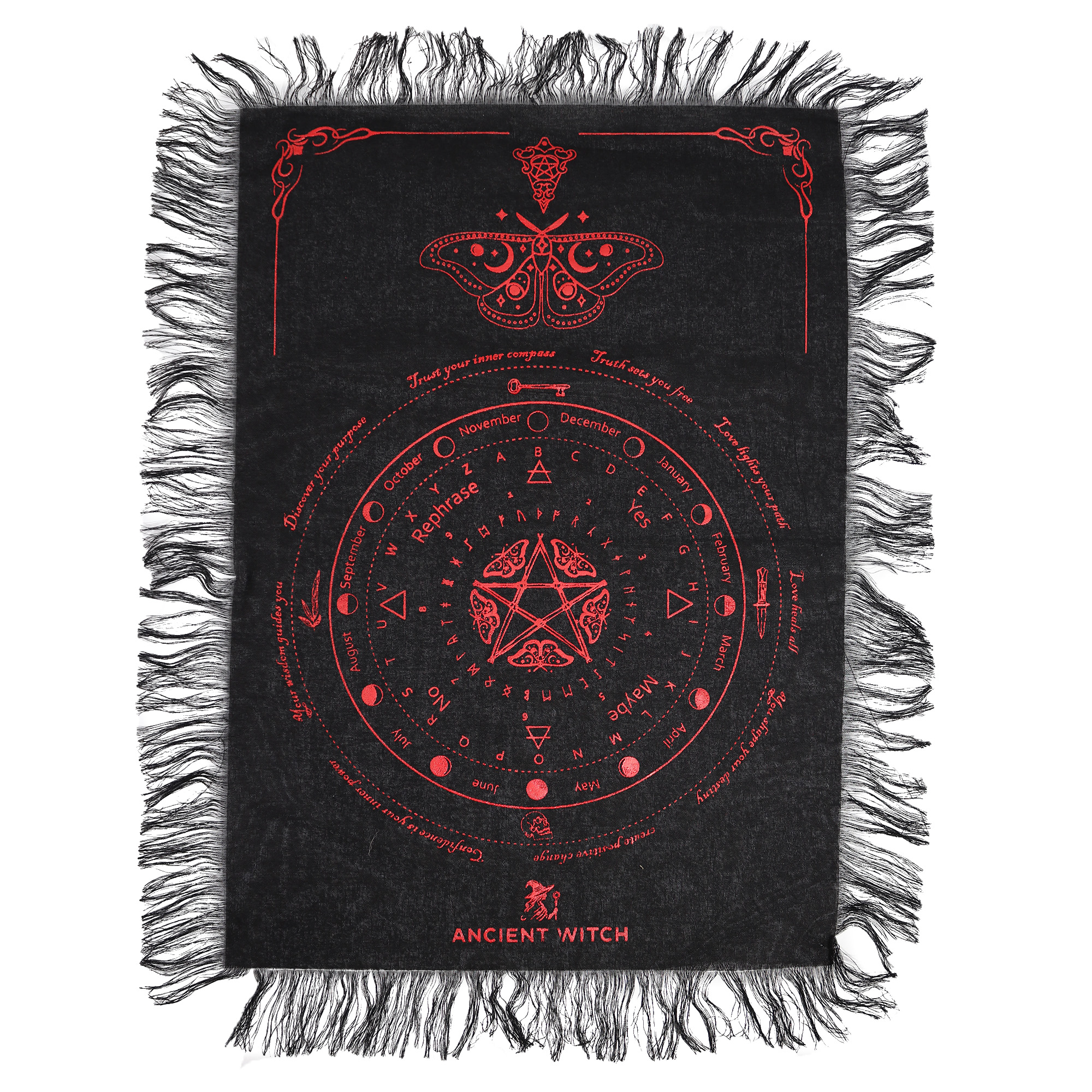 Centralna grafika ćmy, symbolizująca duszę i instynktowną nawigację w ciemności, dominuje nad bogato zdobioną matrycą. Układ tkaniny został zaprojektowany z myślą o kompleksowych odczytach – serce maty zajmuje pentagram, który otaczają litery alfabetu, starożytne runy oraz dedykowane pola odpowiedzi: „Yes”, „No”, „Maybe” i „Rephrase”. Dodatkowym atutem jest pierścień z nazwami miesięcy i fazami księżyca, umożliwiający precyzyjne osadzenie wróżby w czasie. Całość kompozycji dopełniają czarne frędzle.