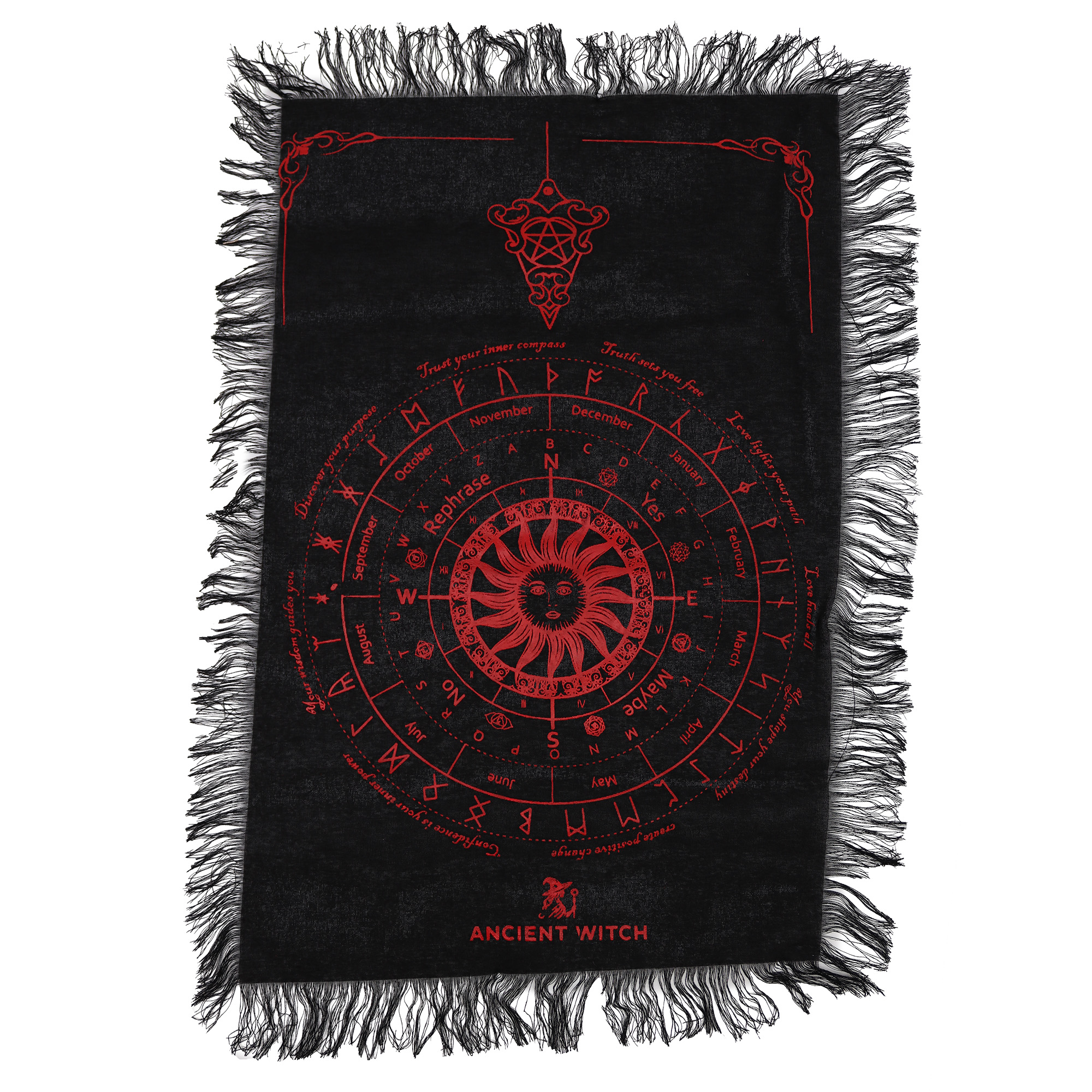 Projekt oferuje kompletną matrycę do zaawansowanych odczytów. Wokół spokojnego oblicza Słońca rozmieszczono koncentryczne kręgi zawierające alfabet, cyfry oraz klasyczne odpowiedzi dywinacyjne („Yes”, „No”, „Maybe”, „Rephrase”). Zewnętrzny pierścień, wzbogacony o nazwy miesięcy i starożytne runy, pozwala na precyzyjne osadzenie wróżby w czasie oraz pogłębienie interpretacji o dodatkowe aspekty symboliczne.