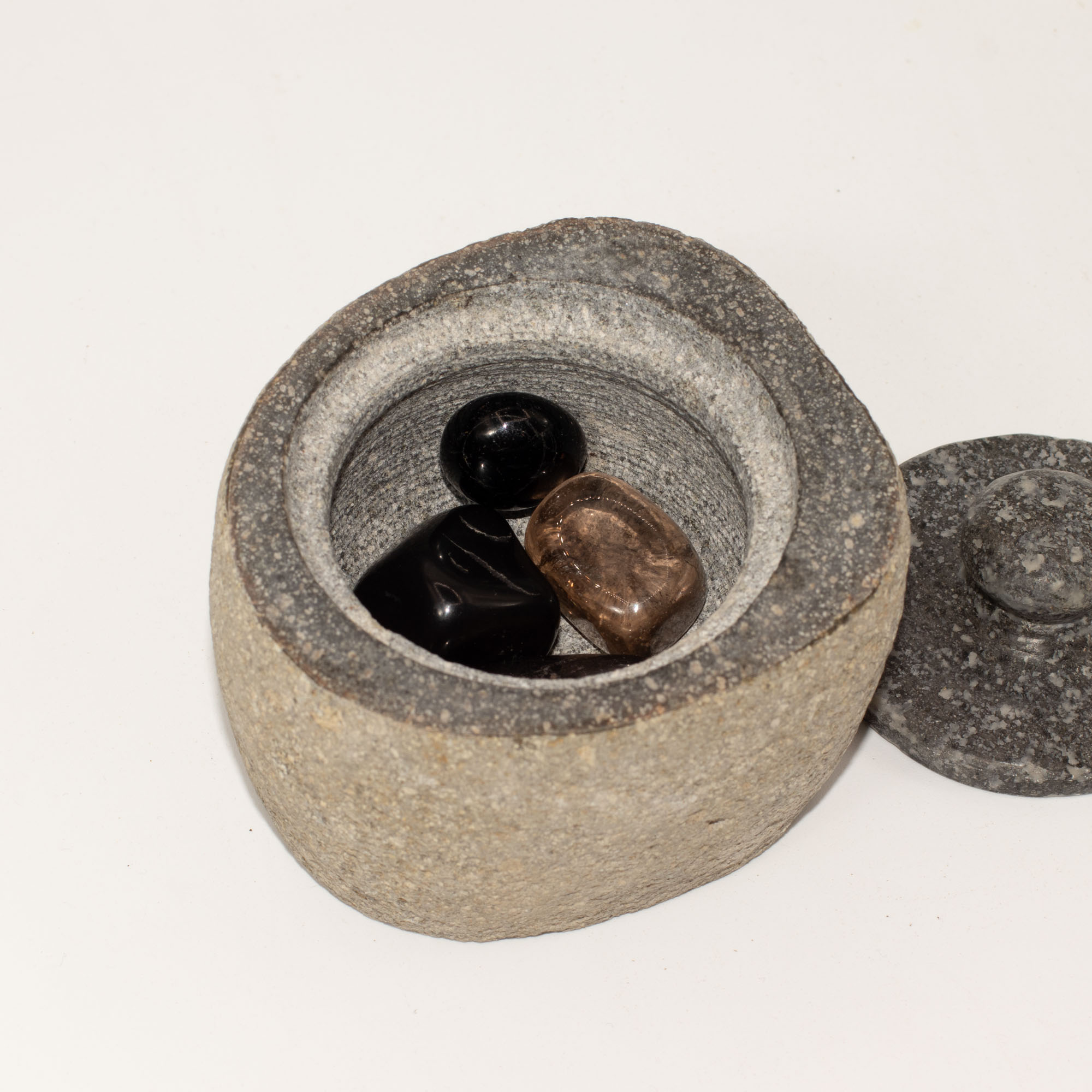Wnętrze pojemnika pozwala umieścić wybrane przez użytkownika kamienie, kryształy lub inne drobne przedmioty, tworząc osobisty punkt skupienia i ugruntowania. Dzięki naturalnemu ciężarowi i chłodnej fakturze kamienia, pojemnik działa również jako fizyczna „kotwica” do wyciszenia i koncentracji.