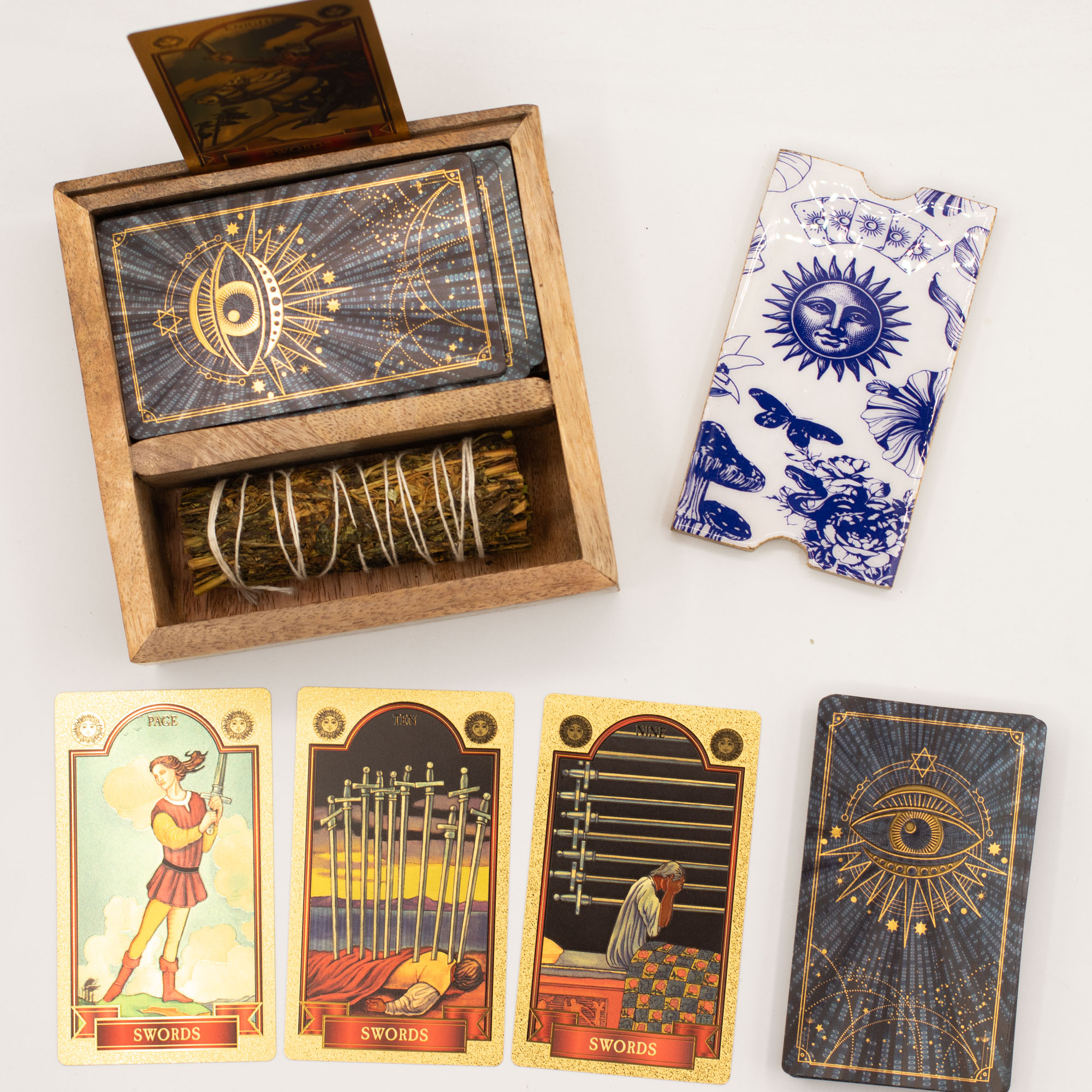 Zintegrowany uchwyt na karty umożliwia pionową ekspozycję wybranej karty w trakcie odczytu, czyniąc pudełko nie tylko elementem przechowywania, ale także praktycznym wsparciem podczas sesji tarota. Całość dopełnia dekoracyjna grafika, nadająca pudełku charakterystyczny, duchowy wyraz i wzmacniająca jego obecność wizualną na ołtarzu lub stanowisku pracy.