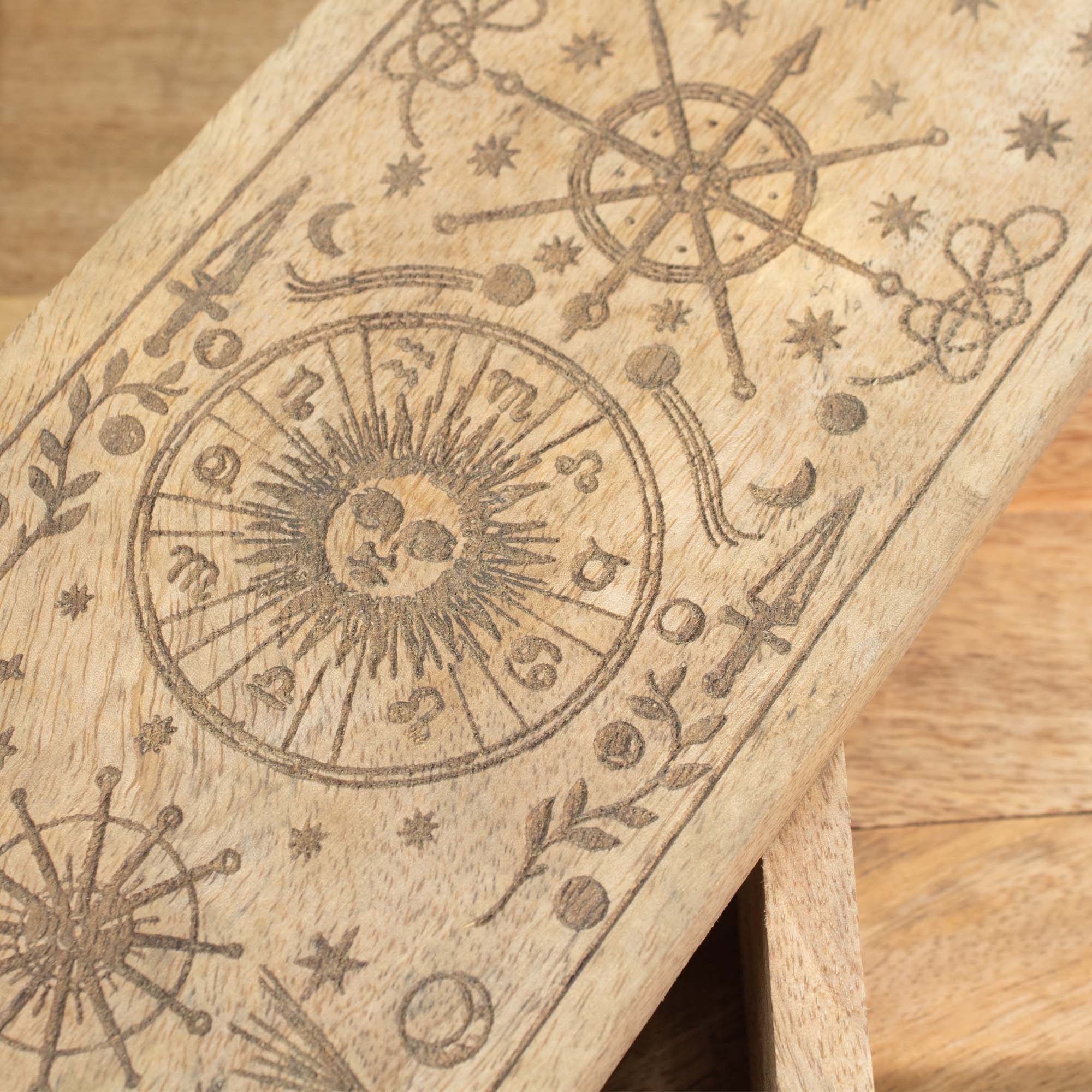 Po jednej stronie znajduje się główna przegródka na talię kart, chroniona pokrywką z eleganckim grawerowanym wzorem, który nadaje pudełku wyjątkowy, dekoracyjny charakter. Po drugiej stronie umieszczono mniejsze przegródki, idealne do przechowywania akcesoriów takich jak kryształy, karty pomocnicze, kadzidła, wahadełko lub drobne przedmioty rytualne.